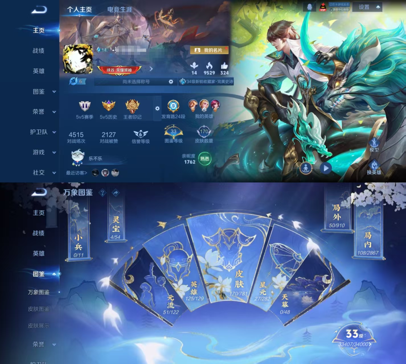 贵族等级:v7皮肤数:309传说品质15 生肖限定4 情人节限定1 荣耀典藏2 英雄数:127
