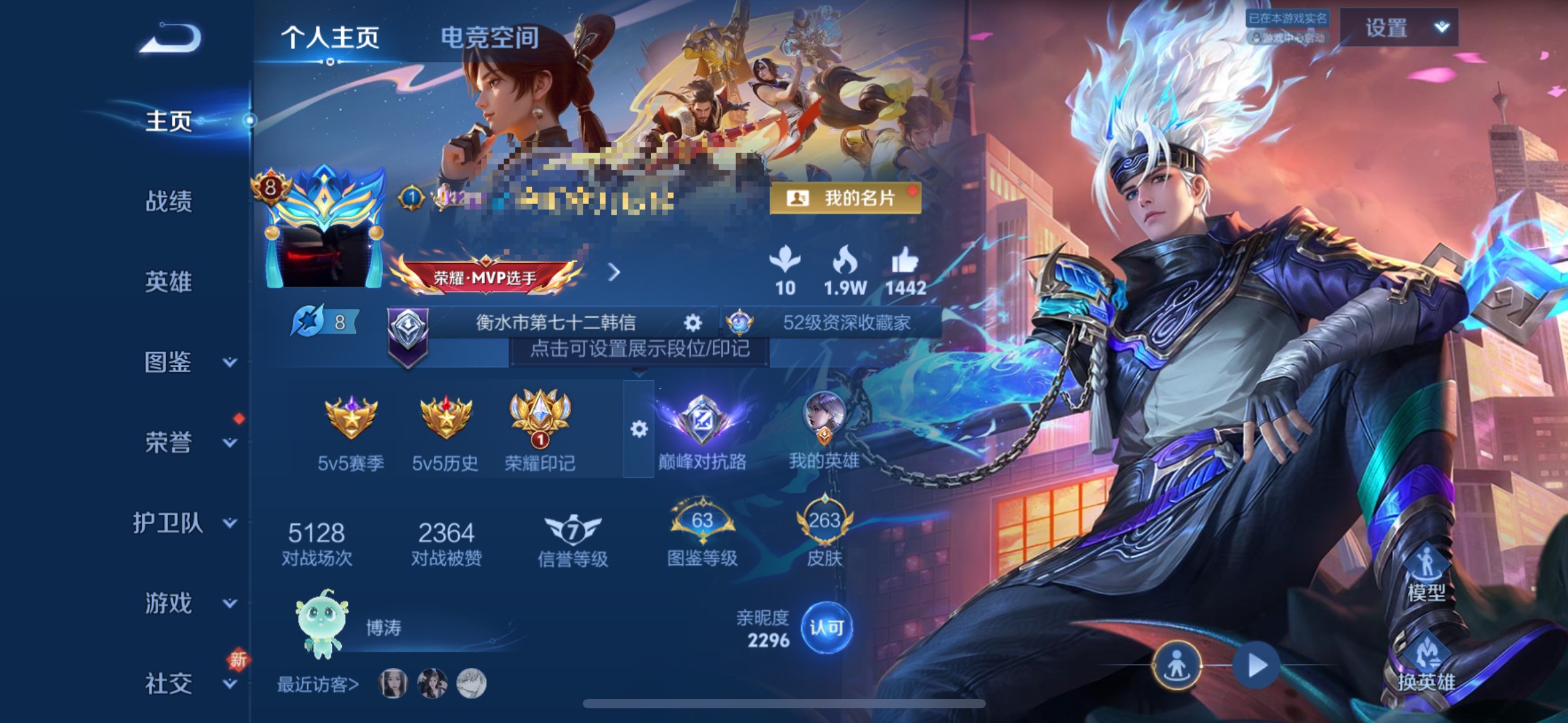 贵族等级:v8皮肤数:263传说品质19 情人节限定1 珍品传说1 生肖限定1 荣耀典藏1 英雄数:124