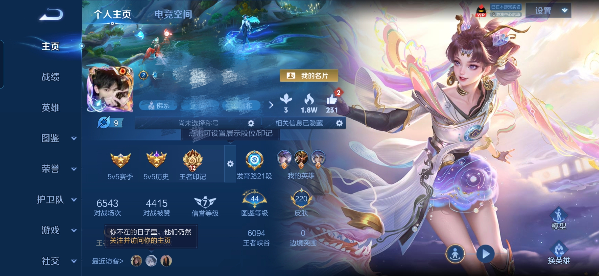贵族等级:v7皮肤数:231传说品质5 情人节限定2 生肖限定1 荣耀典藏1 英雄数:123