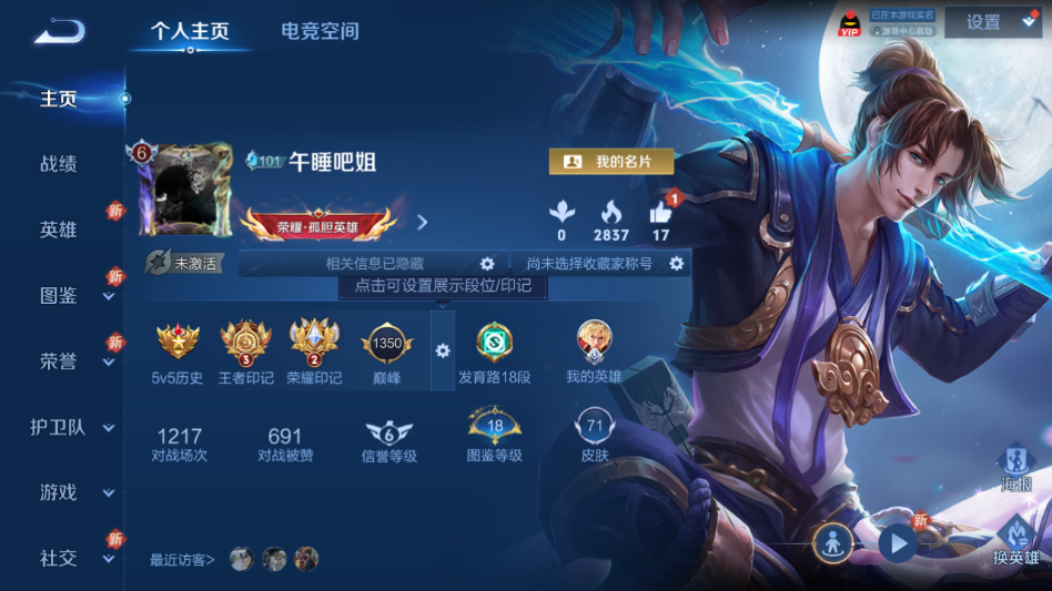 贵族等级:v8皮肤数:71传说品质10 生肖限定6 珍品传说2 情人节限定1 英雄数:79