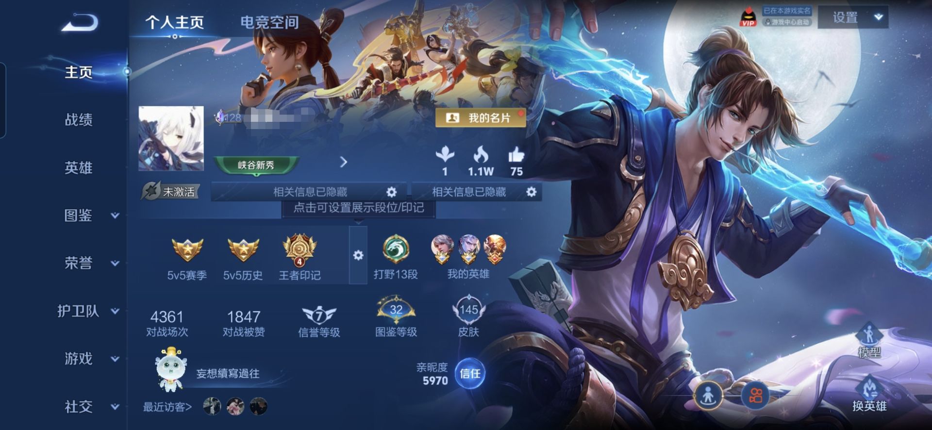 贵族等级:v5皮肤数:145情人节限定1 传说品质1 英雄数:123