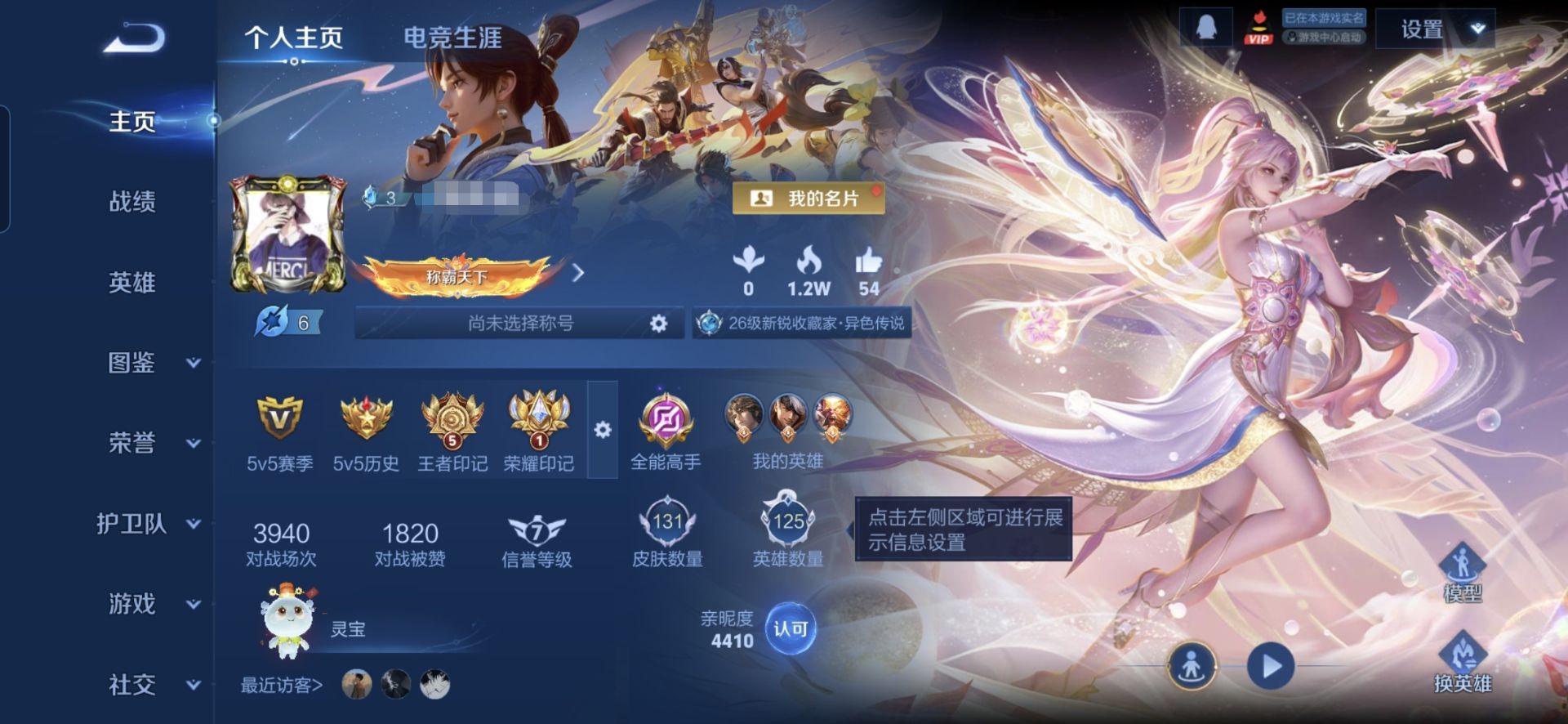 贵族等级:v5皮肤数:131生肖限定3 情人节限定1 传说品质5 英雄数:125