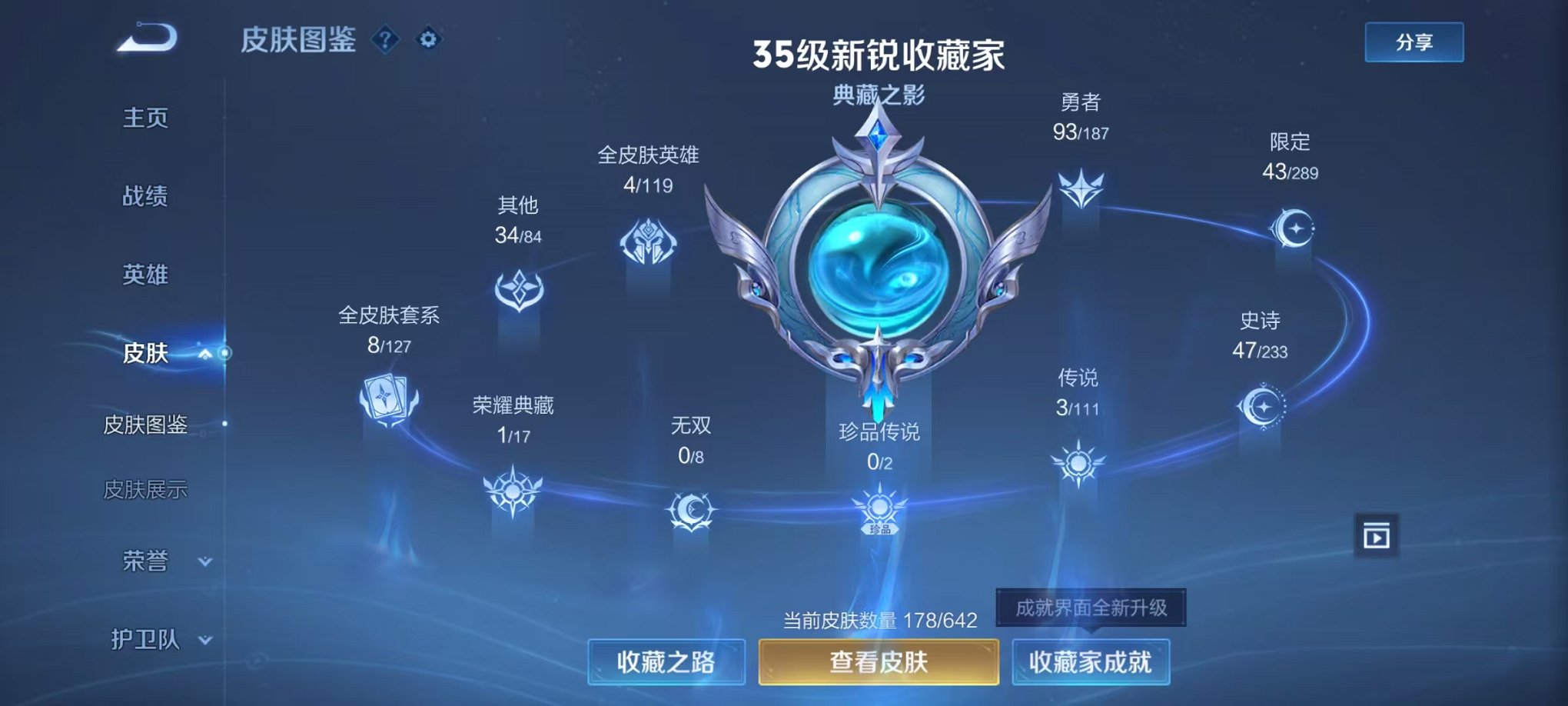 贵族等级:v7皮肤数:247传说品质4 生肖限定4 珍品传说2 英雄数:123