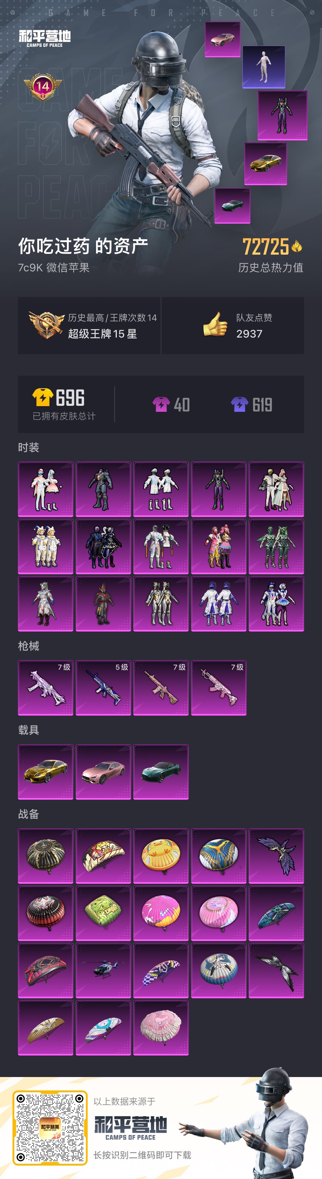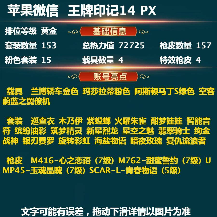 贵族等级:v10皮肤数:414勇者品质148 赛季限定34 限定154 史诗品质115 周年限定8 中华曲艺2 五五朋友节5 群星魔术团3 传说品质70 圣域传说4 活动专属17 青春校园3 战令限定26 贵族限定5 CP皮肤13 生肖限定16 地狱火3 五虎上将3 新春专属5 冰雪之歌3 KPL限定3 源梦皮肤5 FMVP8 归虚梦演5 胡桃异想国3 神州地方志2 珍品限定8 珍品传说2 未尽之器3 敦煌研究院2 宇宙歌姬1 五路精神5 太古仙侠传2 圣诞颂歌3 末日机甲2 情人节限定3 西部大镖客3 大话西游2 86版西游记5 神迹守卫1 时之奇旅5 超时空小队2 夏日海滩9 蔬菜精灵3 无双6 520限定4 音你4 琥珀纪元3 花嫁2 荣耀典藏3 荣耀中国节2 御龙在天2 百相守梦1 全民电竞2 乐园午夜3 至美风华2 冰雪奇缘2 奇趣潮玩3 魔法世界1 天文志(牛年限定)1 SNK系列1 古今物语2 世冠皮肤4 时之际遇2 成就限定1 信誉专属1 永宁纪1 美少女战士2 梦幻童话1 电玩狂想1 圆桌骑士1 五环荣耀2 珍宝阁专属2 妄想都市2 顽趣1 英雄数:123