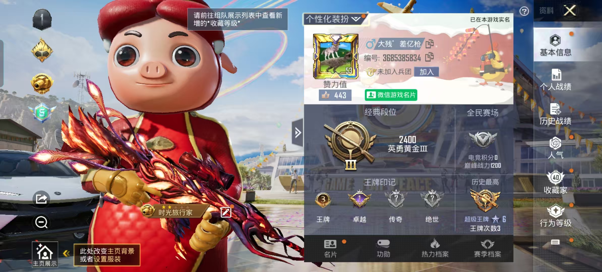 贵族等级:v8皮肤数:190勇者品质78 赛季限定15 限定56 史诗品质57 KPL限定1 传说品质14 圣域传说2 战令限定17 活动专属8 青春校园3 生肖限定2 新春专属3 周年限定3 冰雪之歌2 源梦皮肤4 归虚梦演1 神迹守卫1 荣耀典藏1 珍品限定2 名侦探柯南1 珍品传说2 CP皮肤5 圣诞颂歌2 西部大镖客2 情人节限定1 大话西游1 86版西游记2 夏日海滩5 奇趣潮玩2 五虎上将2 胡桃异想国1 御龙在天2 乐园午夜1 FMVP3 魔法世界1 SNK系列1 冰雪奇缘1 五五朋友节3 圆桌骑士1 百相守梦2 世冠皮肤2 末日机甲1 时之奇旅1 贵族限定4 成就限定1 信誉专属1 电玩狂想1 五环荣耀1 五路精神1 珍宝阁专属1 荣耀中国节1 英雄数:122
