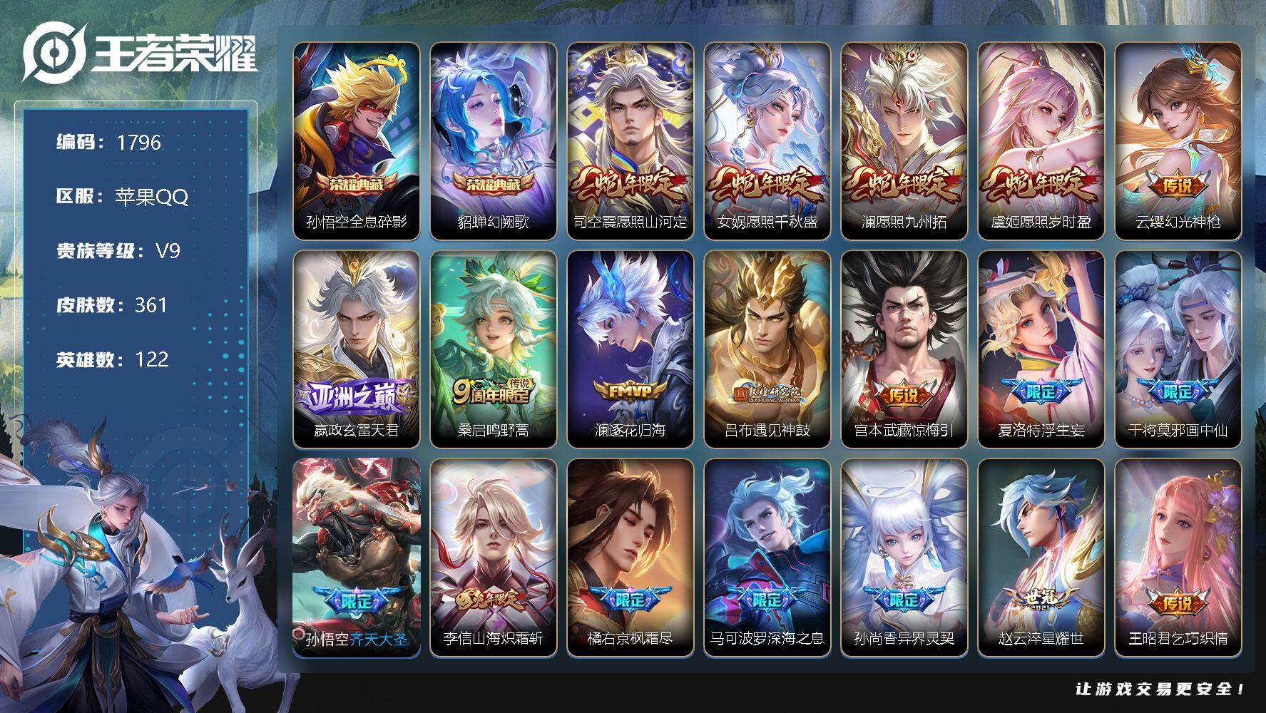 贵族等级:v5皮肤数:94勇者品质48 赛季限定6 限定19 新春专属2 史诗品质19 活动专属7 星界纪事1 KPL限定1 西部大镖客1 战令限定4 神迹守卫1 冰雪之歌1 魔法世界1 御龙在天1 夏日海滩4 青春校园1 音你1 归虚梦演1 乐园午夜1 成就限定1 信誉专属1 传说品质3 周年限定1 草木风华1 CP皮肤1 大话西游1 生肖限定1 五环荣耀1 奇趣潮玩1 荣耀中国节1 贵族限定2 破界1 英雄数:113