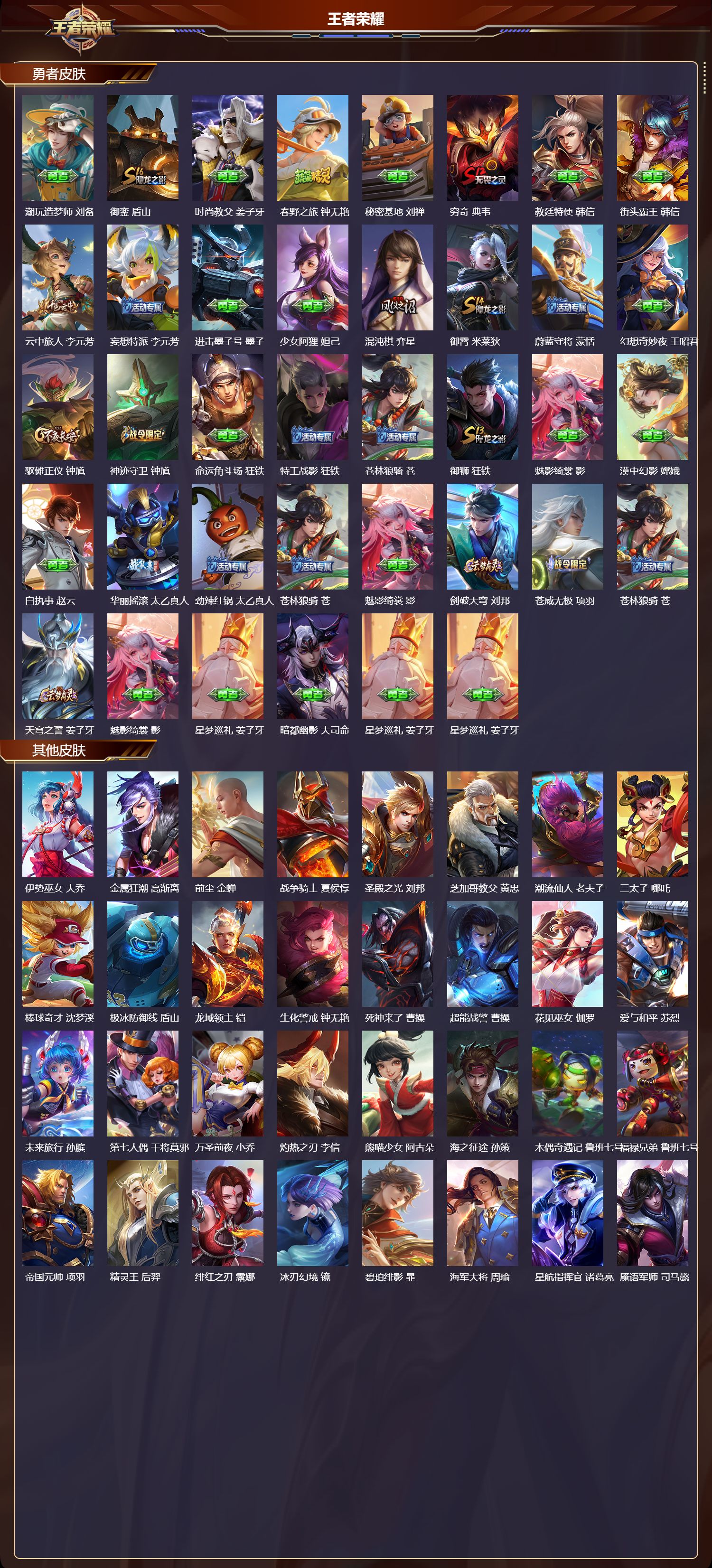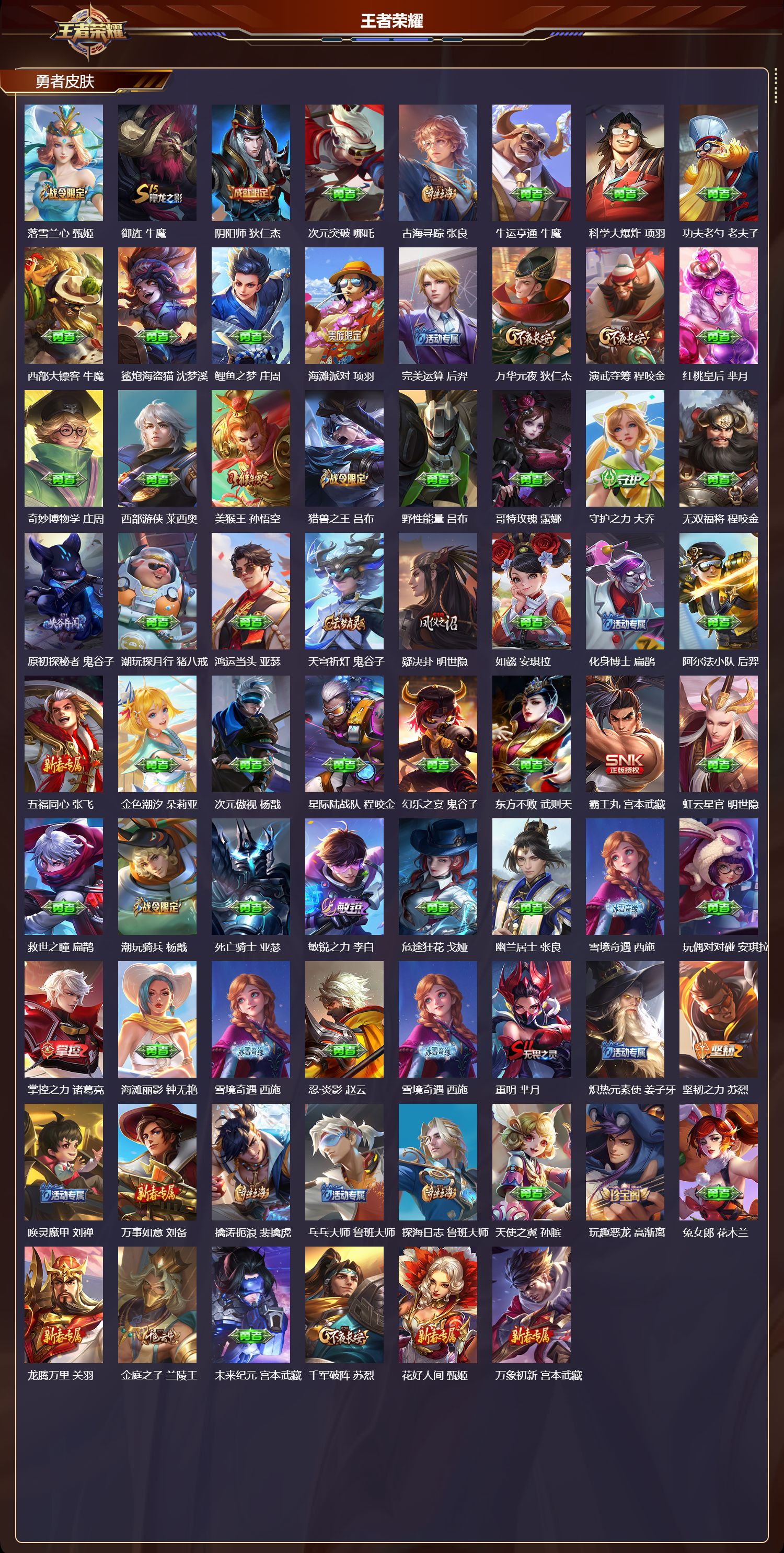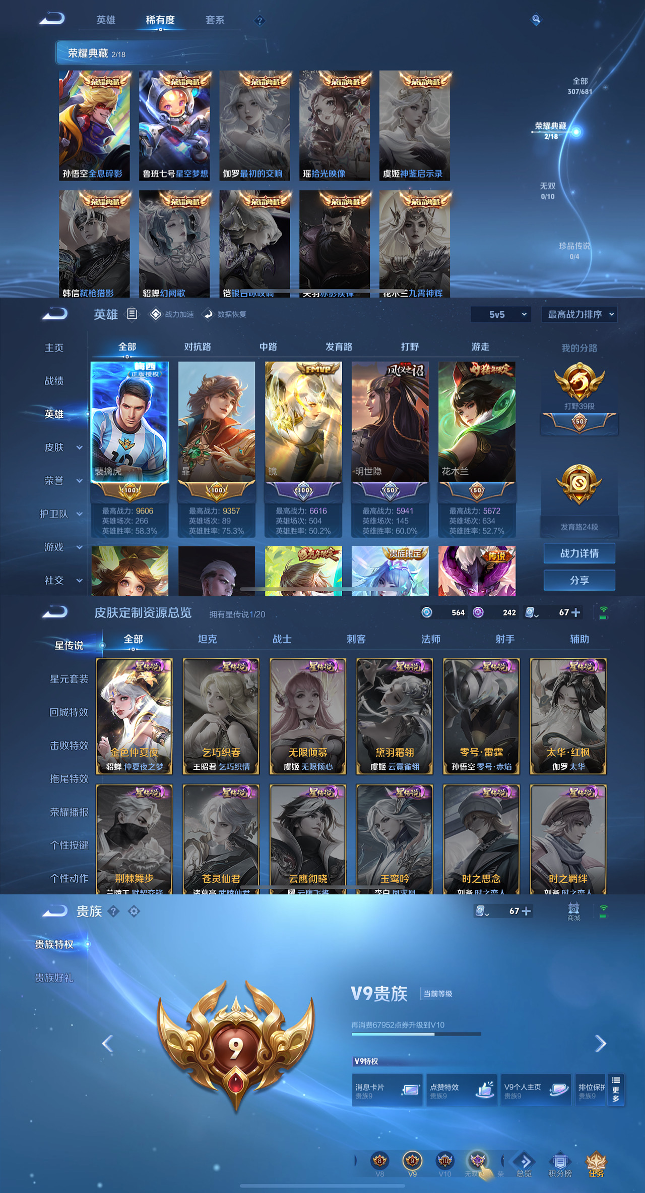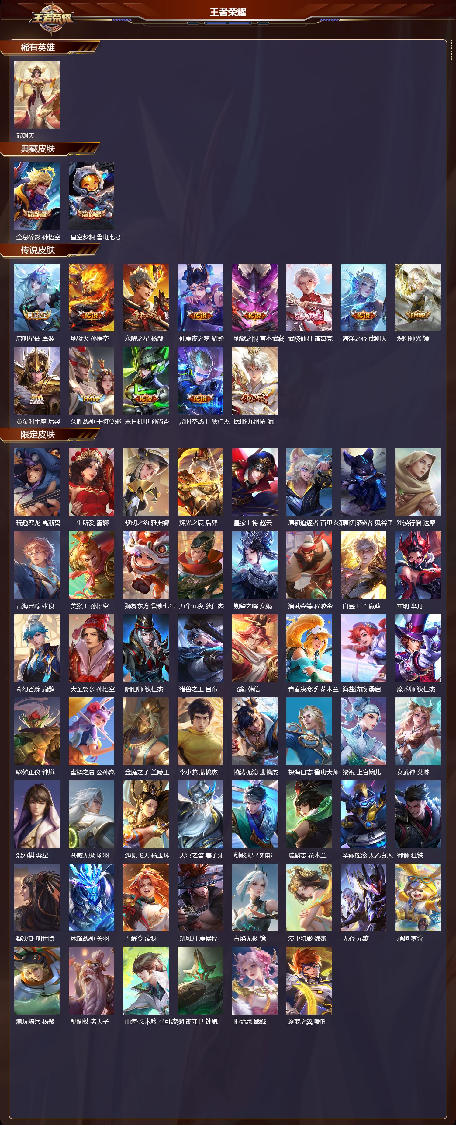 贵族等级:v6皮肤数:79勇者品质36 活动专属5 青春校园2 史诗品质27 限定30 周年限定5 敦煌研究院1 生肖限定1 赛季限定12 CP皮肤3 战令限定5 奇趣潮玩1 五路精神3 归虚梦演1 源梦皮肤2 五五朋友节1 圣诞颂歌1 音你1 珍宝阁专属1 夏日海滩3 荣耀典藏1 贵族限定3 成就限定1 信誉专属1 电玩狂想2 传说品质1 世冠皮肤1 五环荣耀1 英雄数:99