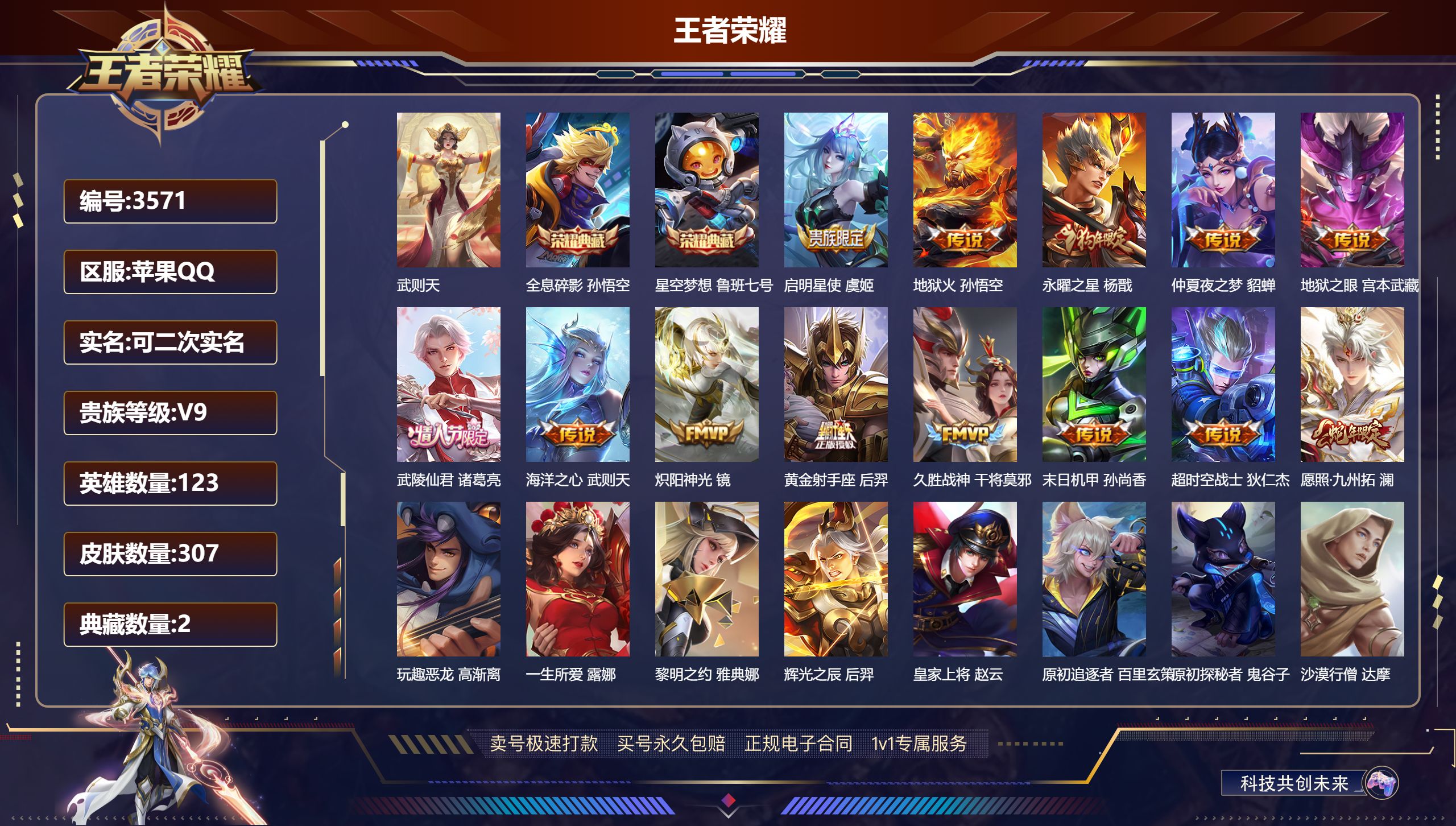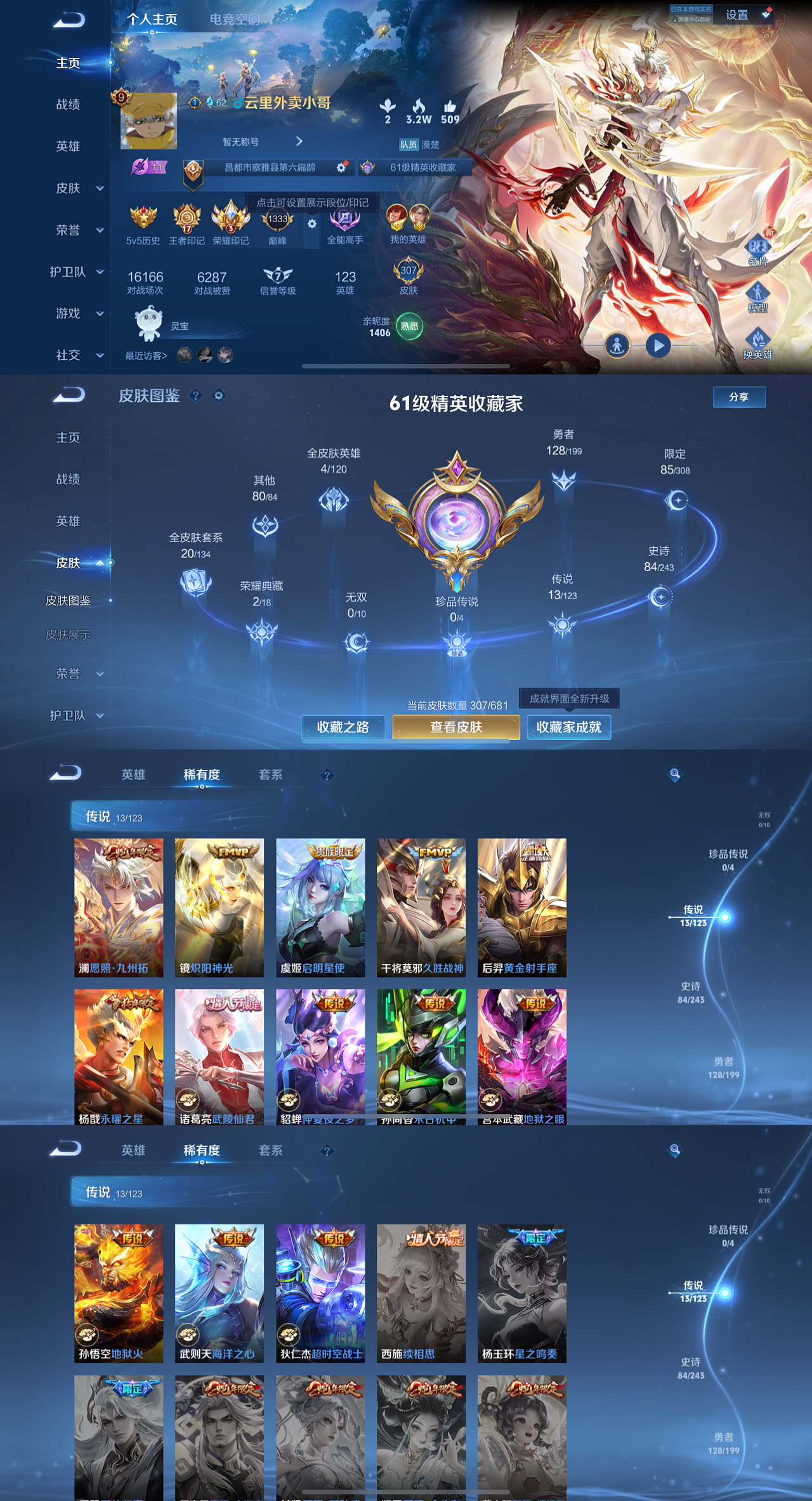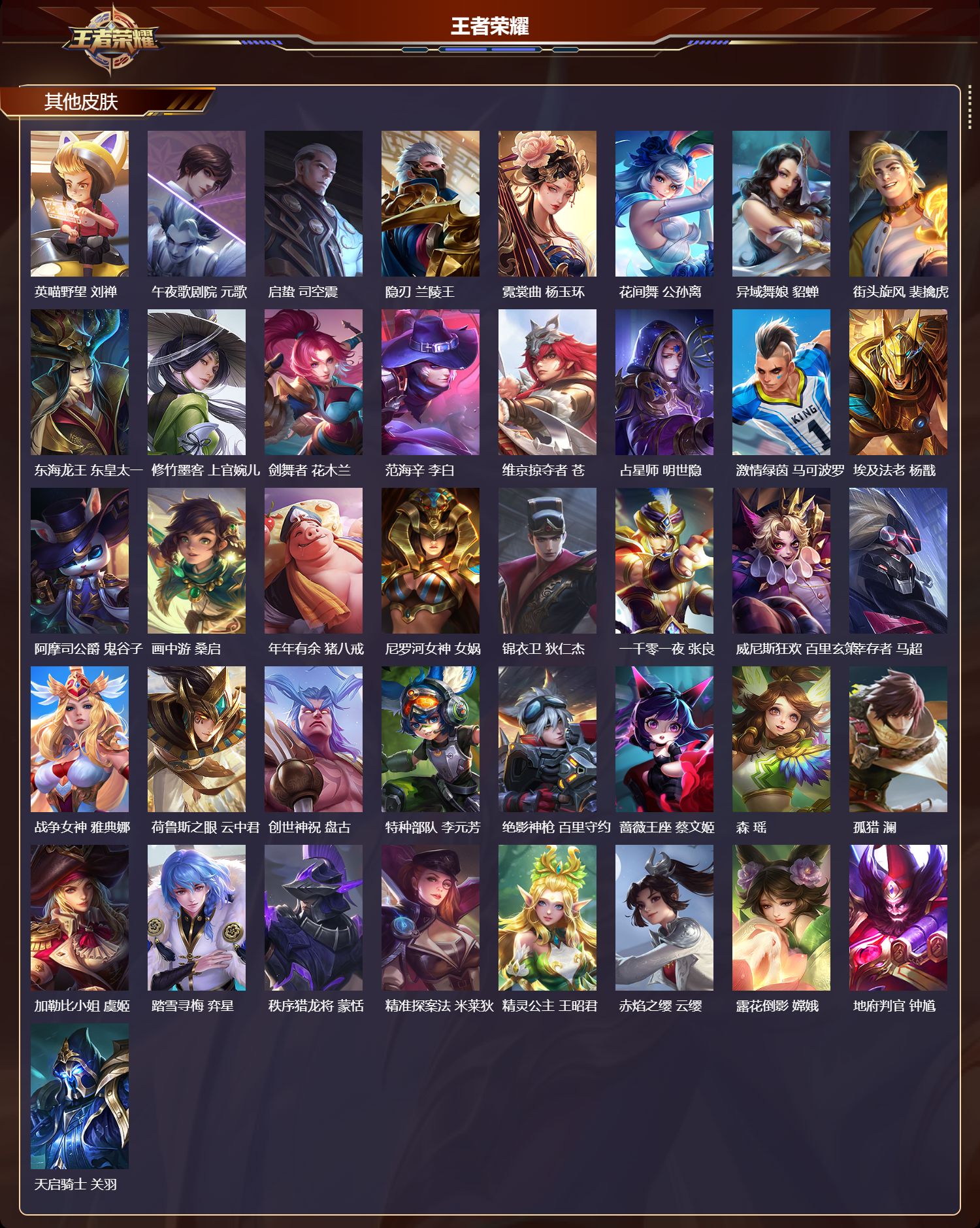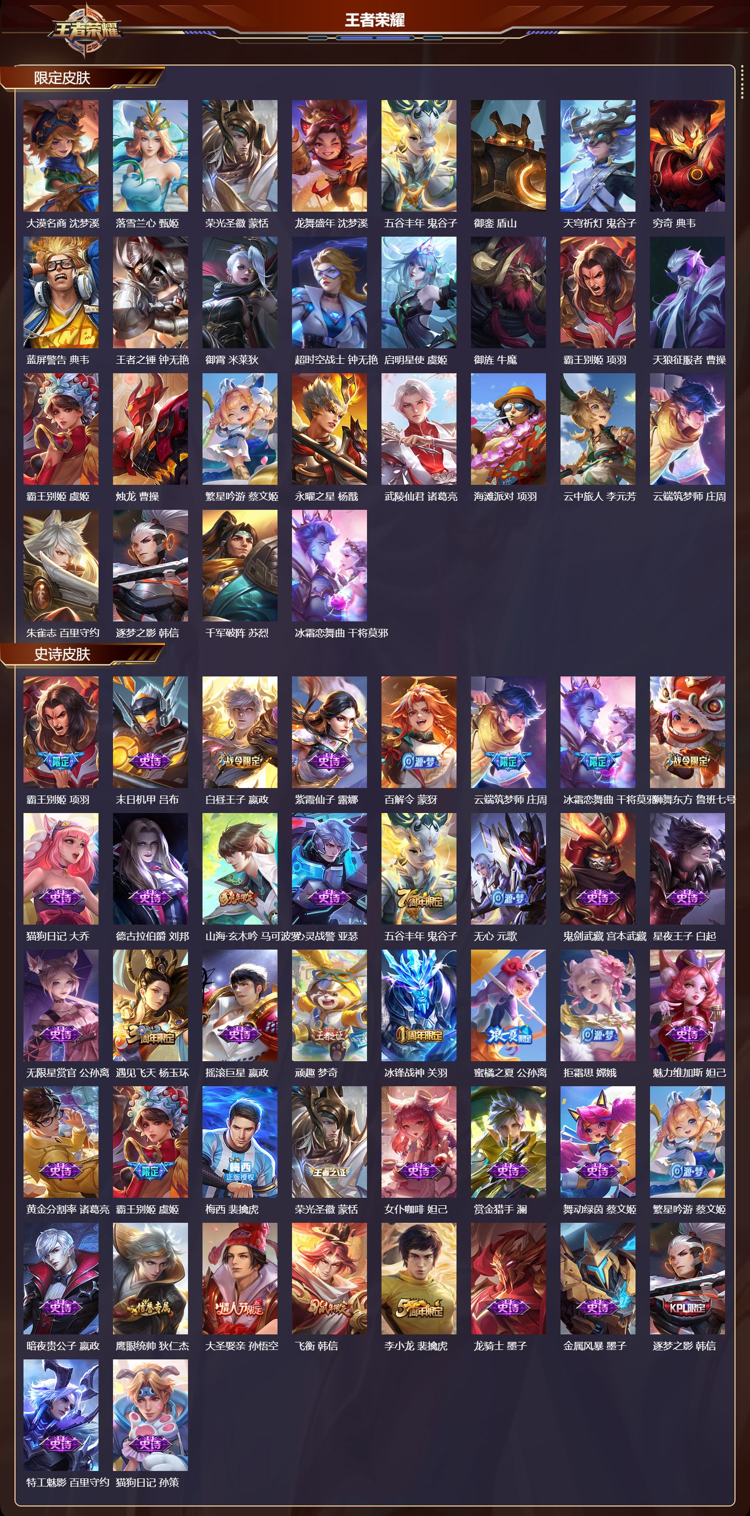 贵族等级:v6皮肤数:79勇者品质36 活动专属5 青春校园2 史诗品质27 限定30 周年限定5 敦煌研究院1 生肖限定1 赛季限定12 CP皮肤3 战令限定5 奇趣潮玩1 五路精神3 归虚梦演1 源梦皮肤2 五五朋友节1 圣诞颂歌1 音你1 珍宝阁专属1 夏日海滩3 荣耀典藏1 贵族限定3 成就限定1 信誉专属1 电玩狂想2 传说品质1 世冠皮肤1 五环荣耀1 英雄数:99
