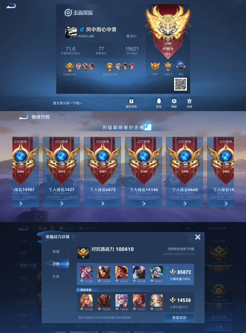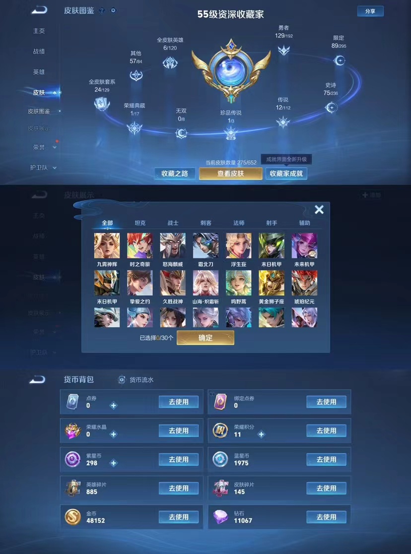 贵族等级:v8皮肤数:165勇者品质68 史诗品质63 限定58 永宁纪2 活动专属11 赛季限定13 战令限定20 CP皮肤6 地狱火2 新春专属3 源梦皮肤4 周年限定4 敦煌研究院1 传说品质11 圣诞颂歌2 末日机甲1 FMVP2 时之奇旅1 超时空小队1 夏日海滩4 王者之证2 胡桃异想国1 五路精神3 御龙在天2 冰雪之歌1 奇趣潮玩3 魔法世界1 五五朋友节5 圆桌骑士1 青春校园2 琥珀纪元1 生肖限定2 世冠皮肤1 珍宝阁专属1 归虚梦演1 顽趣1 乐园午夜1 贵族限定4 成就限定1 信誉专属1 电玩狂想2 草木风华1 蔬菜精灵2 荣耀典藏1 五环荣耀1 时之际遇1 百相守梦1 妄想都市1 破界1 五虎上将1 无双1 珍品限定1 群星魔术团1 英雄数:120