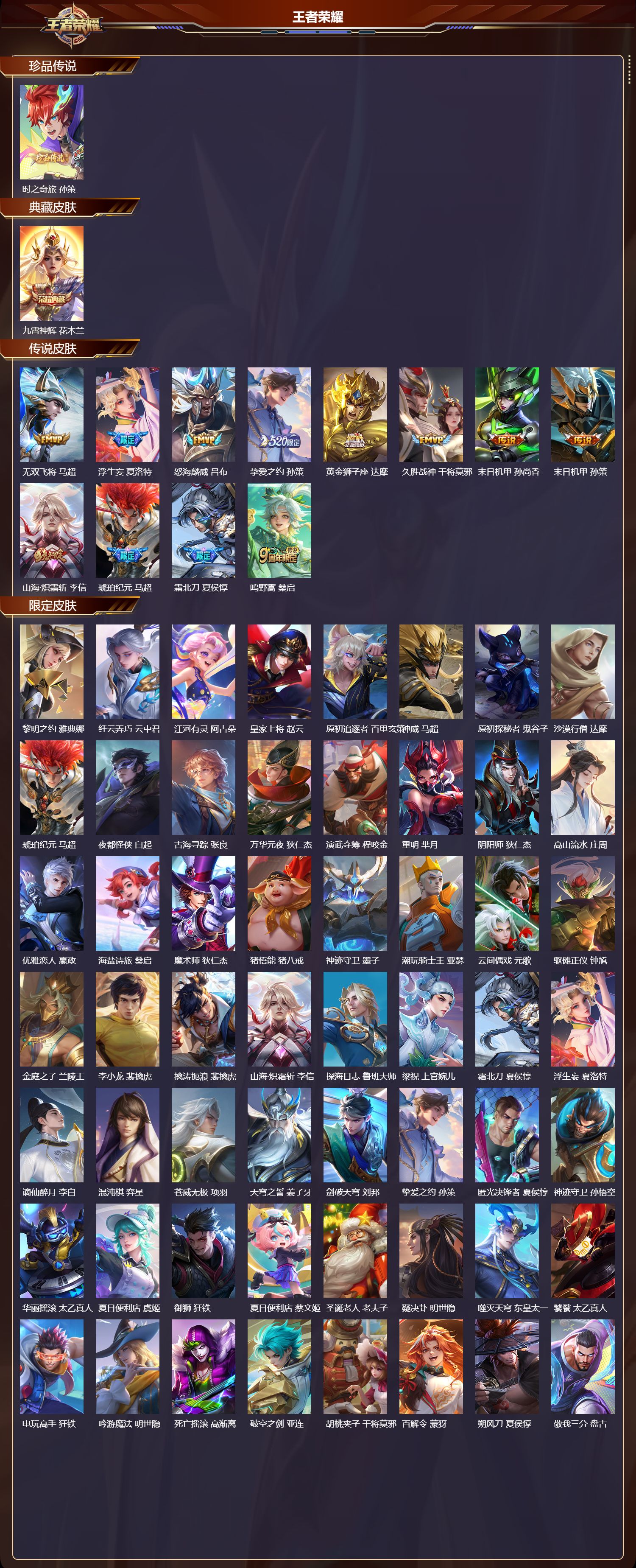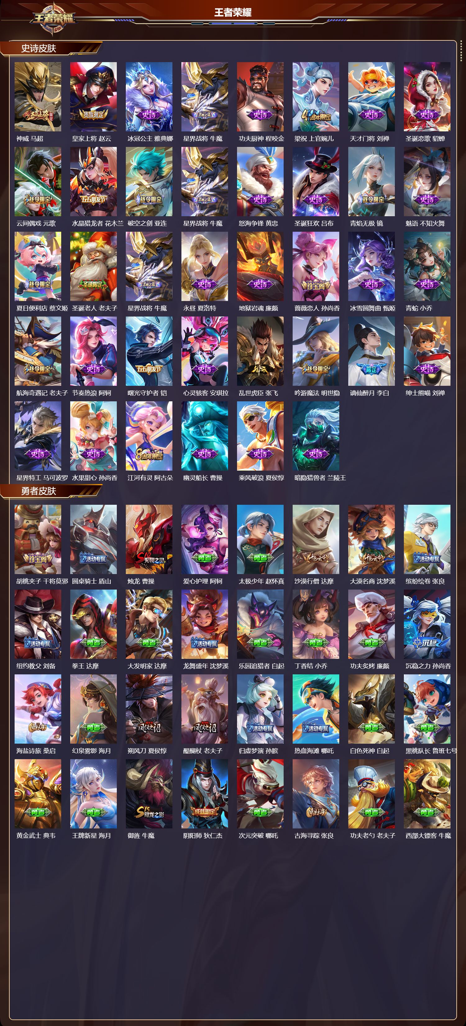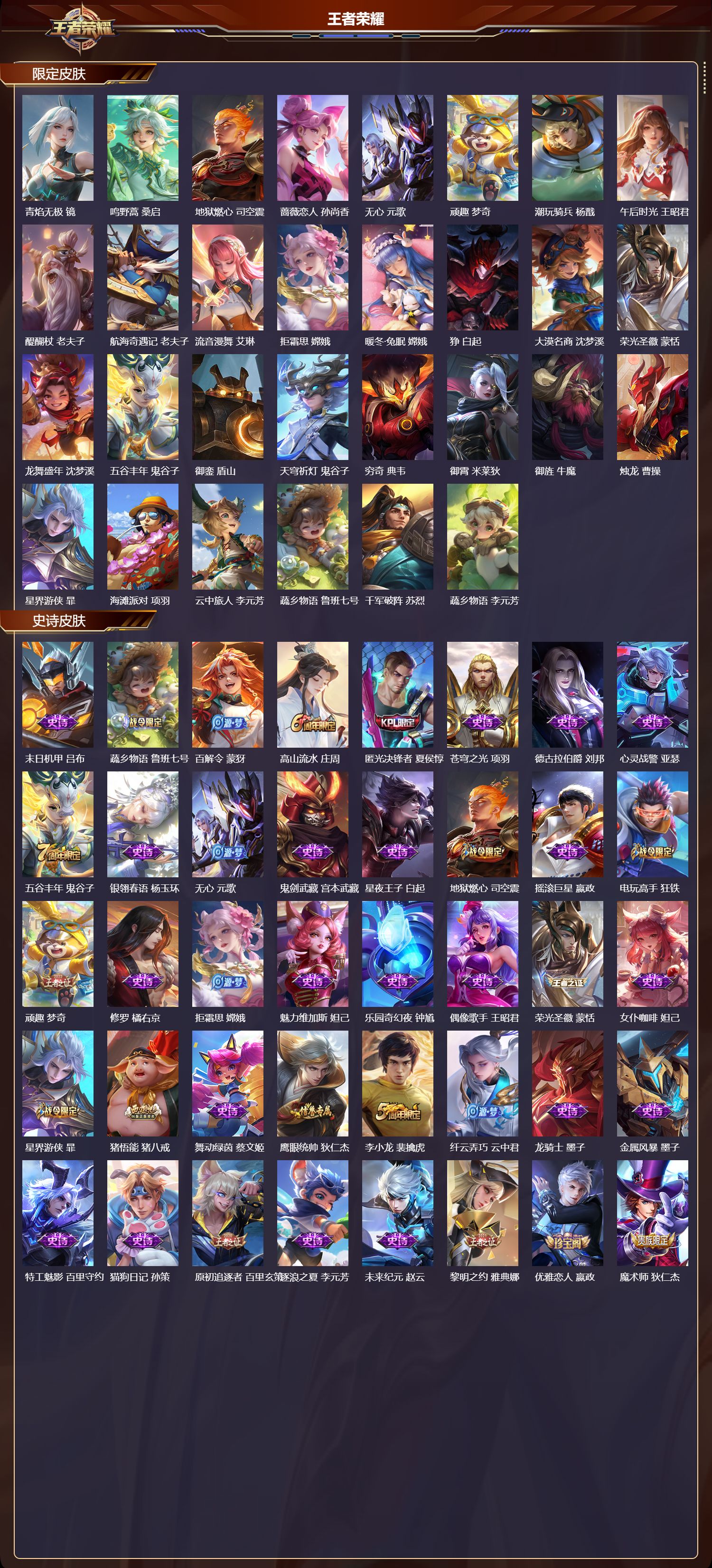 上官婉儿_神器·万象笔张良_古海寻踪艾琳_流音漫舞司空震_地狱燃心云中君_纤云弄巧蒙犽_百解令嫦娥_拒霜思嫦娥_暖冬·兔眠嫦娥_漠中幻影刘邦_剑破天穹杨玉环_遇见飞天兰陵王_金庭之子马可波罗_深海之息妲己_时之奇旅妲己_灵卜魔法钟无艳_超时空战士蒙恬_荣光圣徽蔡文姬_夏日便利店暃_星界游侠高渐离_燃音魔法甄姬_落雪兰心姜子牙_天穹之誓杨戬_潮玩骑兵戈娅_驭风魔法鬼谷子_天穹祈灯鬼谷子_五谷丰年元歌_无心西施_玲珑珍味镜_青焰无极伽罗_琥珀纪元李信_山海·炽霜斩孙尚香_蔷薇恋人曜_山海·苍雷引梦奇_顽趣达摩_沙漠行僧狄仁杰_魔术师狄仁杰_阴阳师狄仁杰_神器·狴犴令桑启_海盐诗旅桑启_鸣野蒿扁鹊_奇幻香踪沈梦溪_大漠名商沈梦溪_龙舞盛年鲁班七号_蔬乡物语虞姬_启明星使虞姬_夏日便利店鲁班大师_探海日志刘备_百相守梦狂铁_电玩高手李元芳_云中旅人李元芳_蔬乡物语王昭君_午后时光阿古朵_江河有灵项羽_海滩派对项羽_苍威无极裴擒虎_擒涛扼浪赵云_皇家上将赵云_龙胆