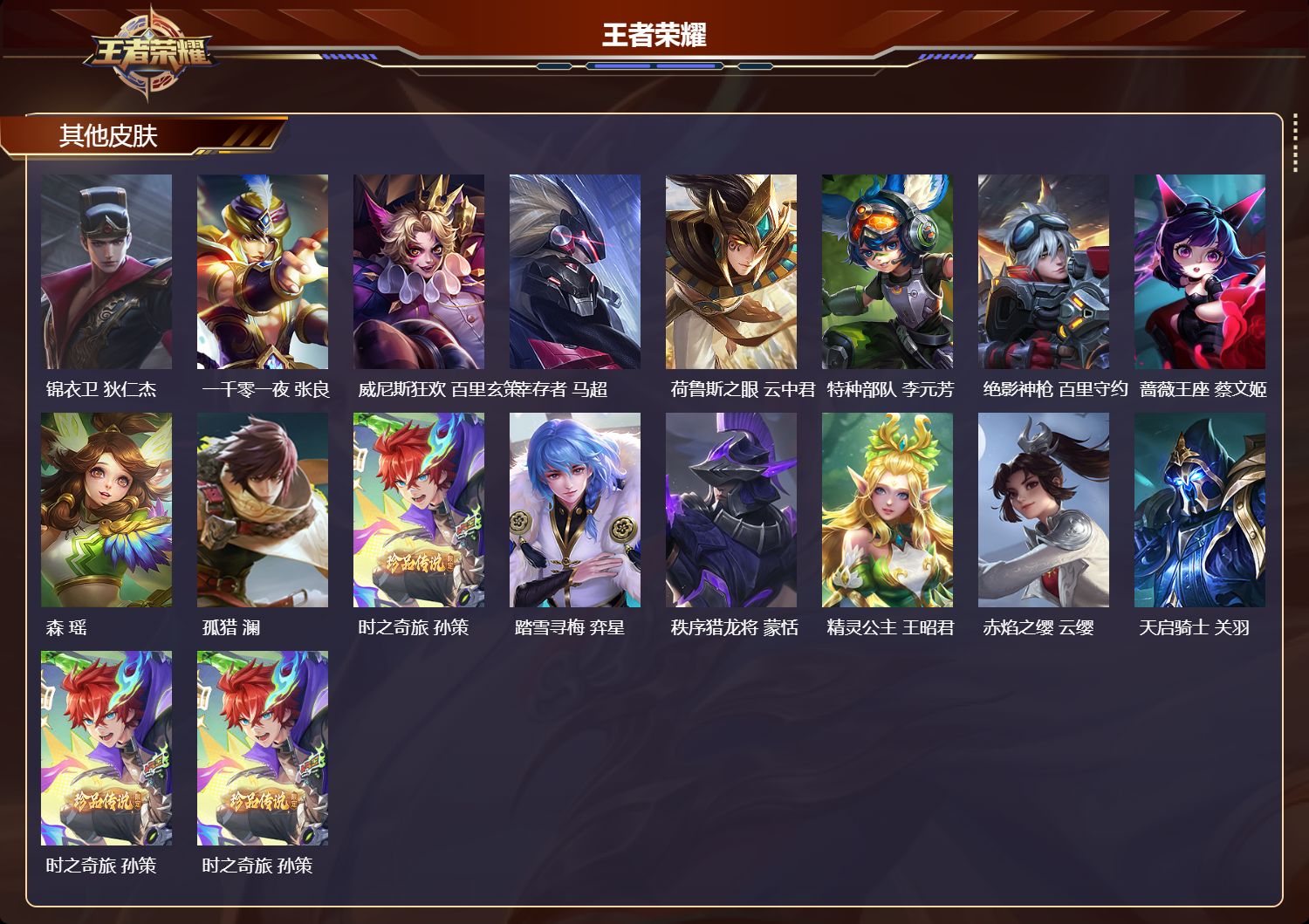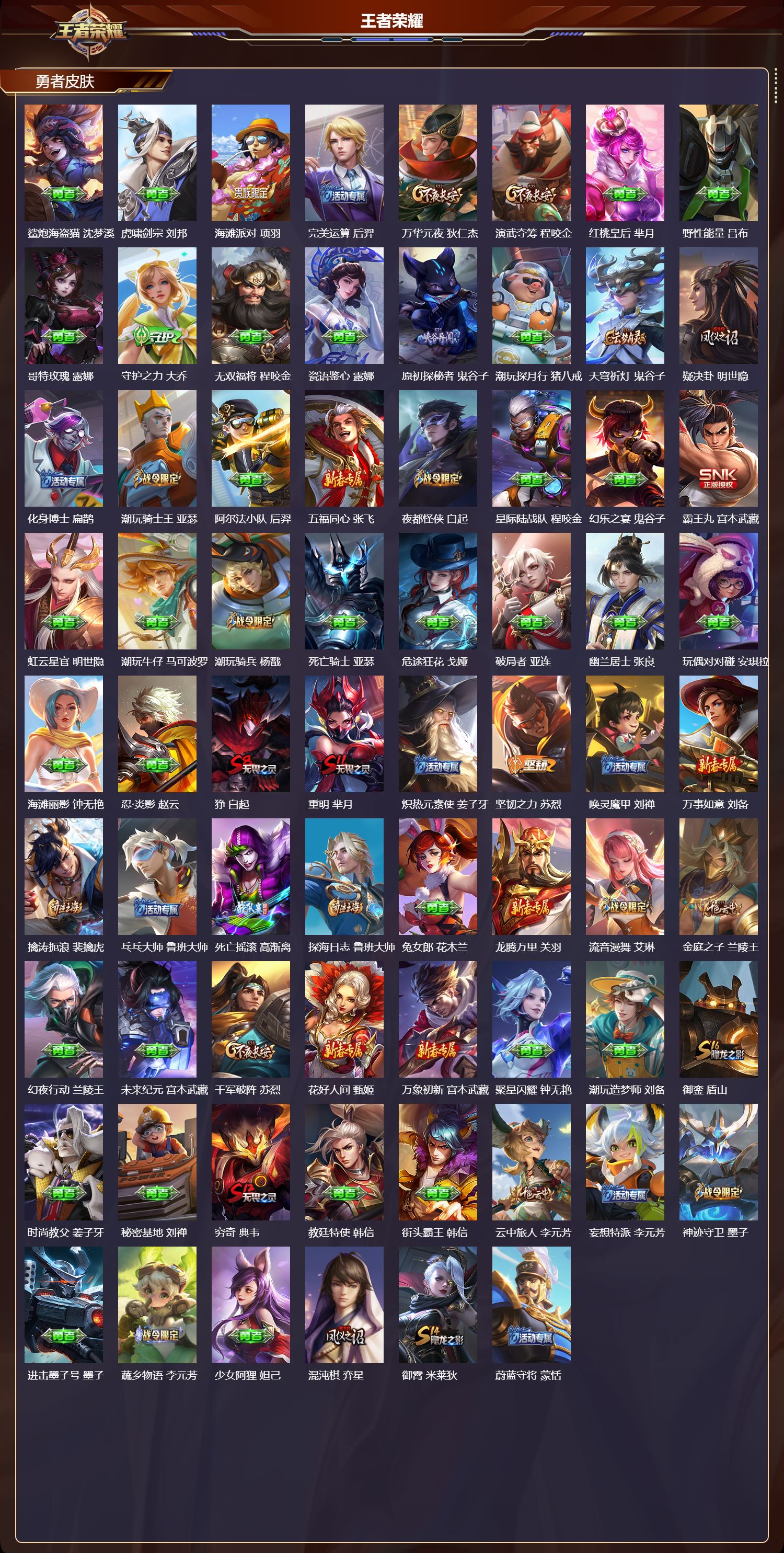 上官婉儿_神器·万象笔安琪拉_心灵骇客司空震_地狱燃心云中君_纤云弄巧澜_赏金猎手蒙犽_百解令嫦娥_拒霜思杨玉环_遇见飞天墨子_金属风暴兰陵王_暗隐猎兽者吕布_圣诞狂欢吕布_末日机甲妲己_女仆咖啡妲己_时之奇旅钟无艳_超时空战士亚瑟_心灵战警蒙恬_荣光圣徽李白_千年之狐蔡文姬_夏日便利店暃_星界游侠张飞_乱世虎臣高渐离_燃音魔法甄姬_冰雪圆舞曲戈娅_驭风魔法鬼谷子_五谷丰年宫本武藏_鬼剑武藏元歌_无心曹操_幽灵船长花木兰_水晶猎龙者镜_玫瑰异探镜_青焰无极廉颇_地狱岩魂貂蝉_圣诞恋歌貂蝉_唤灵魅影伽罗_琥珀纪元百里守约_特工魅影阿轲_节奏热浪夏洛特_永昼孙尚香_蔷薇恋人孙尚香_水果甜心小乔_青蛇梦奇_顽趣孙策_猫狗日记黄忠_怒海争锋狄仁杰_魔术师狄仁杰_鹰眼统帅刘禅_天才门将刘禅_电玩·爆裂旋风扁鹊_奇幻香踪鲁班七号_蔬乡物语白起_星夜王子刘备_百相守梦狂铁_电玩高手嬴政_摇滚巨星橘右京_修罗李元芳_逐浪之夏王昭君_偶像歌手百里玄策_热力回旋阿古朵_江河有灵姬小满_战舞者赵云_皇家上将赵云_未来纪元赵云_龙胆