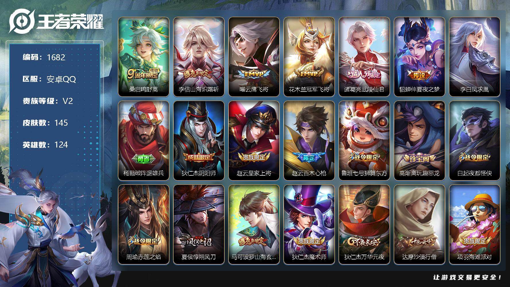 贵族等级:v7皮肤数:205勇者品质93 史诗品质65 限定68 周年限定4 中华曲艺1 活动专属18 赛季限定19 梦幻童话1 战令限定16 地狱火2 传说品质16 生肖限定7 新春专属3 源梦皮肤4 归虚梦演3 宇宙歌姬1 五路精神3 青春校园2 CP皮肤5 圣诞颂歌4 末日机甲1 FMVP3 西部大镖客1 夏日海滩7 蔬菜精灵3 王者之证5 胡桃异想国1 世冠皮肤1 琥珀纪元3 御龙在天1 冰雪之歌1 魔法世界2 星界纪事1 冰雪奇缘1 五五朋友节2 圆桌骑士1 未尽之器1 荣耀典藏1 百相守梦2 顽趣1 贵族限定3 成就限定1 信誉专属1 草木风华1 大话西游1 电玩狂想1 五环荣耀1 奇趣潮玩1 妄想都市2 珍宝阁专属1 破界1 英雄数:121