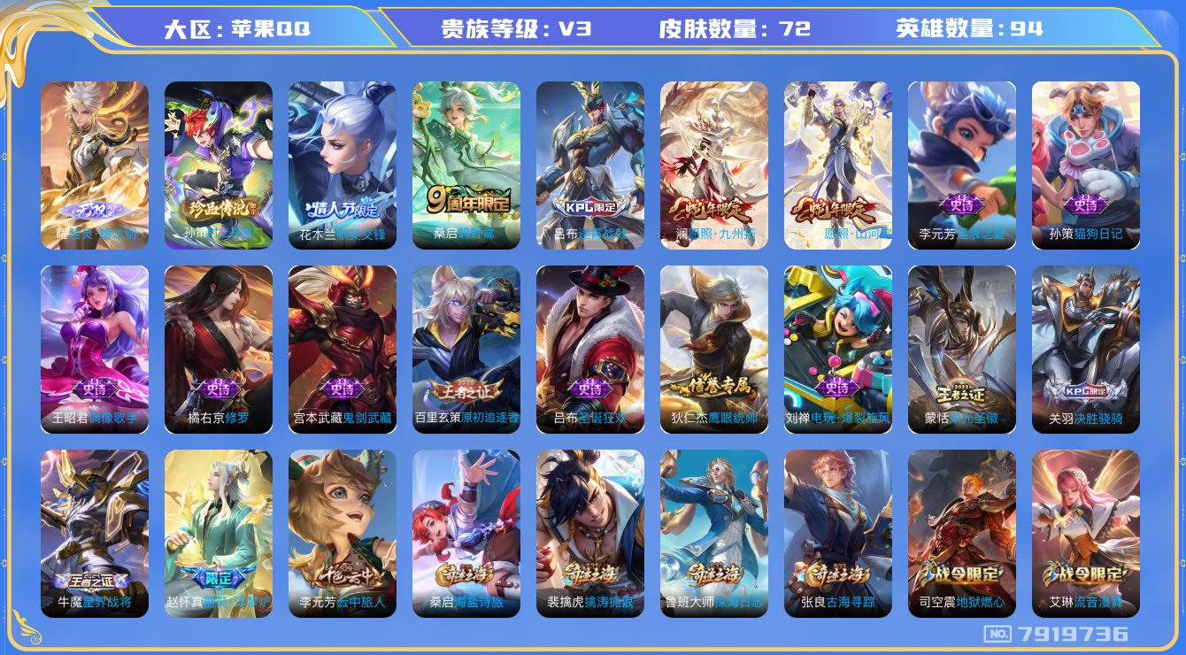 贵族等级:v7皮肤数:131勇者品质61 传说品质13 圣域传说2 活动专属5 赛季限定12 限定39 战令限定12 史诗品质32 地狱火1 新春专属5 源梦皮肤3 末日机甲2 FMVP3 西部大镖客1 86版西游记1 超时空小队2 夏日海滩5 世冠皮肤2 五路精神2 珍宝阁专属1 冰雪之歌1 周年限定2 青春校园2 五五朋友节1 生肖限定2 王者之证1 顽趣1 乐园午夜2 贵族限定3 成就限定1 信誉专属1 蔬菜精灵2 五环荣耀1 御龙在天1 奇趣潮玩2 古今物语1 英雄数:111