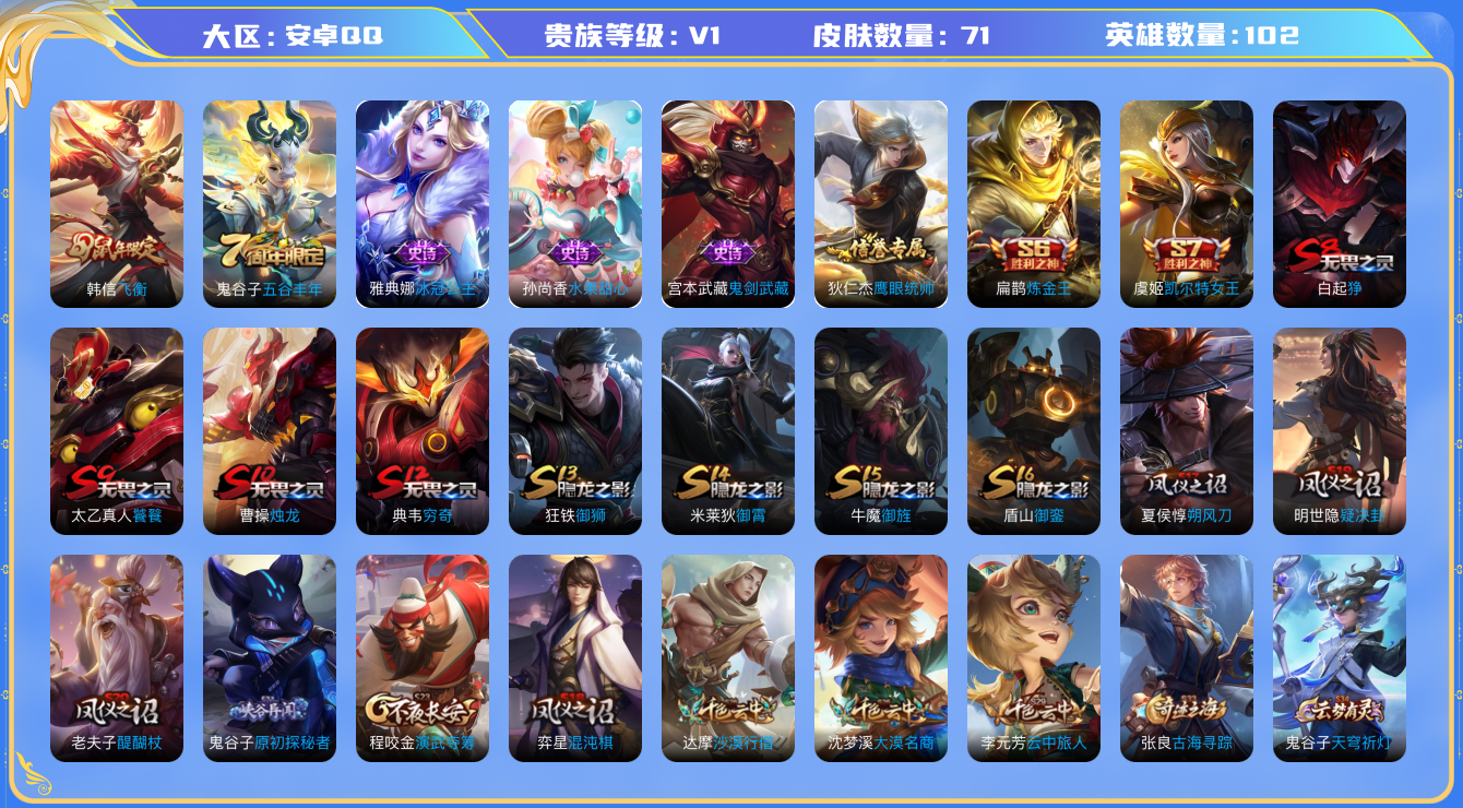 贵族等级:v1皮肤数:7史诗品质2 勇者品质3 传说品质1 赛季限定1 限定1 英雄数:19