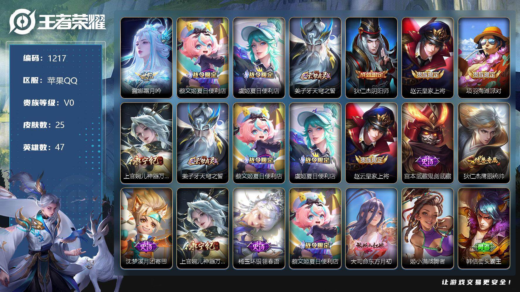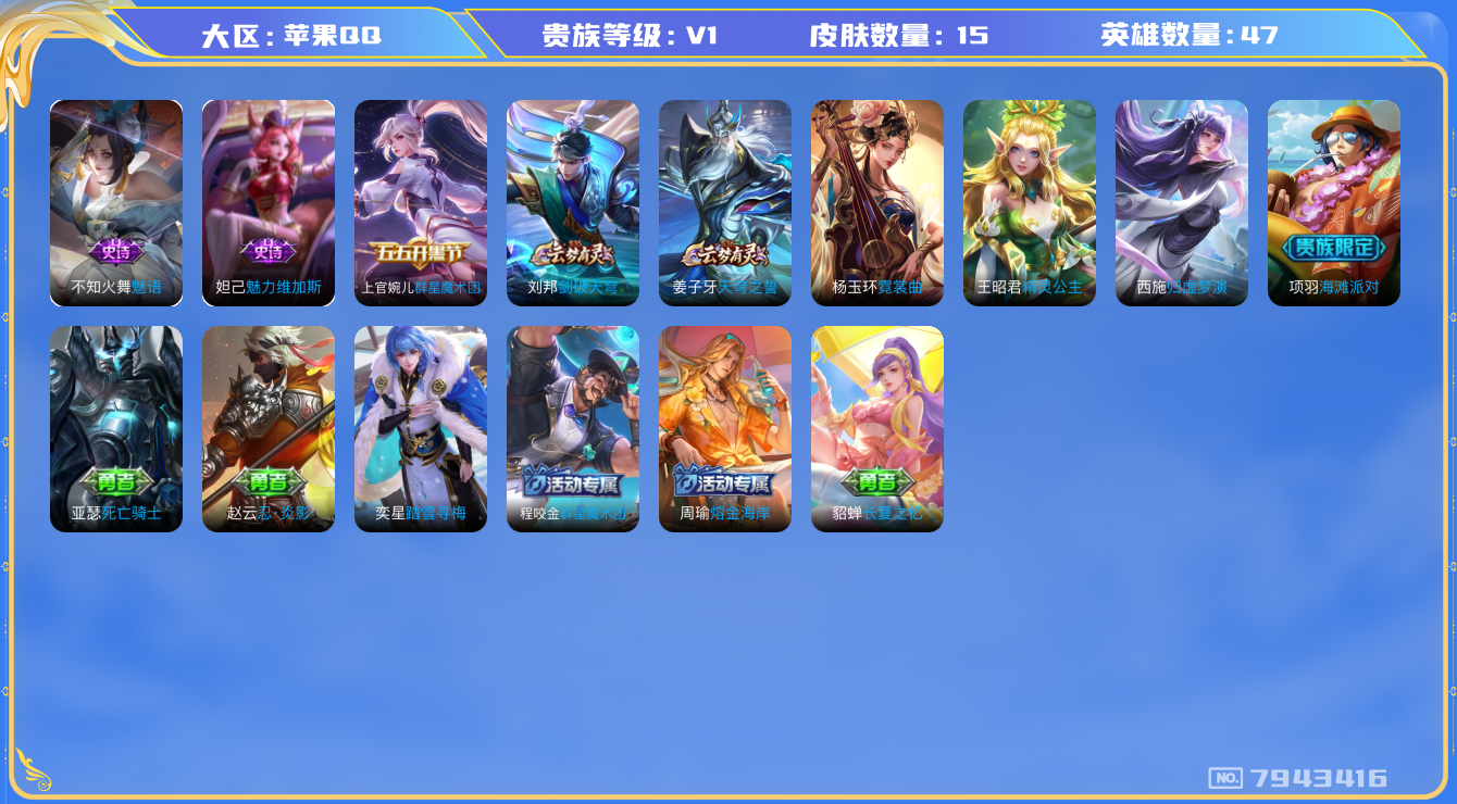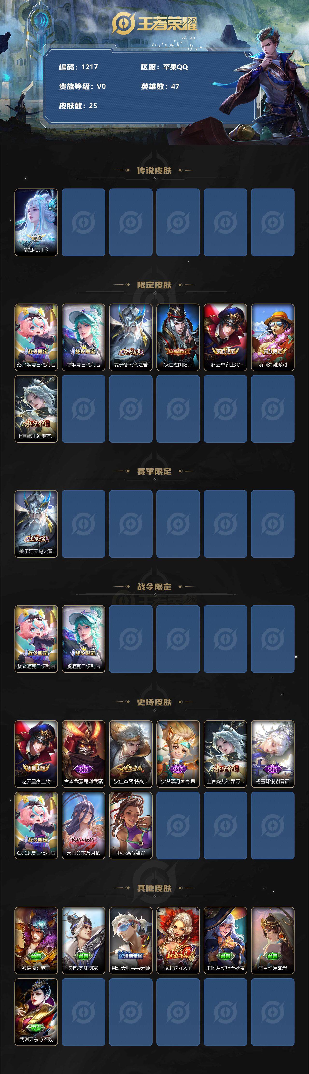 贵族等级:v5皮肤数:117勇者品质65 活动专属9 赛季限定17 限定31 新春专属3 史诗品质24 源梦皮肤2 胡桃异想国2 五路精神2 KPL限定1 西部大镖客1 夏日海滩2 CP皮肤2 传说品质1 FMVP1 冰雪之歌1 周年限定2 青春校园1 五五朋友节2 战令限定4 地狱火1 圣诞颂歌1 珍宝阁专属2 归虚梦演1 乐园午夜1 成就限定1 信誉专属1 魔法世界1 五环荣耀1 奇趣潮玩1 妄想都市2 贵族限定2 英雄数:120