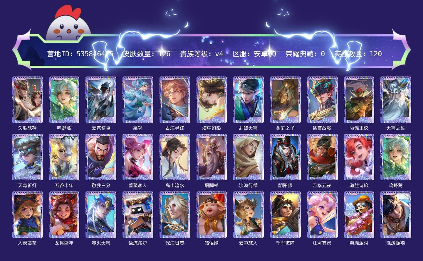 贵族等级:v4皮肤数:126传说品质3 英雄数:120