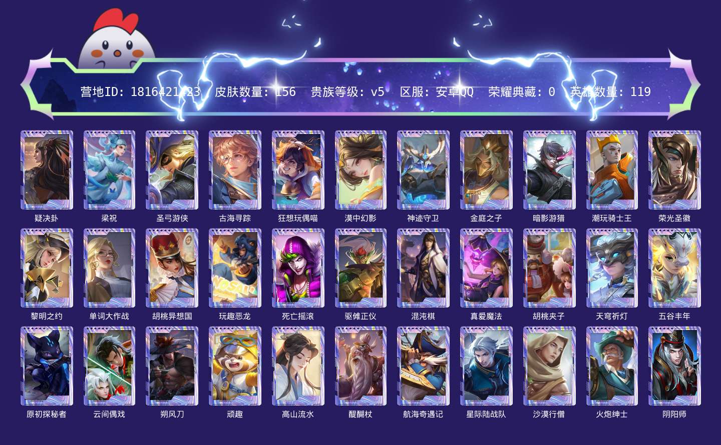 安卓Q-【可二次】-英雄数量:119-皮肤数量:156-贵族等级:贵族V5-玩趣恶龙-胡桃夹子-特工战影-街头霸王-暗影游猎-黎明之约-水晶猎龙者-苍穹之光-紫霞仙子-圣诞恋歌-千年之狐-摇滚巨星-顽趣梦奇-五谷丰年-电玩高手-火炮绅士-高山流水-真爱魔法-航海奇遇记-原初追逐者-胡桃异想国-云间偶戏-狂想玩偶喵-冰雪圆舞曲-末日机甲男-鹰眼护卫-水果甜心-梁祝-绅士熊喵-天才门将-鬼剑武藏-魅力维加斯-皇家上将-乱世虎臣-暗隐猎兽者-幽灵船长-乘风破浪-金属风暴-沉稳之力-忍炎影-幻想奇妙夜-炽热元素使-掌控之力-海滩派对-乓乓大师-启蛰-孤猎-未来旅行-秩序猎龙将-冰刃幻境-幸存者-灼热之刃-霓裳曲-死神来了-露花倒影-埃及法老-加勒比小姐-特种部队-星际陆战队达摩--营地号:1816421423