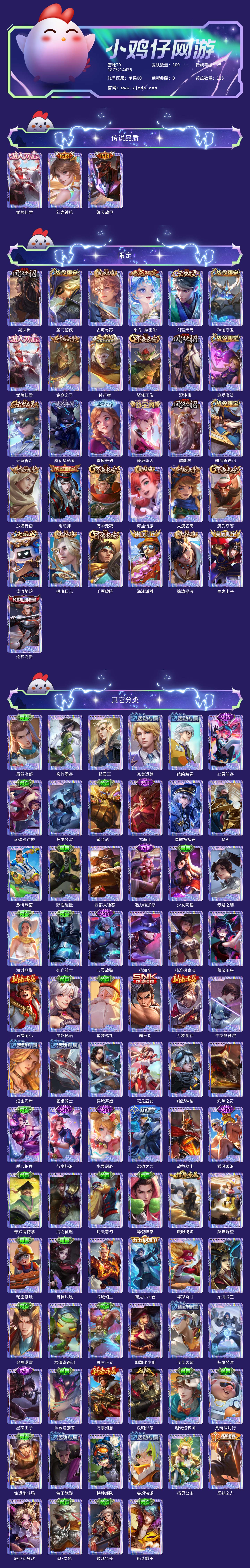 贵族等级:v5皮肤数:109生肖限定1 传说品质3 情人节限定1 英雄数:115