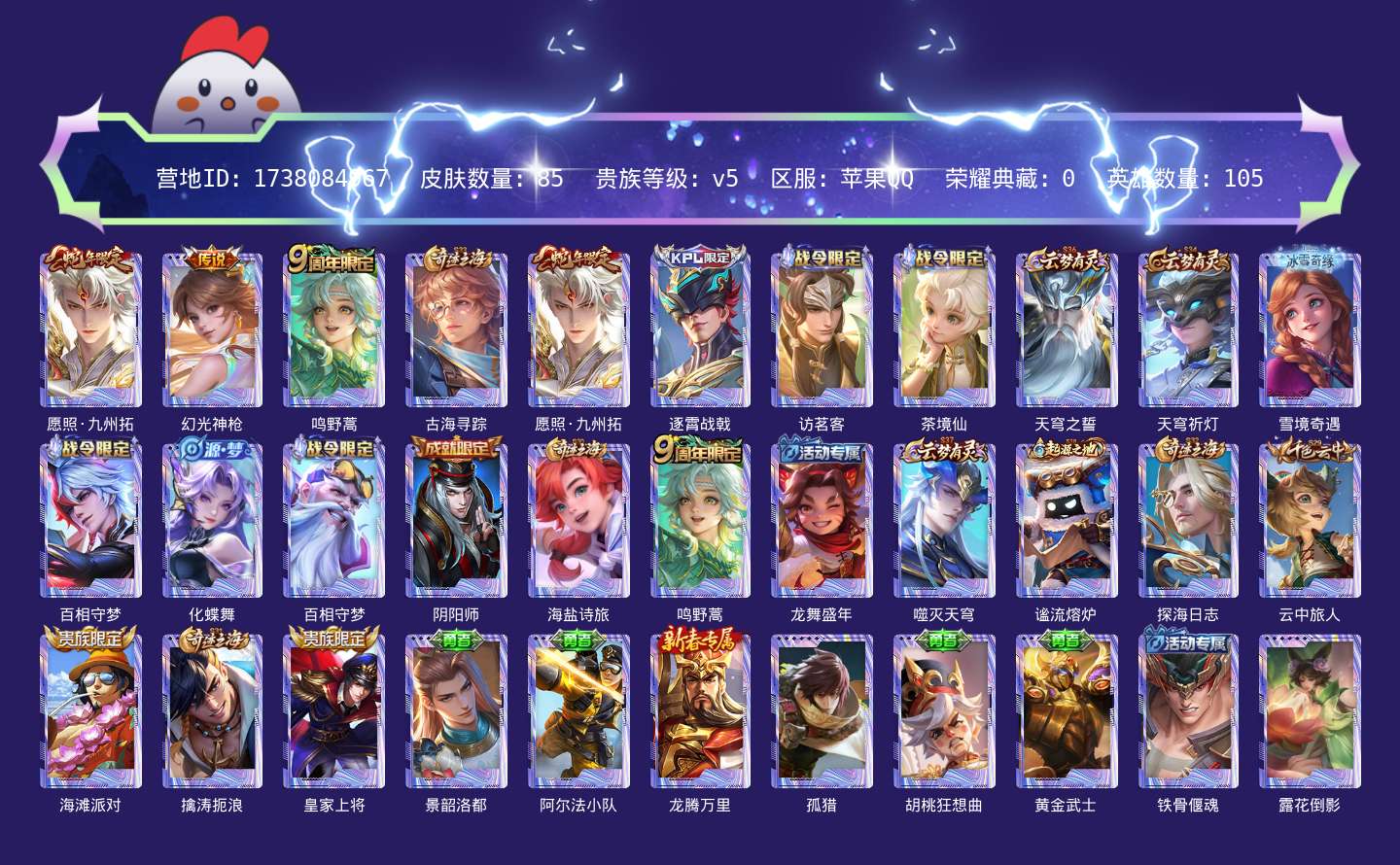 贵族等级:v5皮肤数:85传说品质3 生肖限定1 英雄数:105
