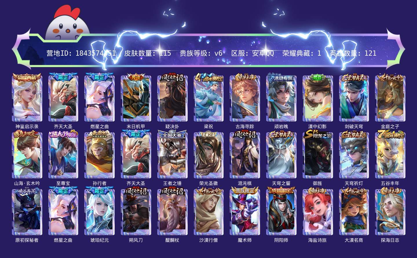 贵族等级:v6皮肤数:115生肖限定2 情人节限定1 传说品质3 荣耀典藏1 英雄数:121