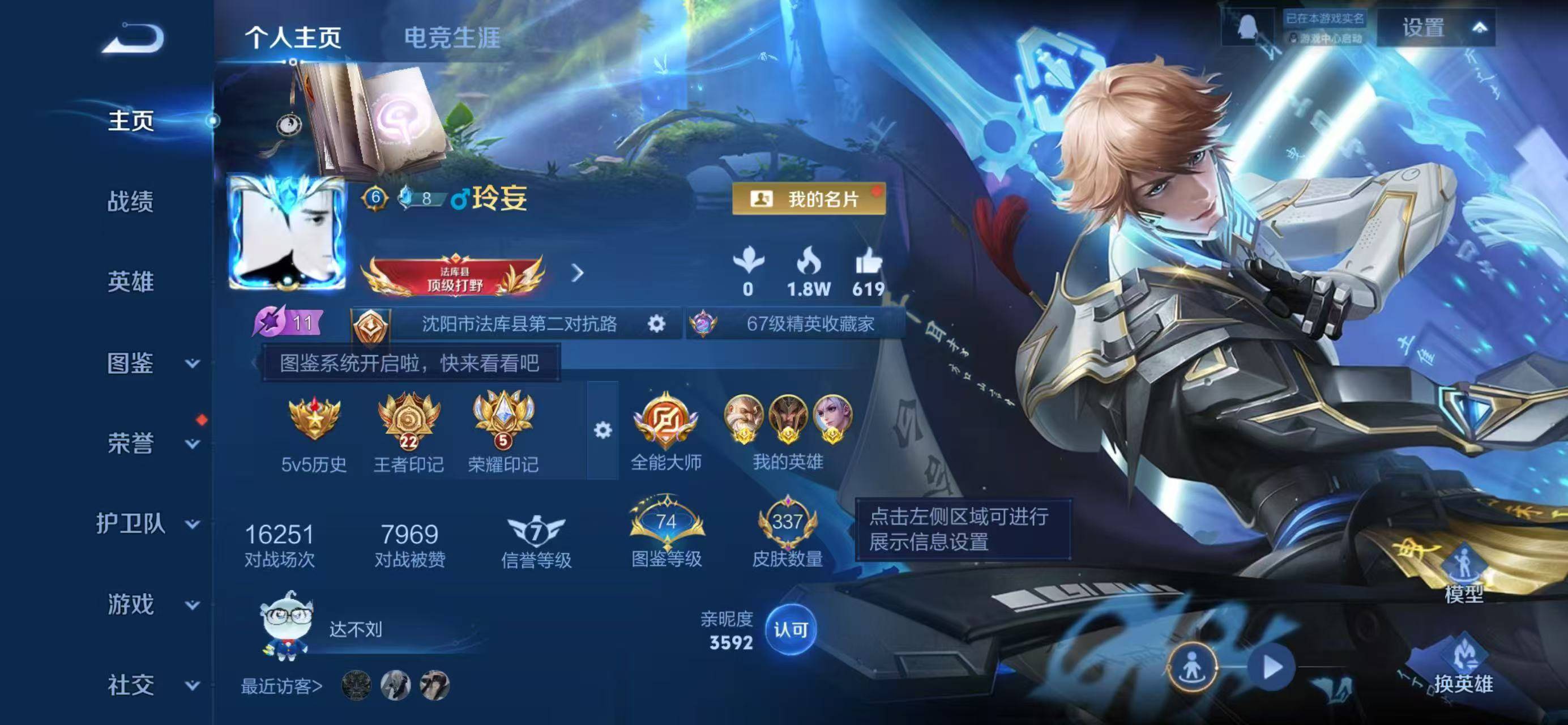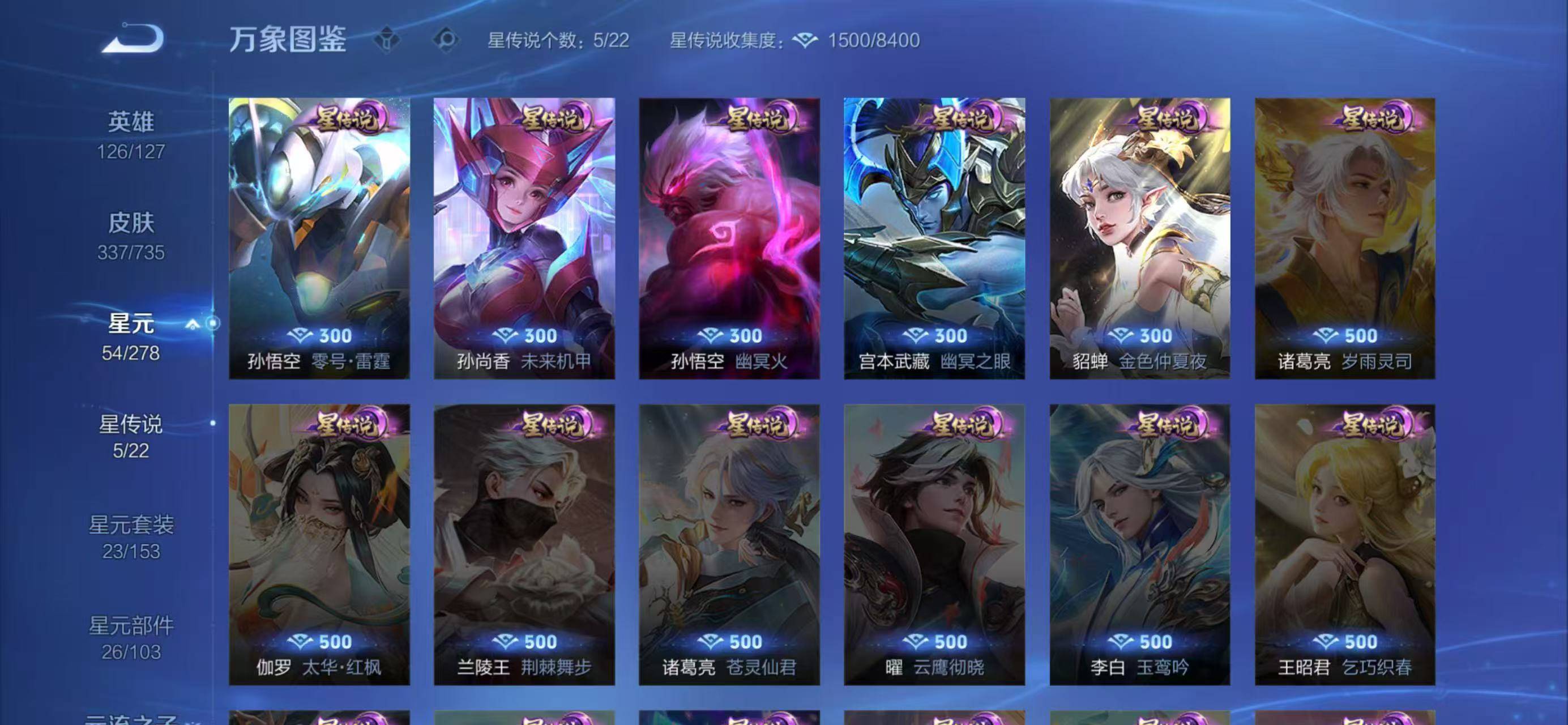 贵族等级:v6皮肤数:108传说品质7 生肖限定3 情人节限定1 英雄数:108