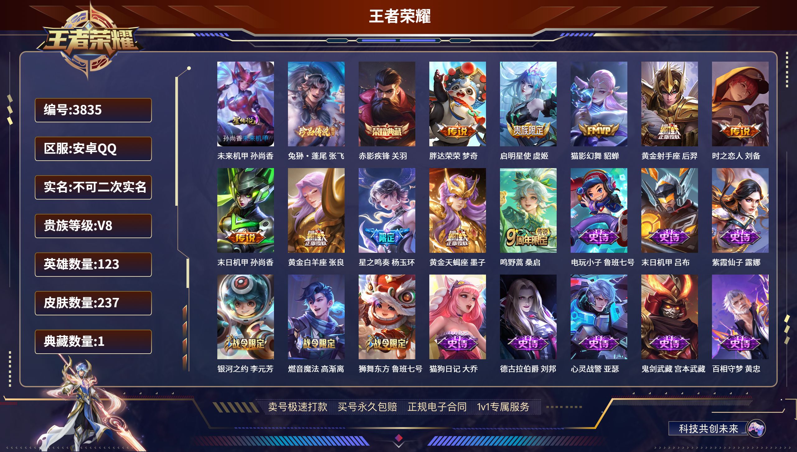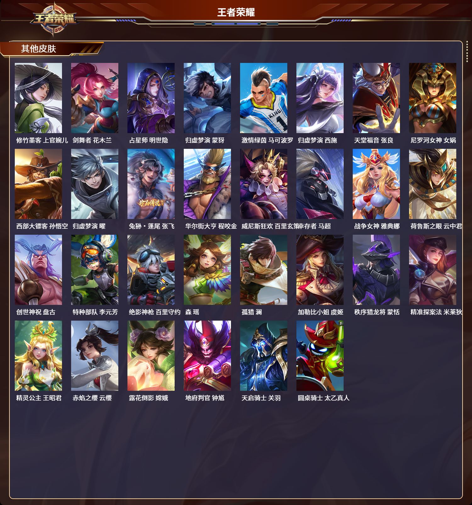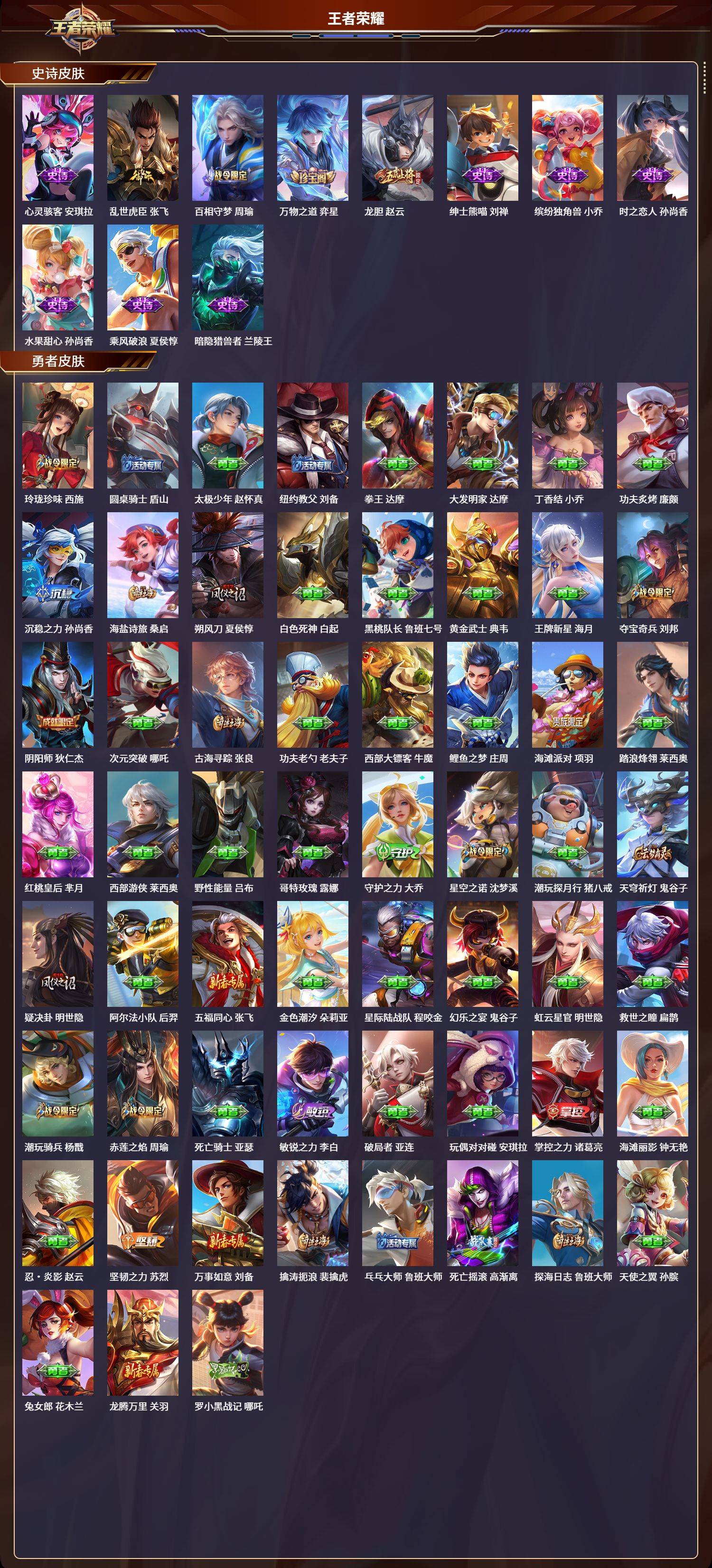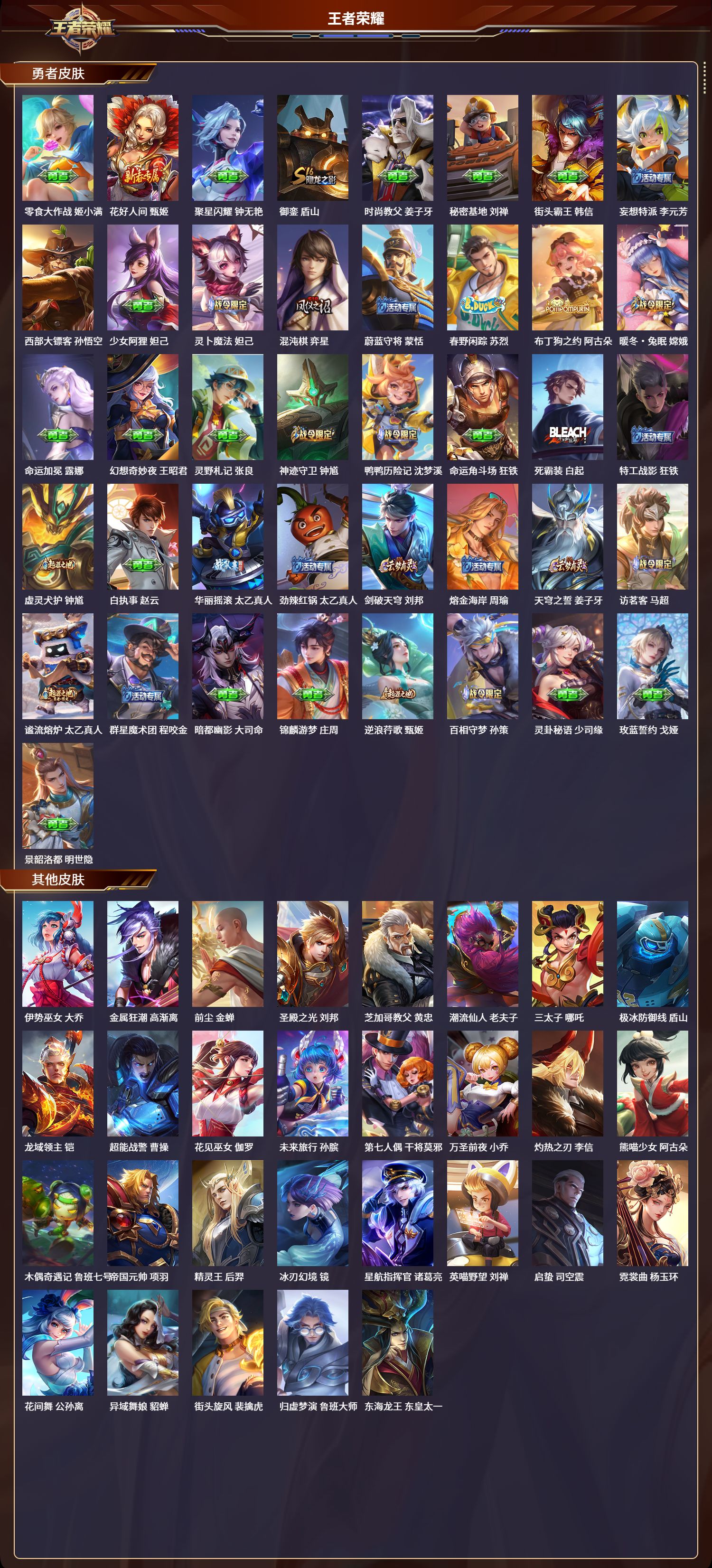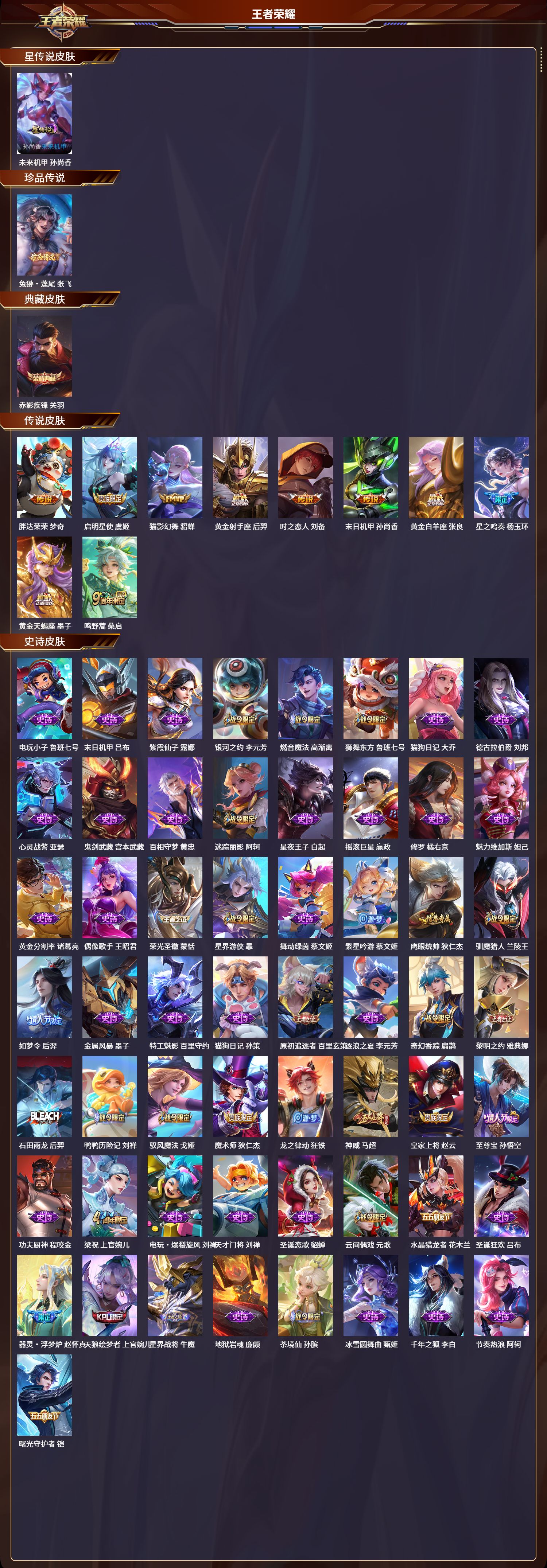 贵族等级:v6皮肤数:197传说品质5 生肖限定3 情人节限定1 英雄数:122