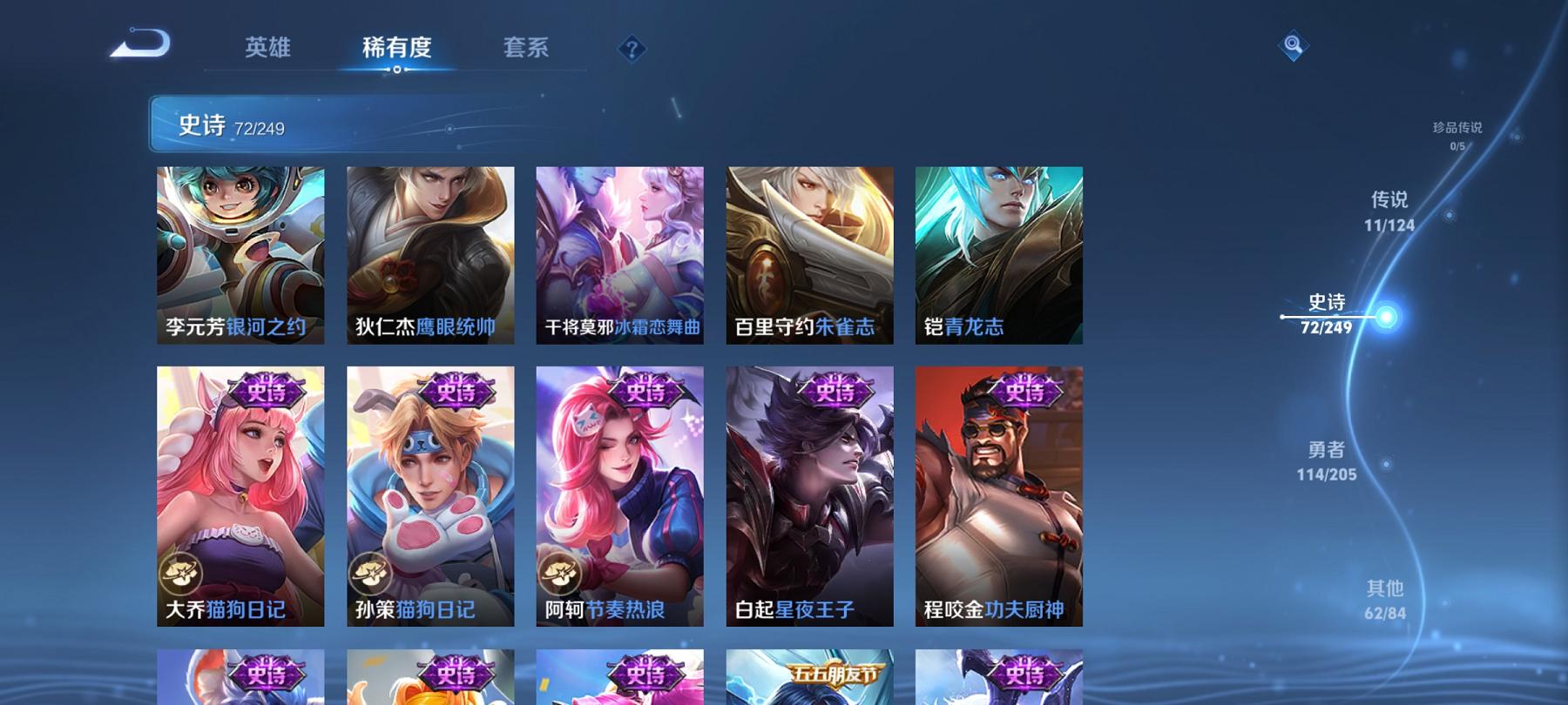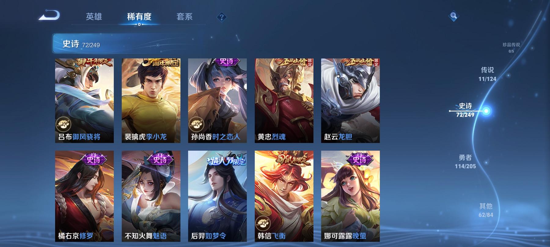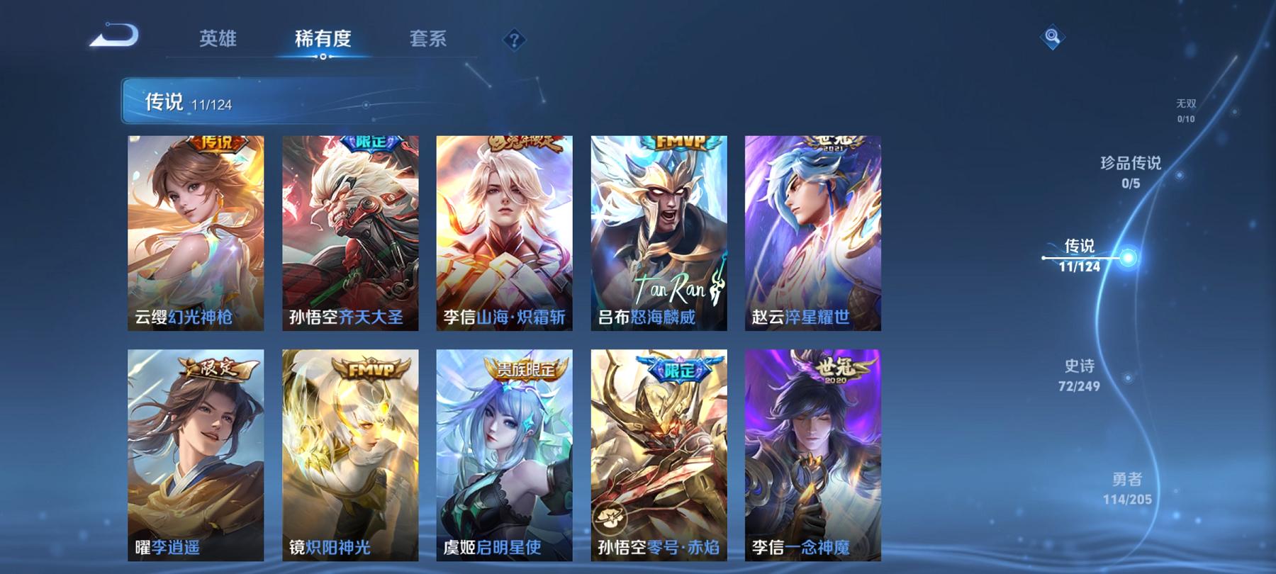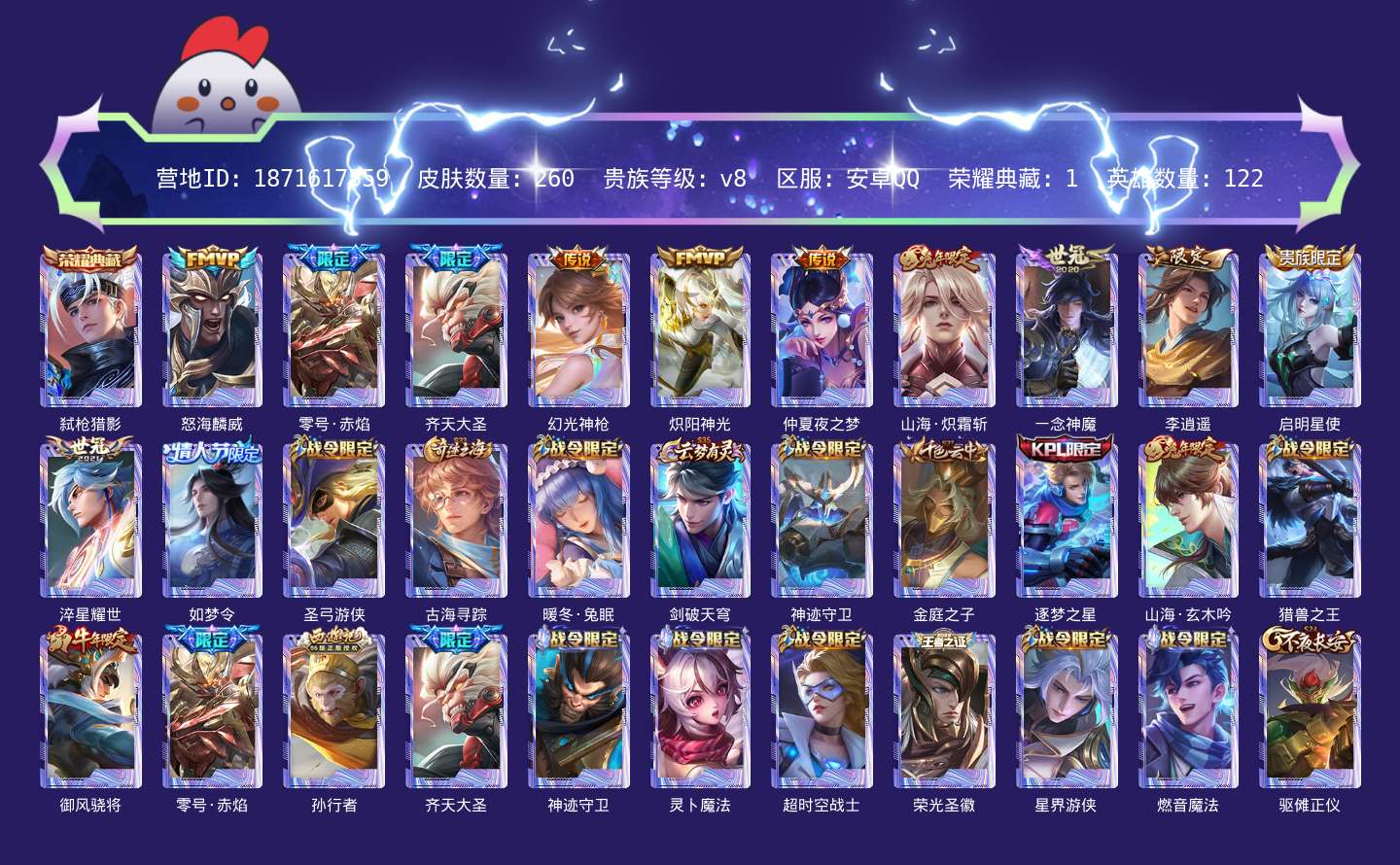 贵族等级:v8皮肤数:261情人节限定1 生肖限定6 传说品质11 荣耀典藏1 英雄数:123