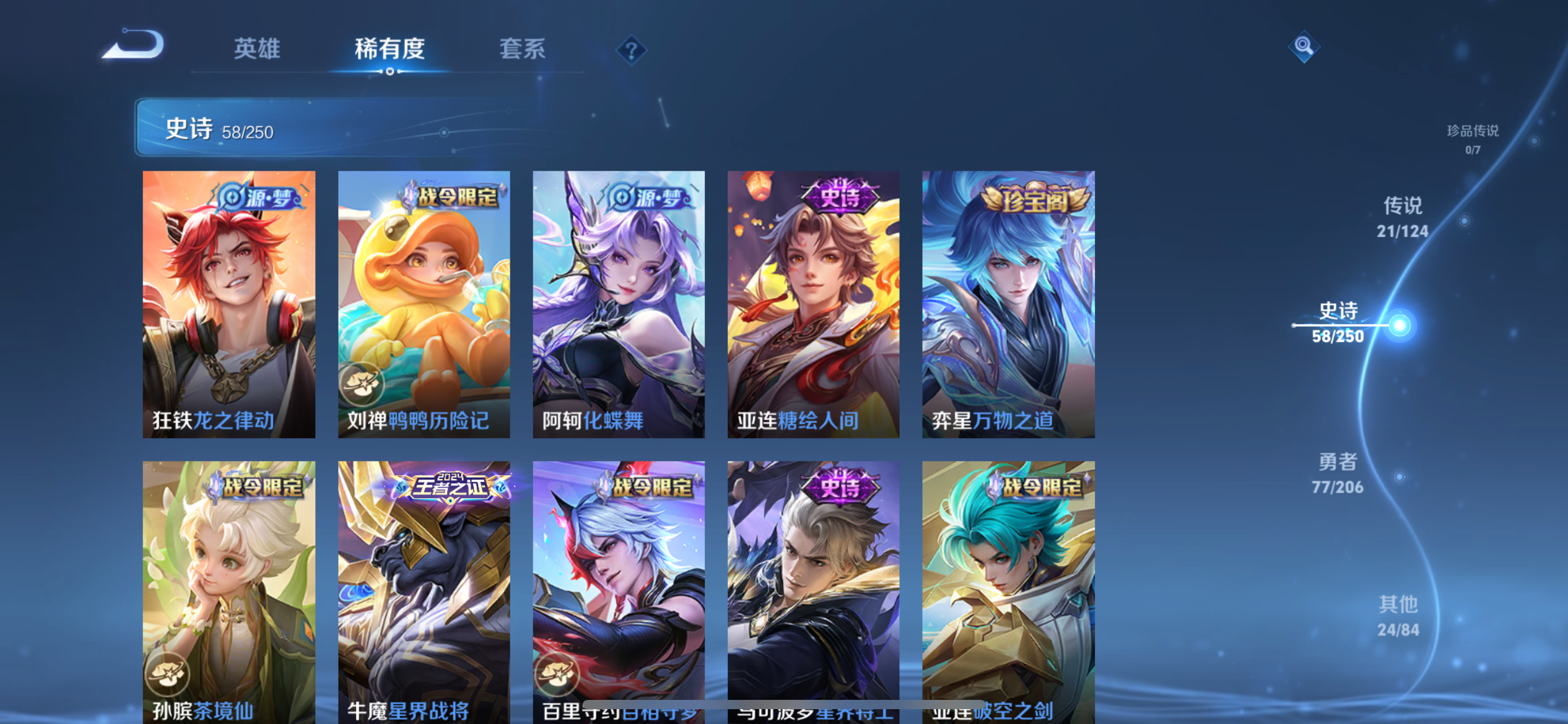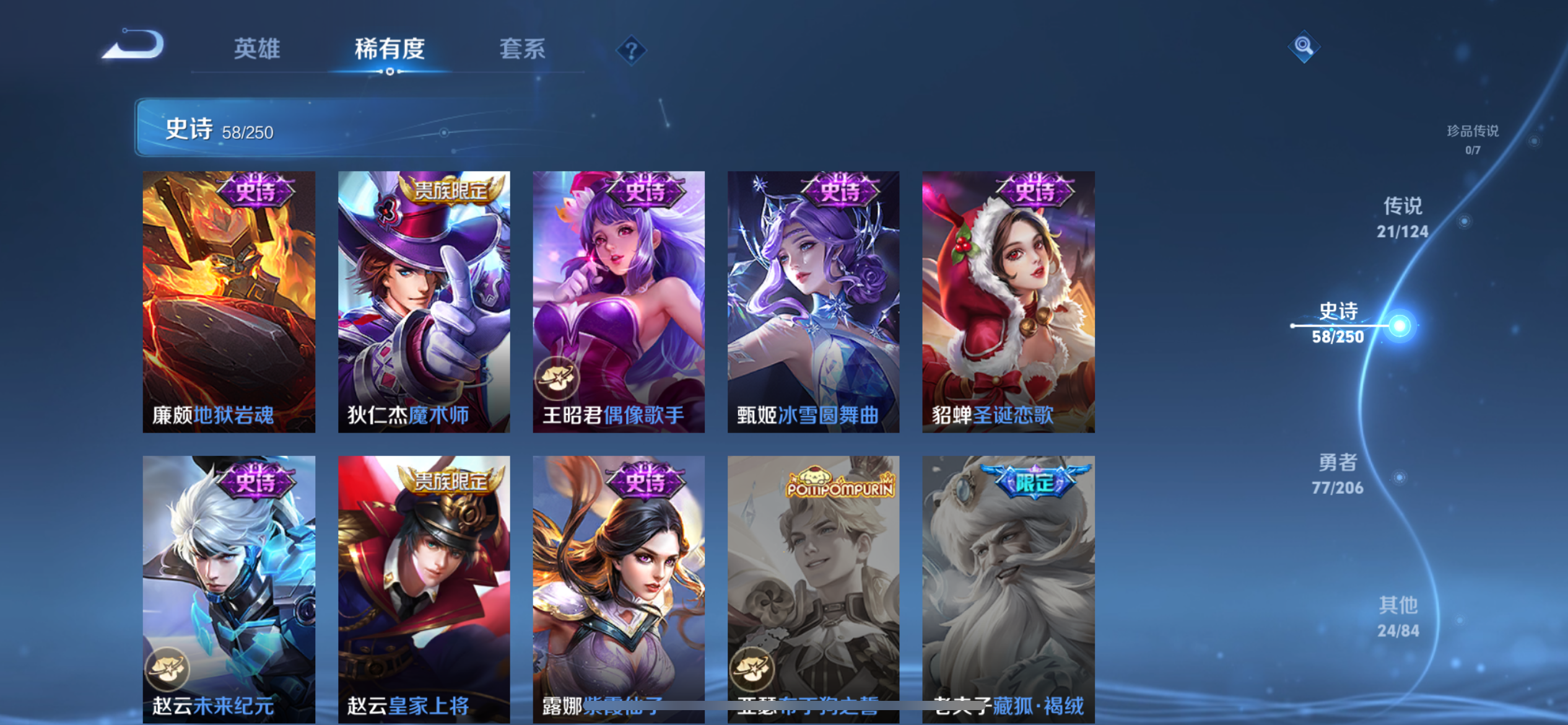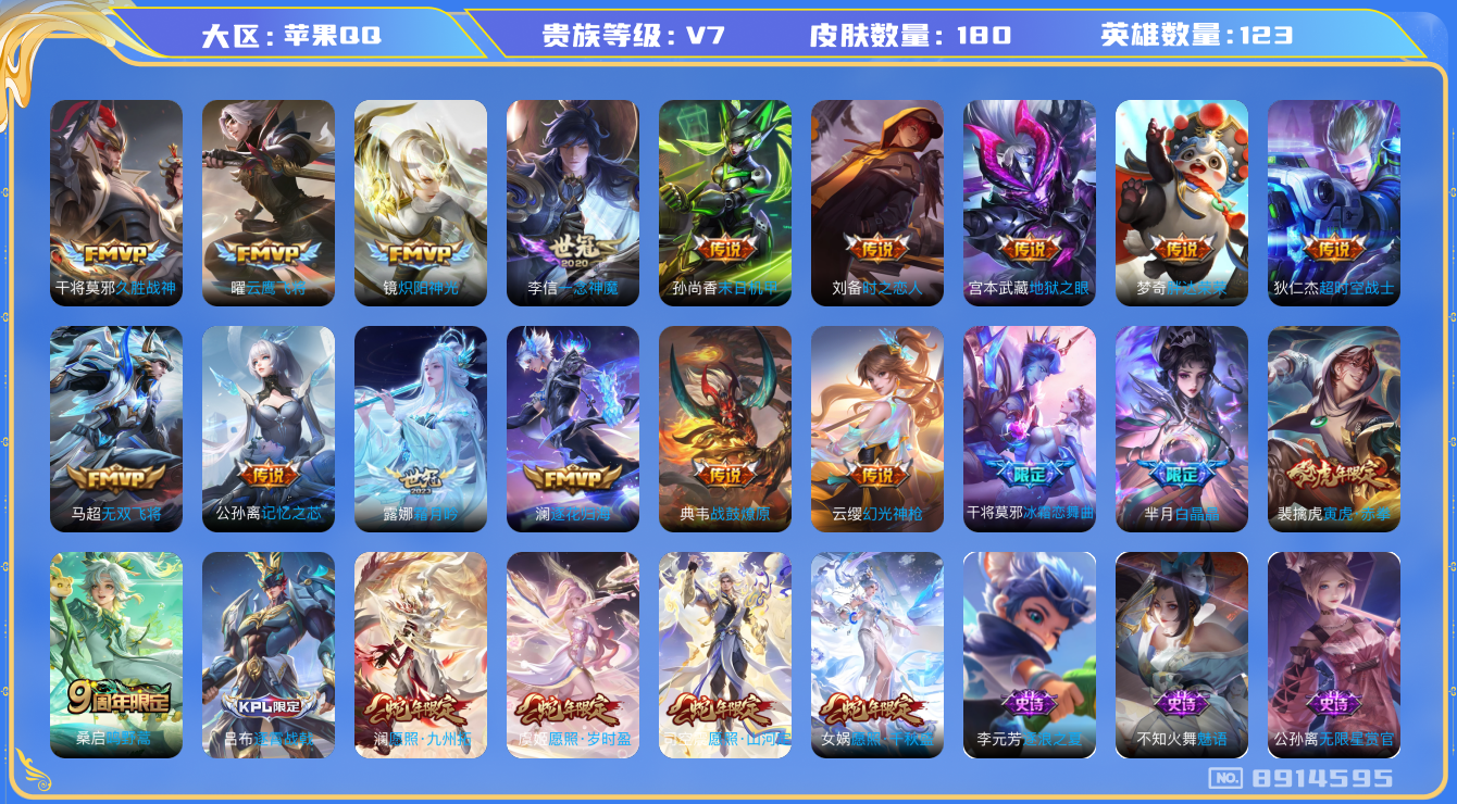 贵族等级:182皮肤数:180传说品质21 生肖限定5 英雄数:123