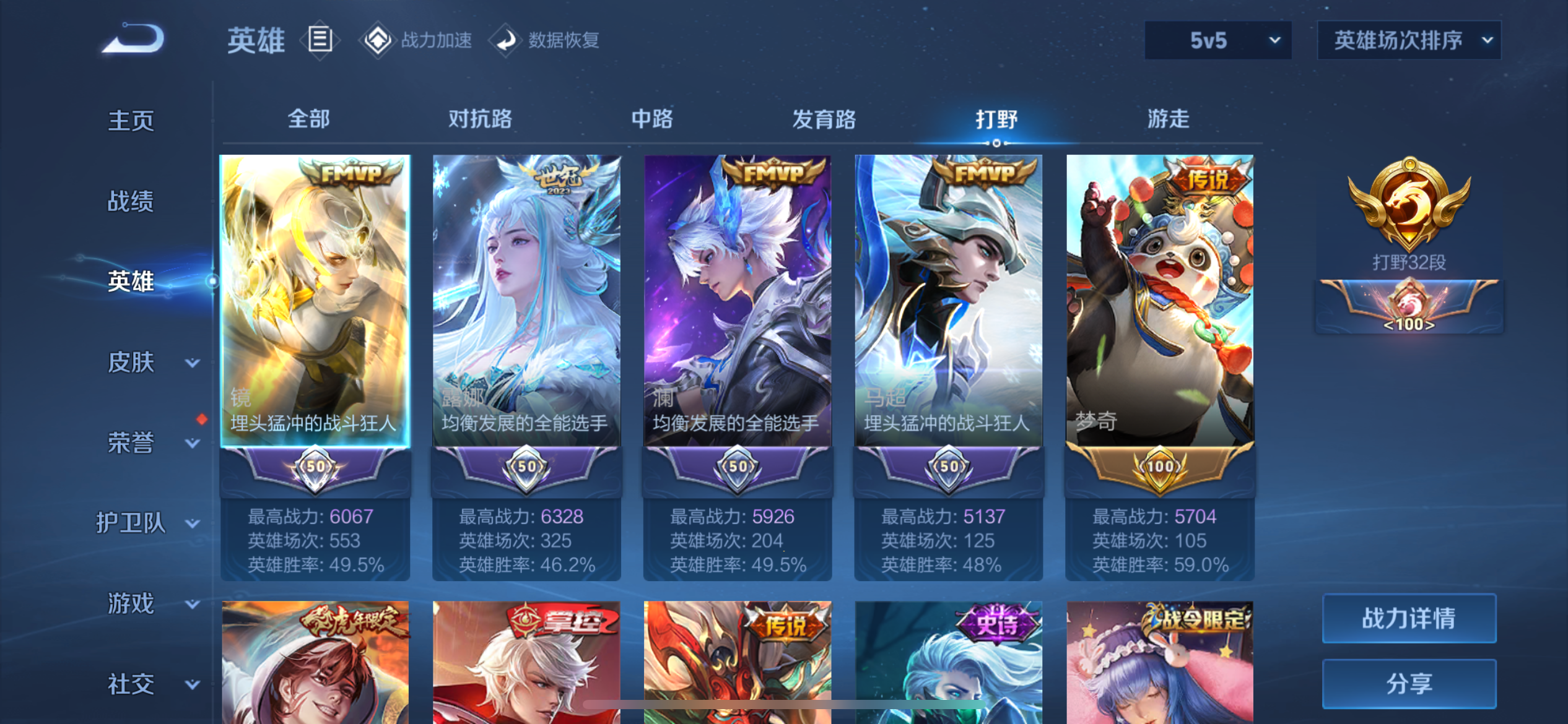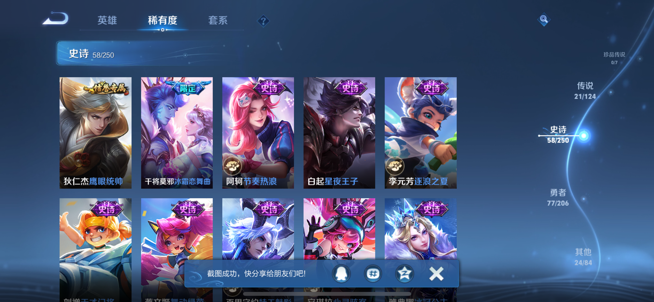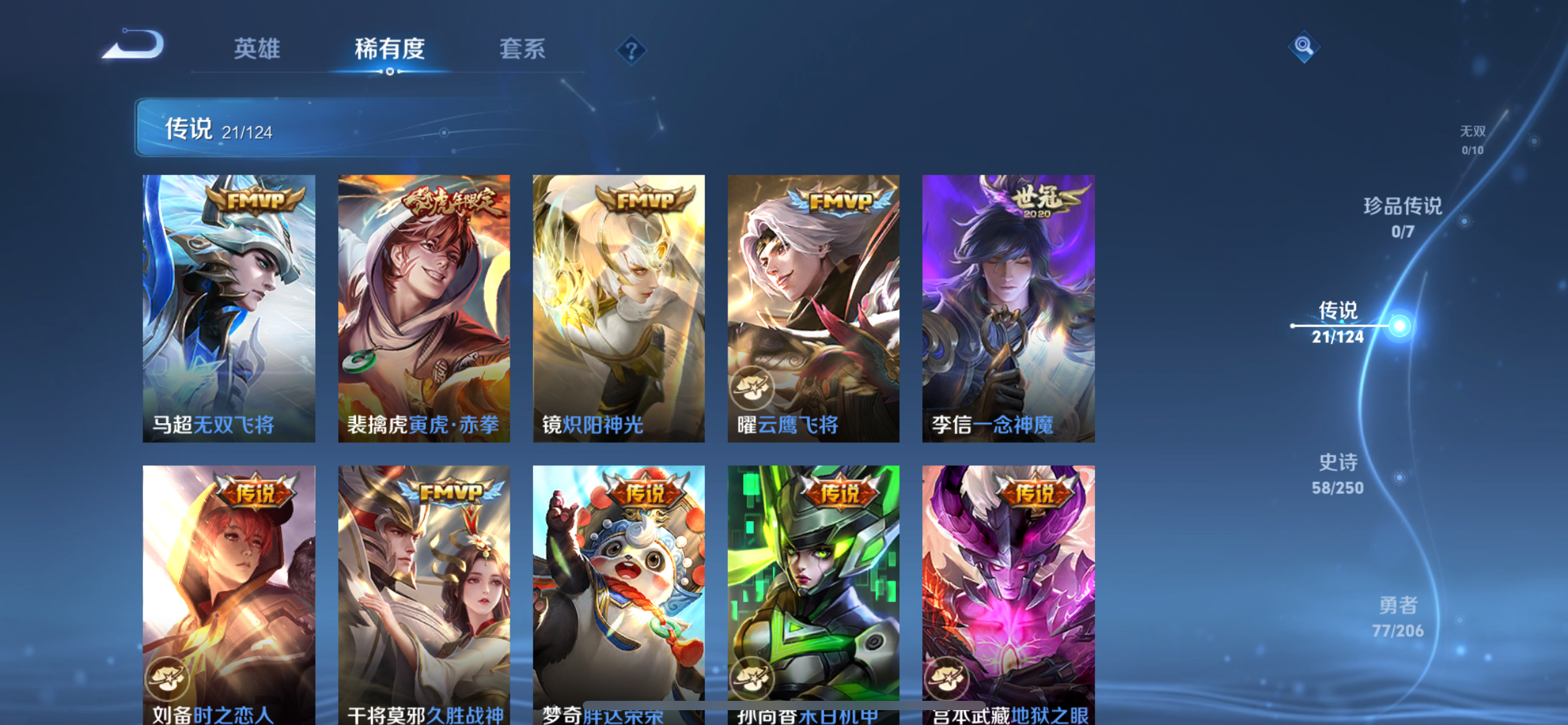 贵族等级:182皮肤数:180传说品质21 生肖限定5 英雄数:123