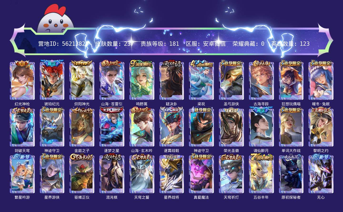 贵族等级:181皮肤数:237生肖限定2 传说品质5 英雄数:123