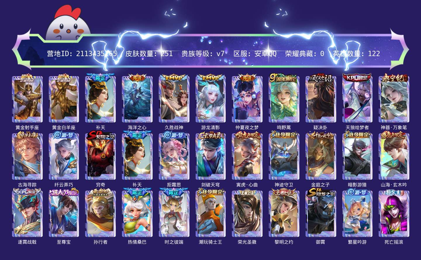 贵族等级:v7皮肤数:251传说品质8 生肖限定2 情人节限定1 英雄数:122