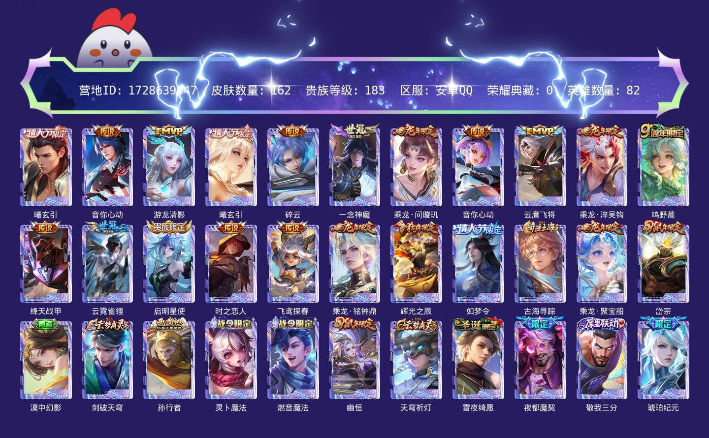 贵族等级:183皮肤数:162生肖限定7 情人节限定3 传说品质17 英雄数:82