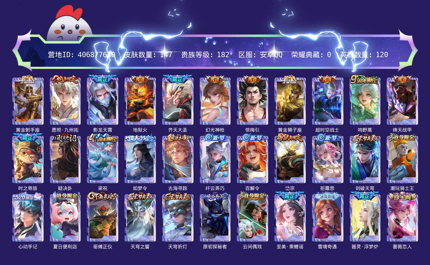 贵族等级:182皮肤数:147传说品质12 情人节限定1 生肖限定2 英雄数:120