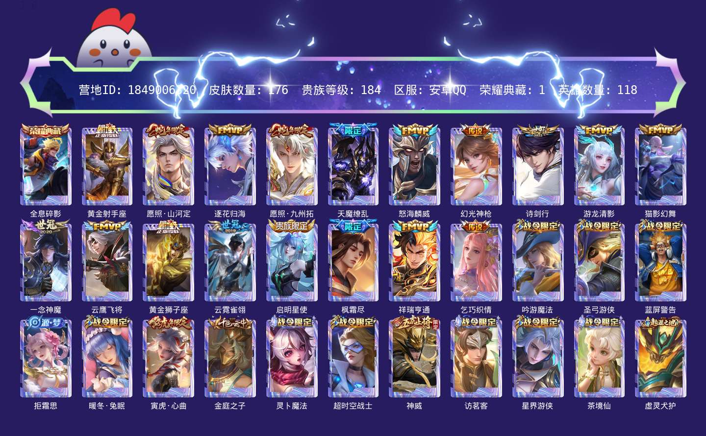 贵族等级:184皮肤数:176传说品质18 生肖限定3 荣耀典藏1 英雄数:118