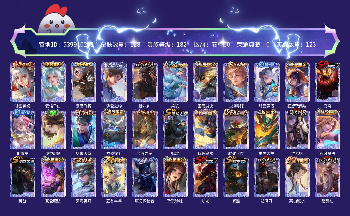 贵族等级:182皮肤数:128传说品质4 生肖限定1 英雄数:123