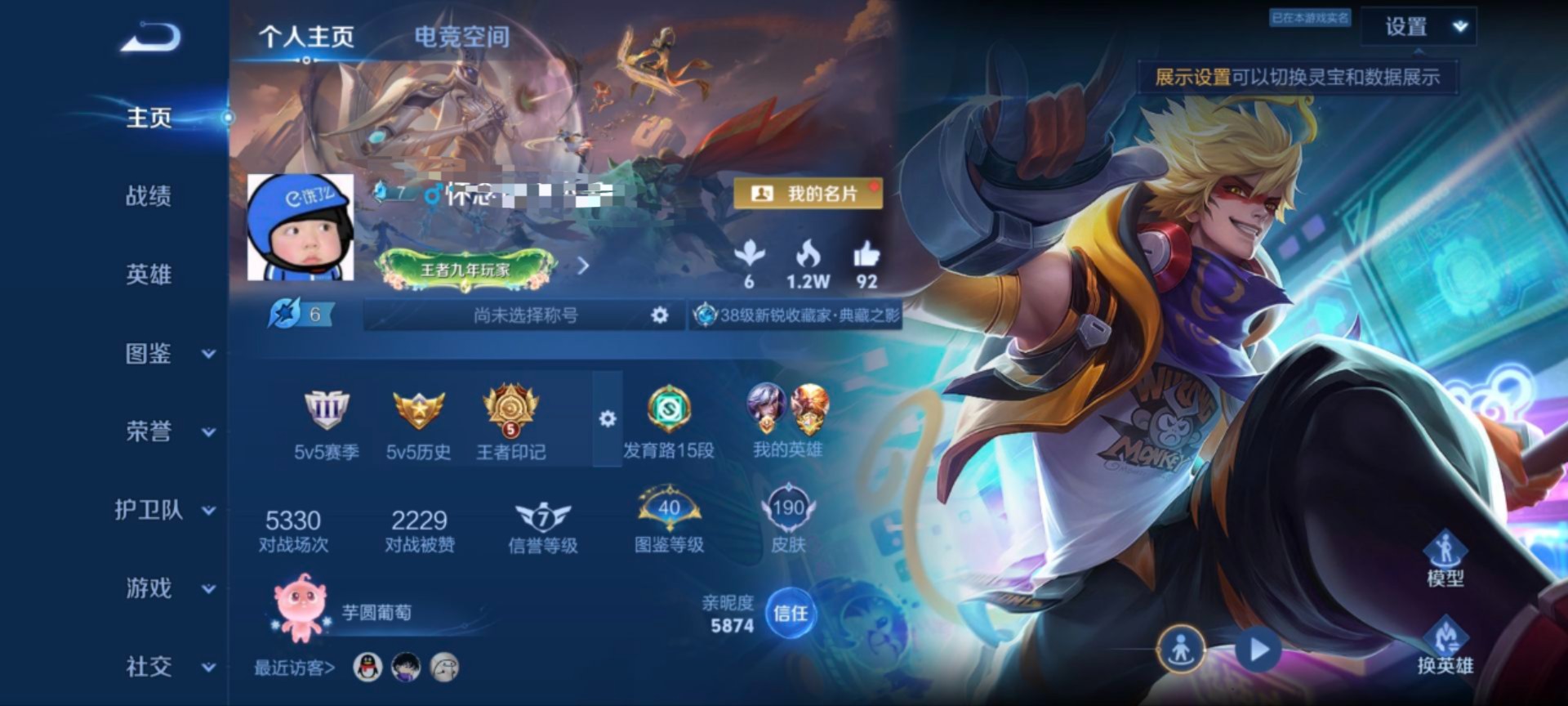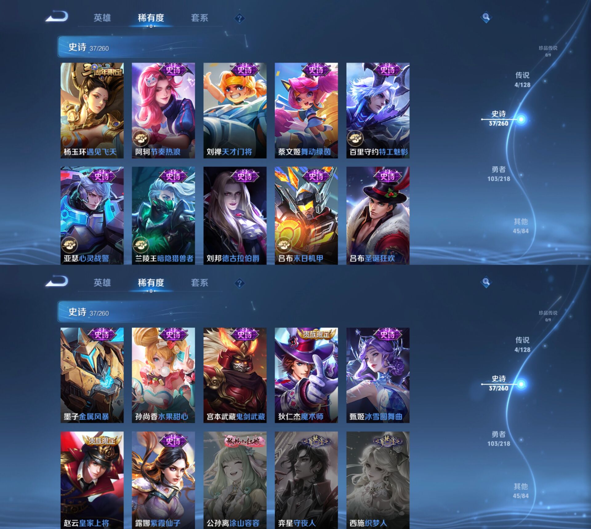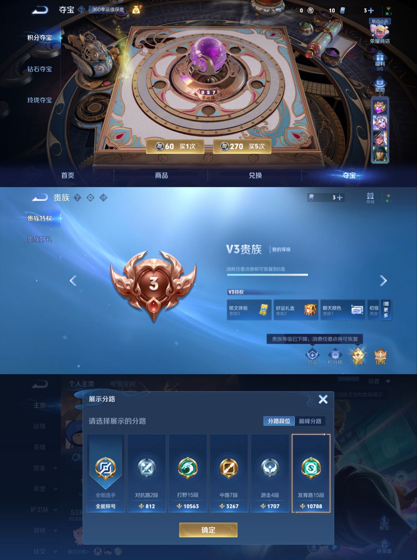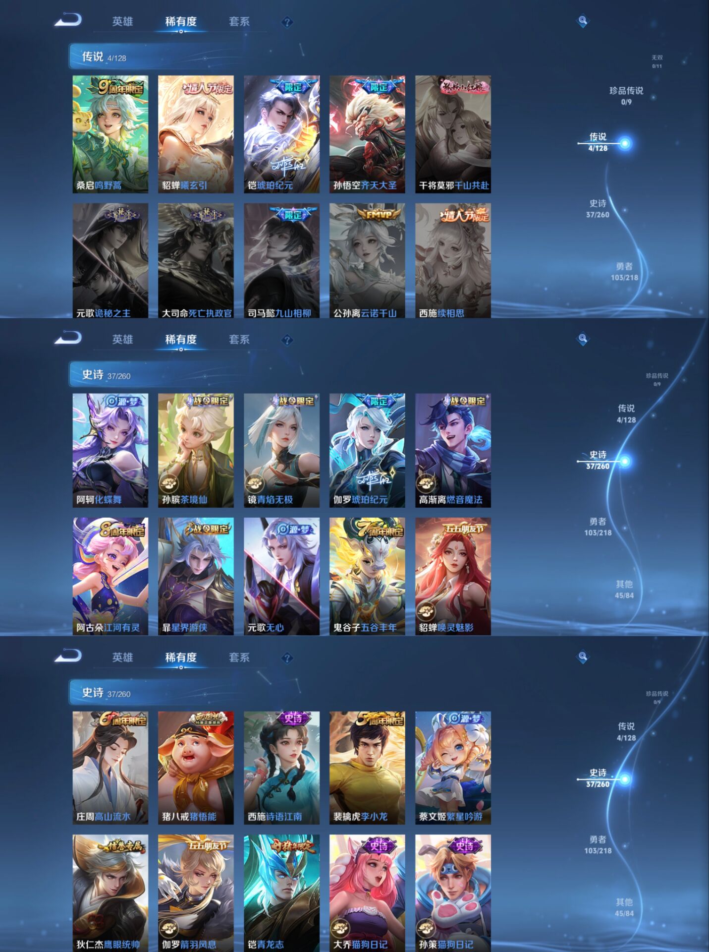 贵族等级:v6皮肤数:190荣耀典藏1 传说品质4 情人节限定1 生肖限定1 英雄数:124
