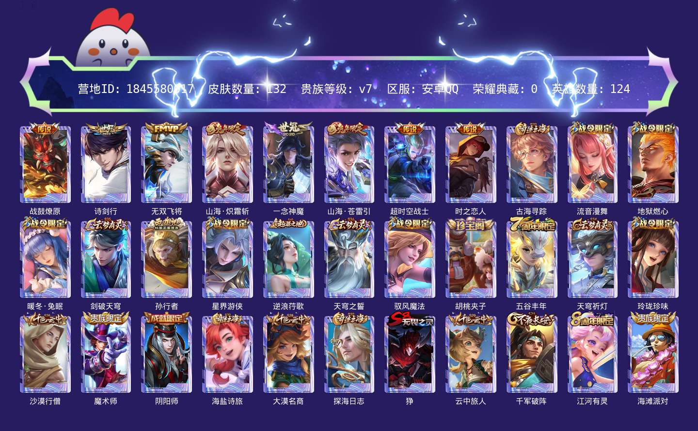贵族等级:v7皮肤数:132传说品质8 生肖限定2 英雄数:124