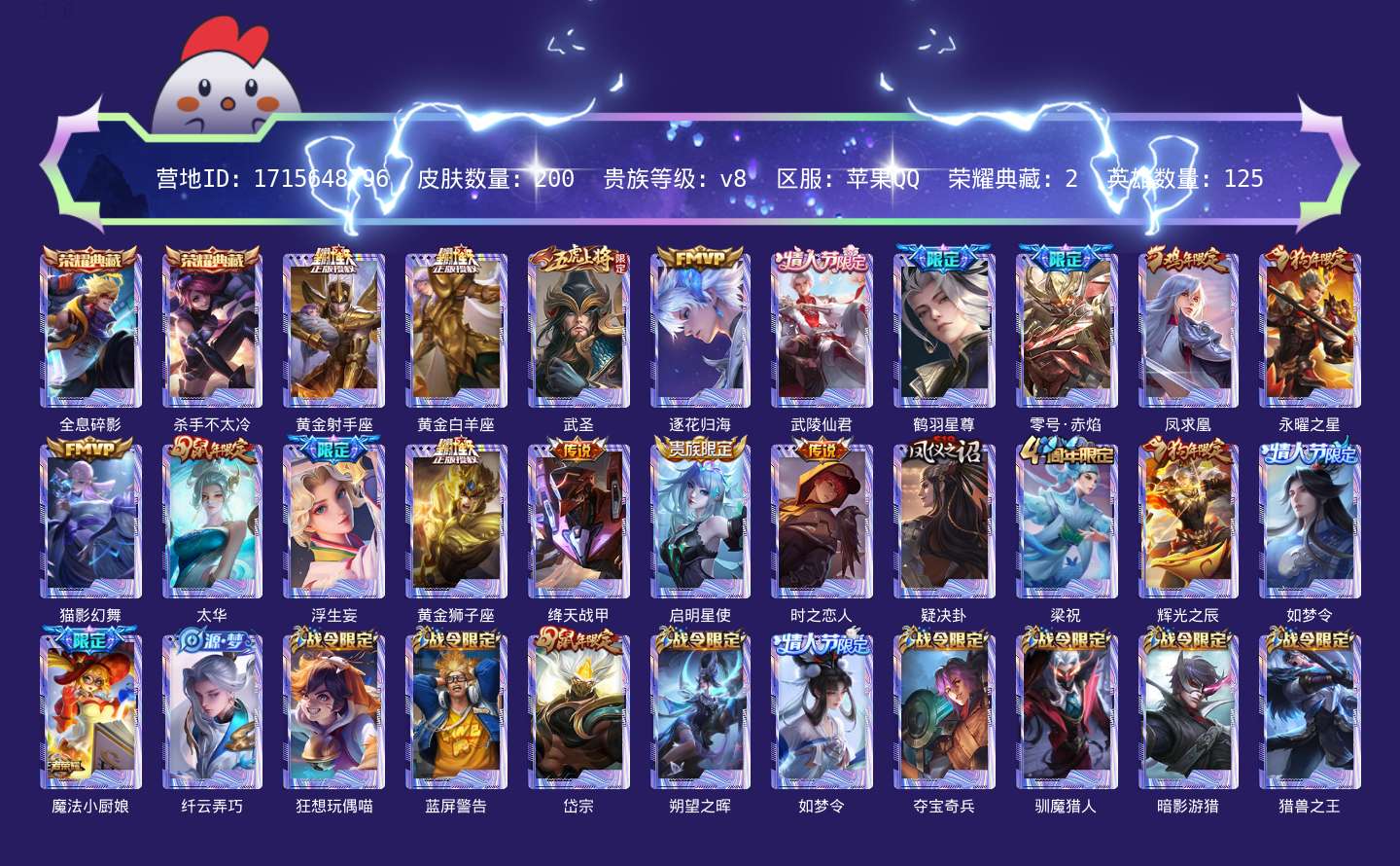 贵族等级:v8皮肤数:200生肖限定8 传说品质16 情人节限定5 荣耀典藏2 英雄数:125