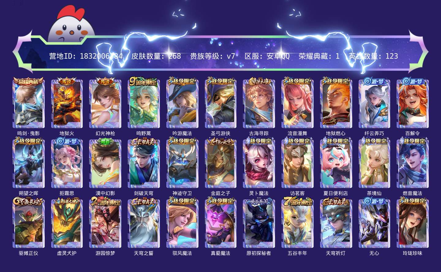 贵族等级:v7皮肤数:268传说品质3 荣耀典藏1 英雄数:123