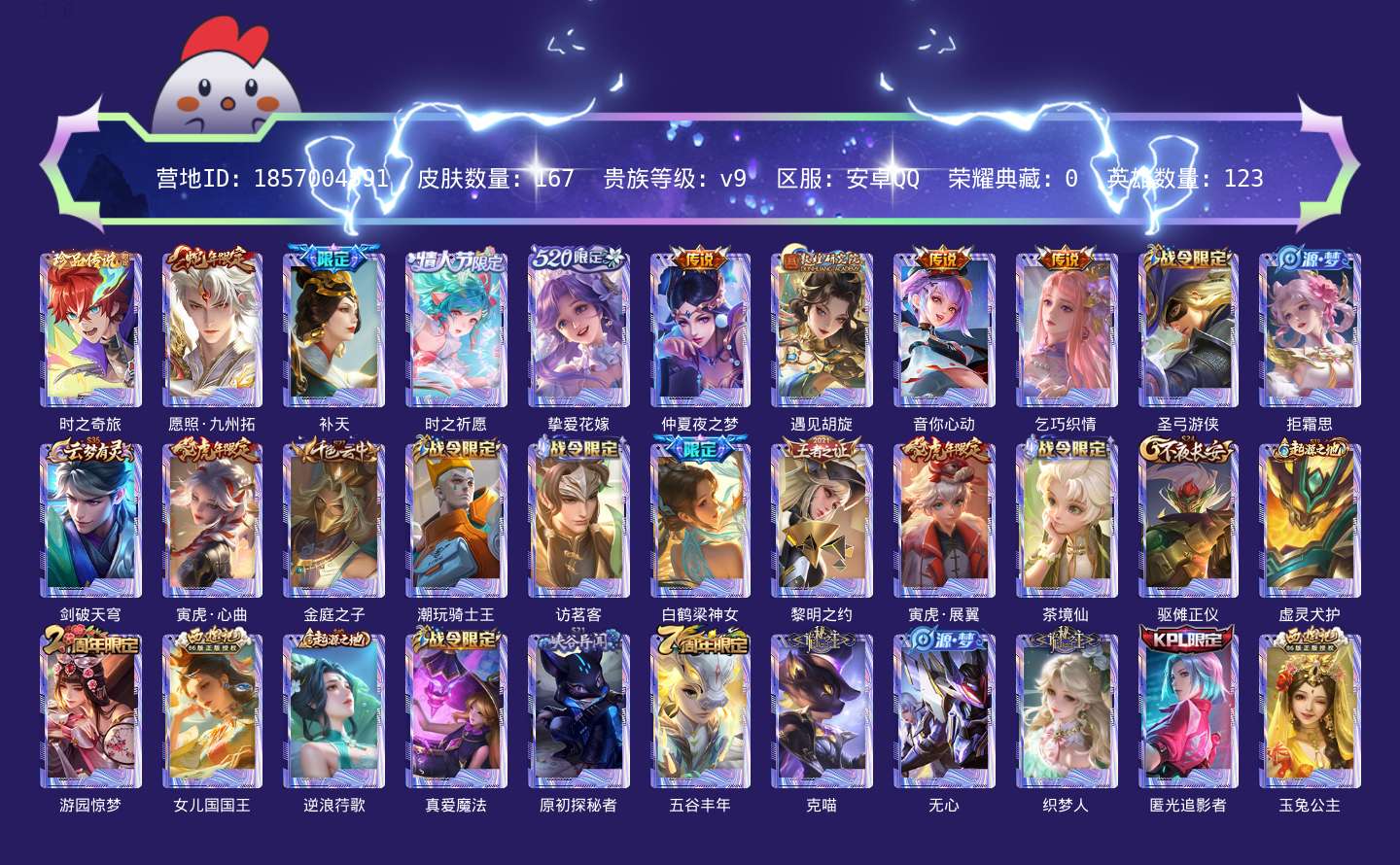 贵族等级:v9皮肤数:167传说品质8 生肖限定3 情人节限定1 珍品传说1 英雄数:123