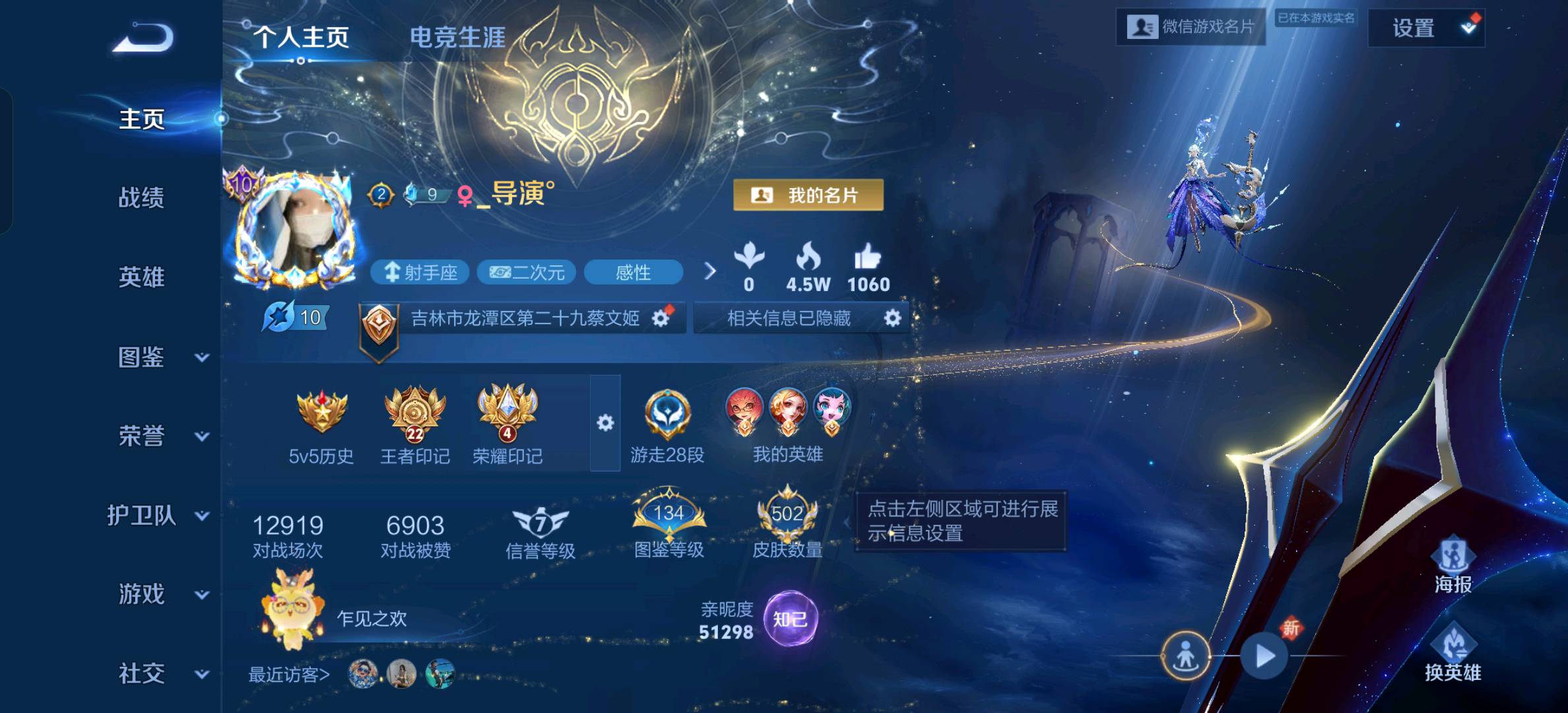 贵族等级:无双v10皮肤数:503生肖限定20 传说品质58 珍品传说6 情人节限定9 无双8 荣耀典藏4 英雄数:126