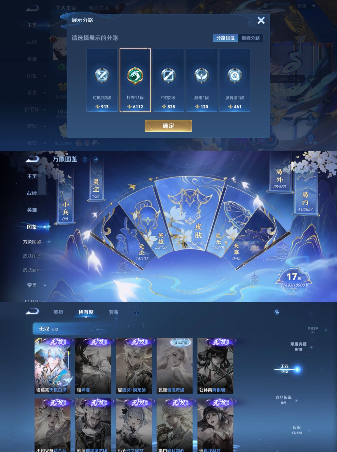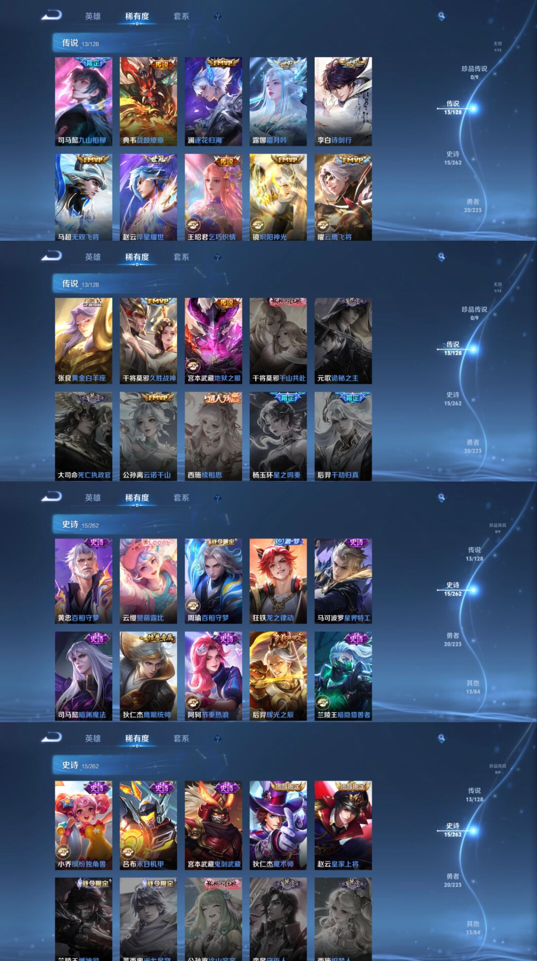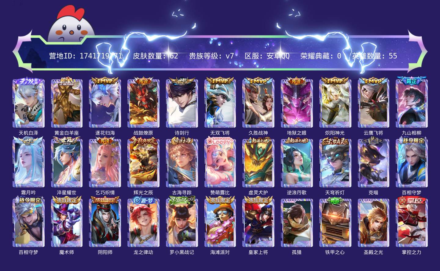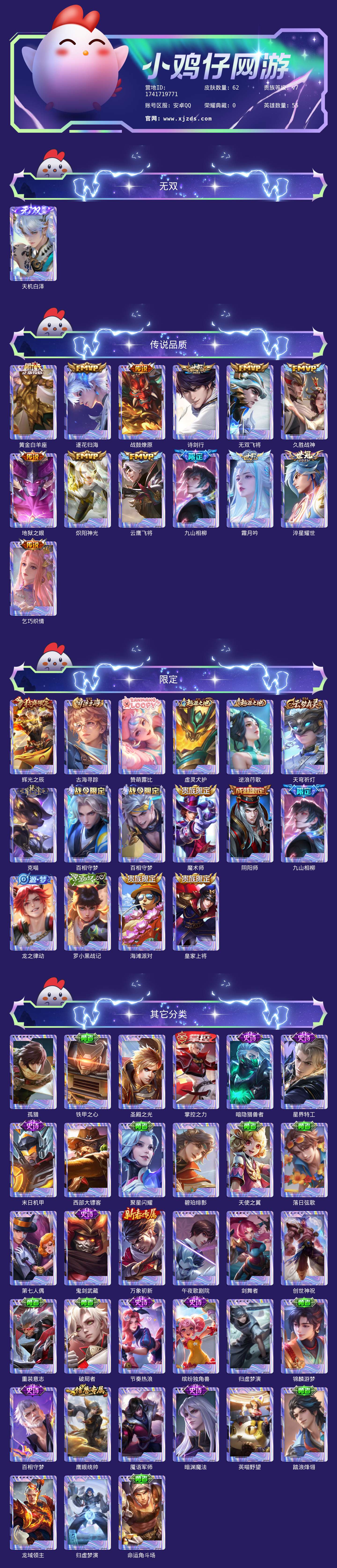 贵族等级:v7皮肤数:62生肖限定1 传说品质13 无双1 英雄数:55