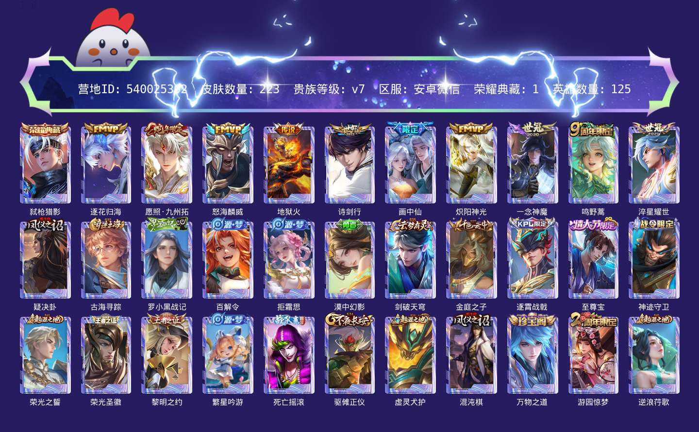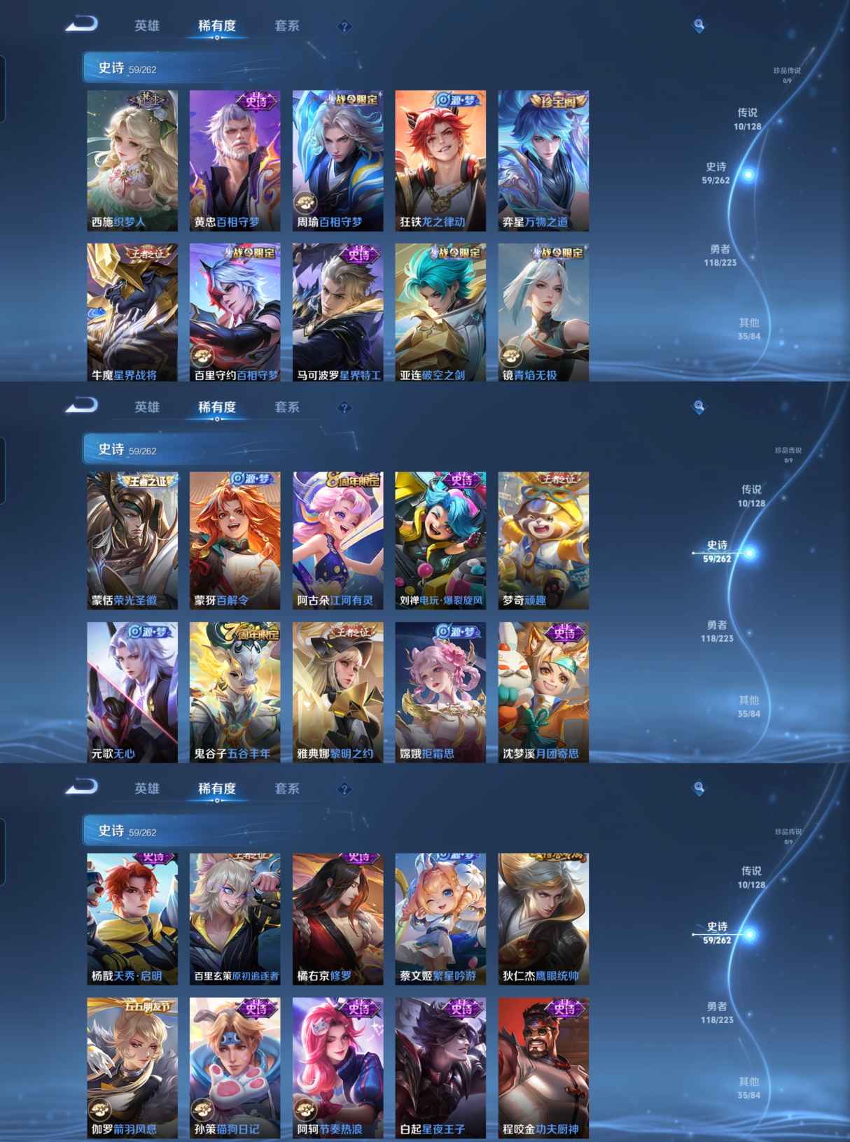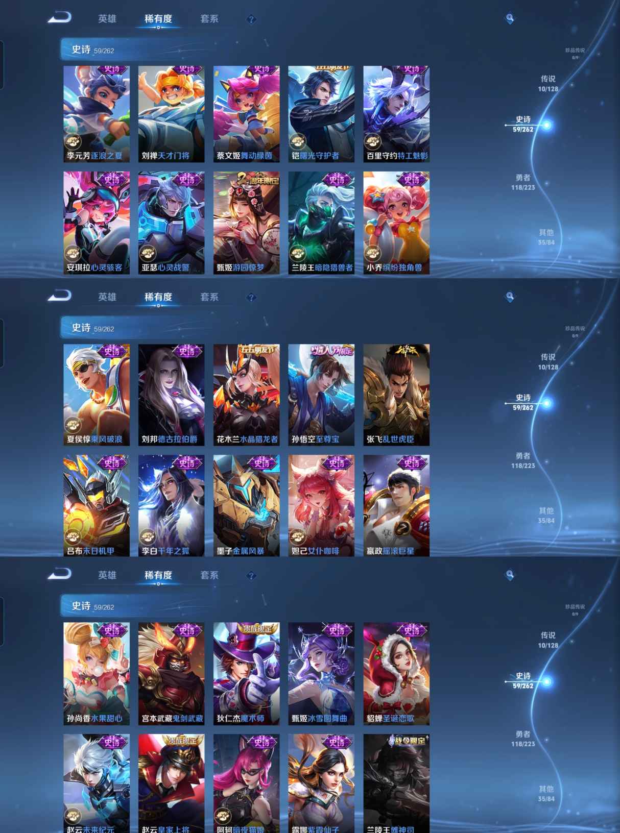 贵族等级:v7皮肤数:223传说品质10 生肖限定1 情人节限定1 荣耀典藏1 英雄数:125