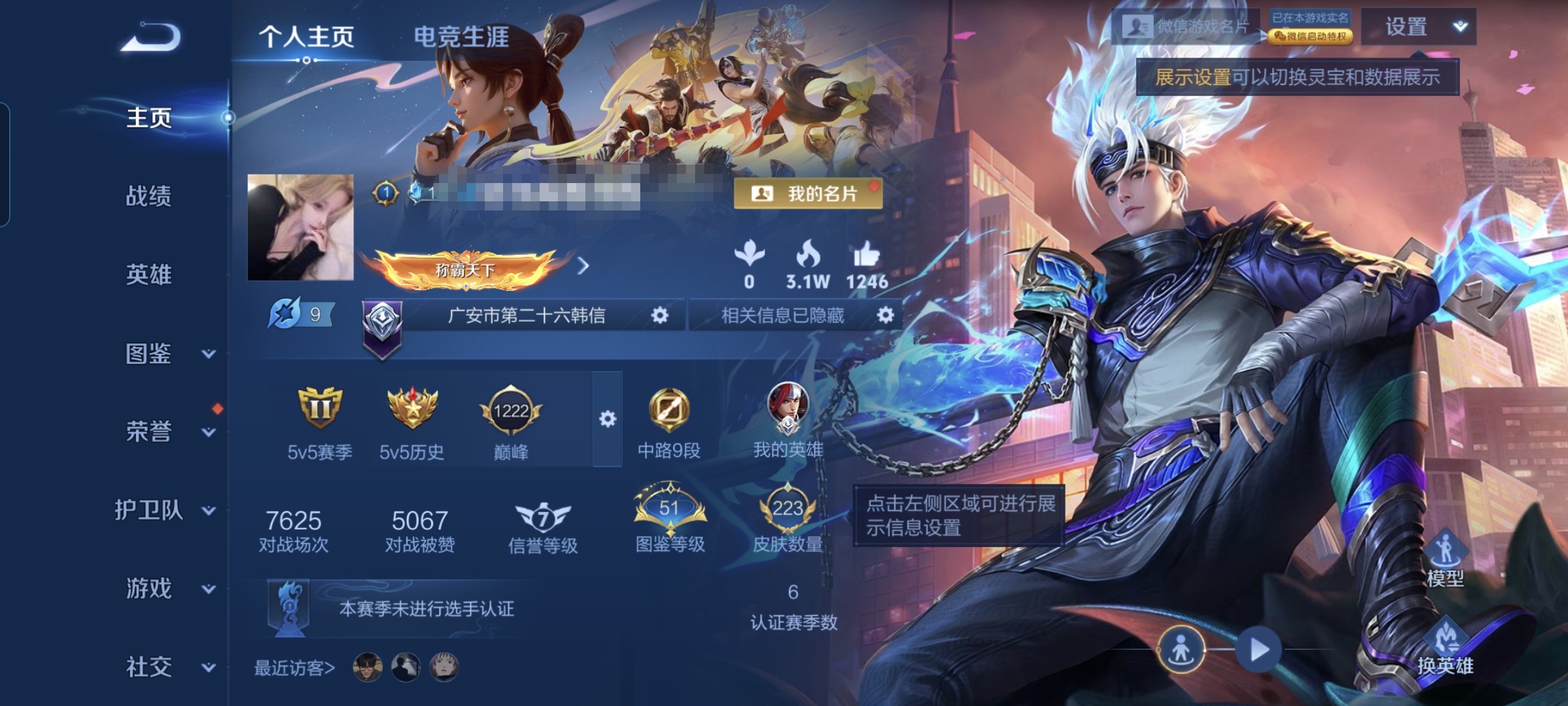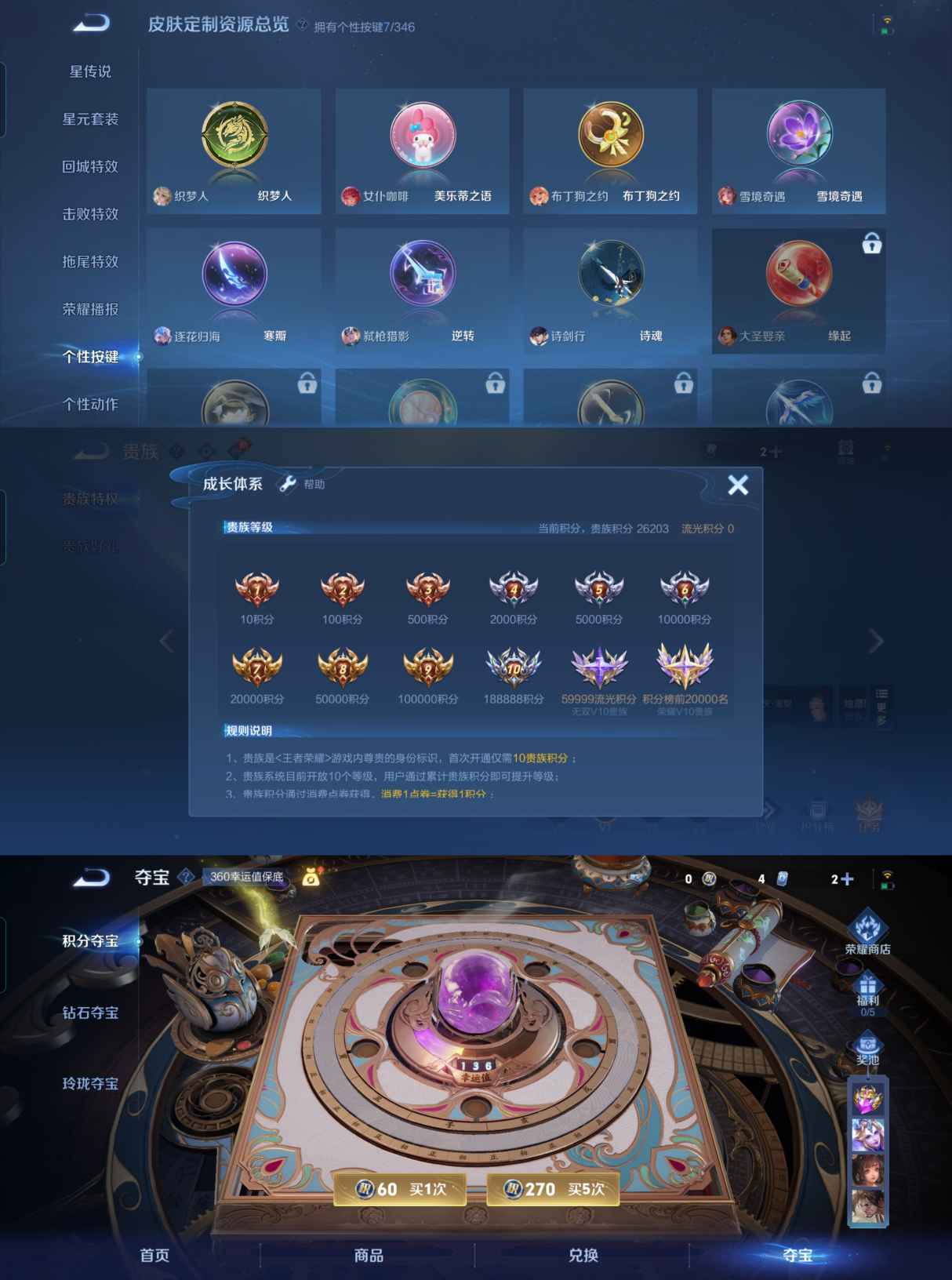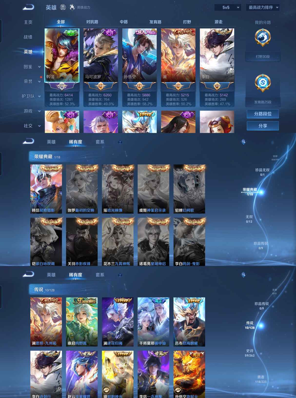 贵族等级:v7皮肤数:223传说品质10 生肖限定1 情人节限定1 荣耀典藏1 英雄数:125