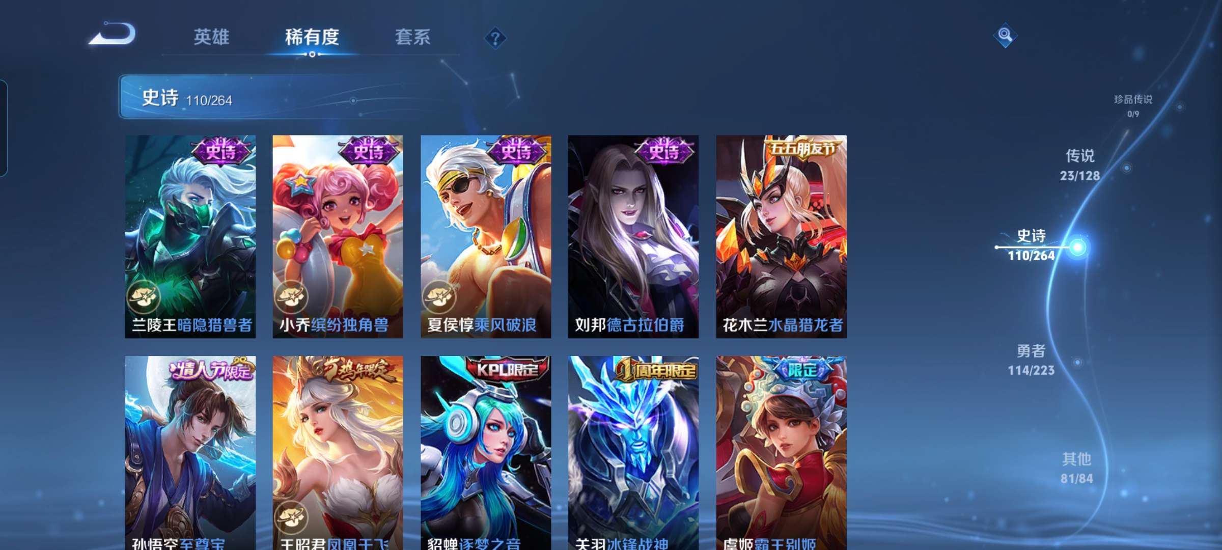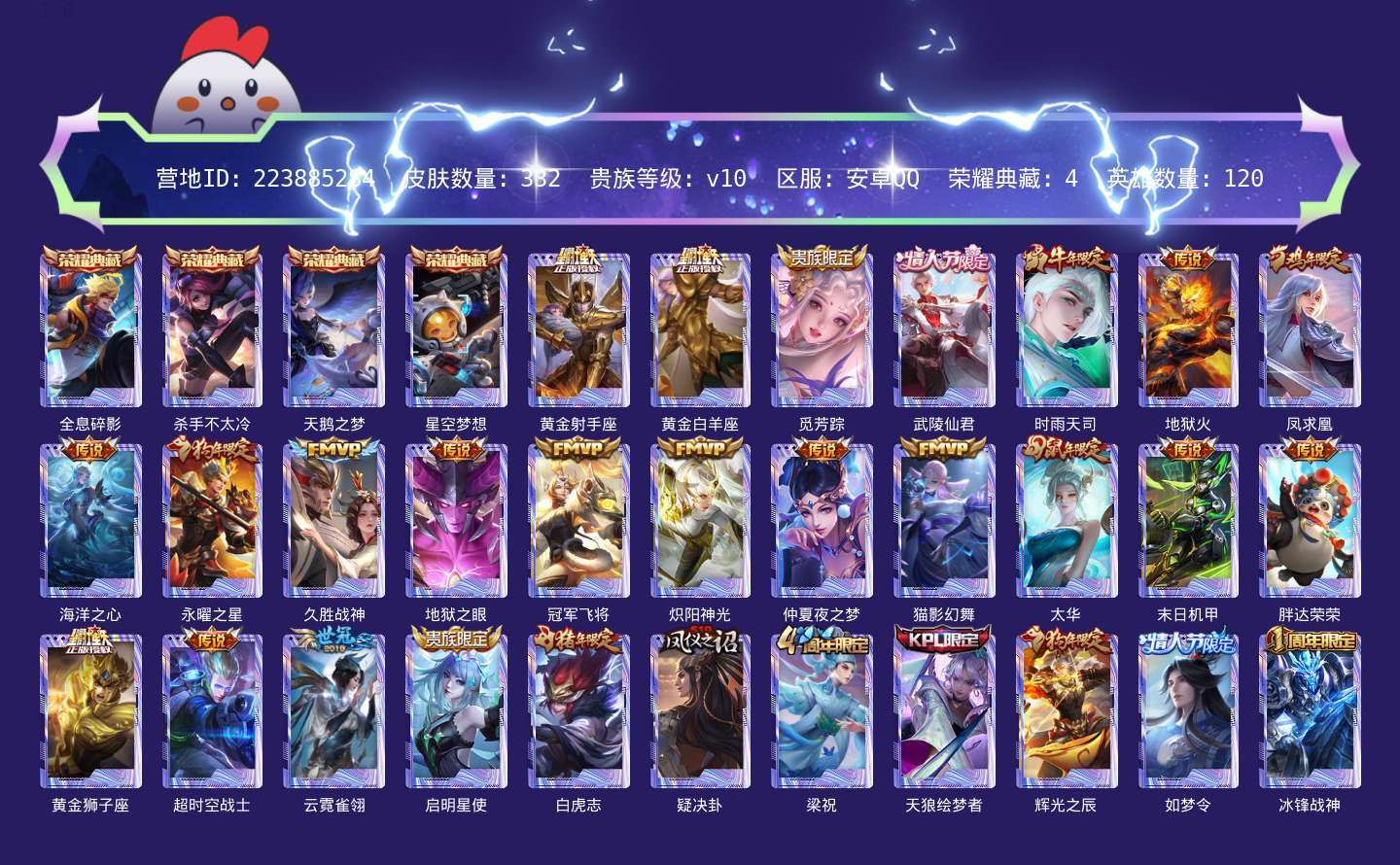 贵族等级:v10皮肤数:332生肖限定16 传说品质23 情人节限定7 荣耀典藏4 英雄数:120