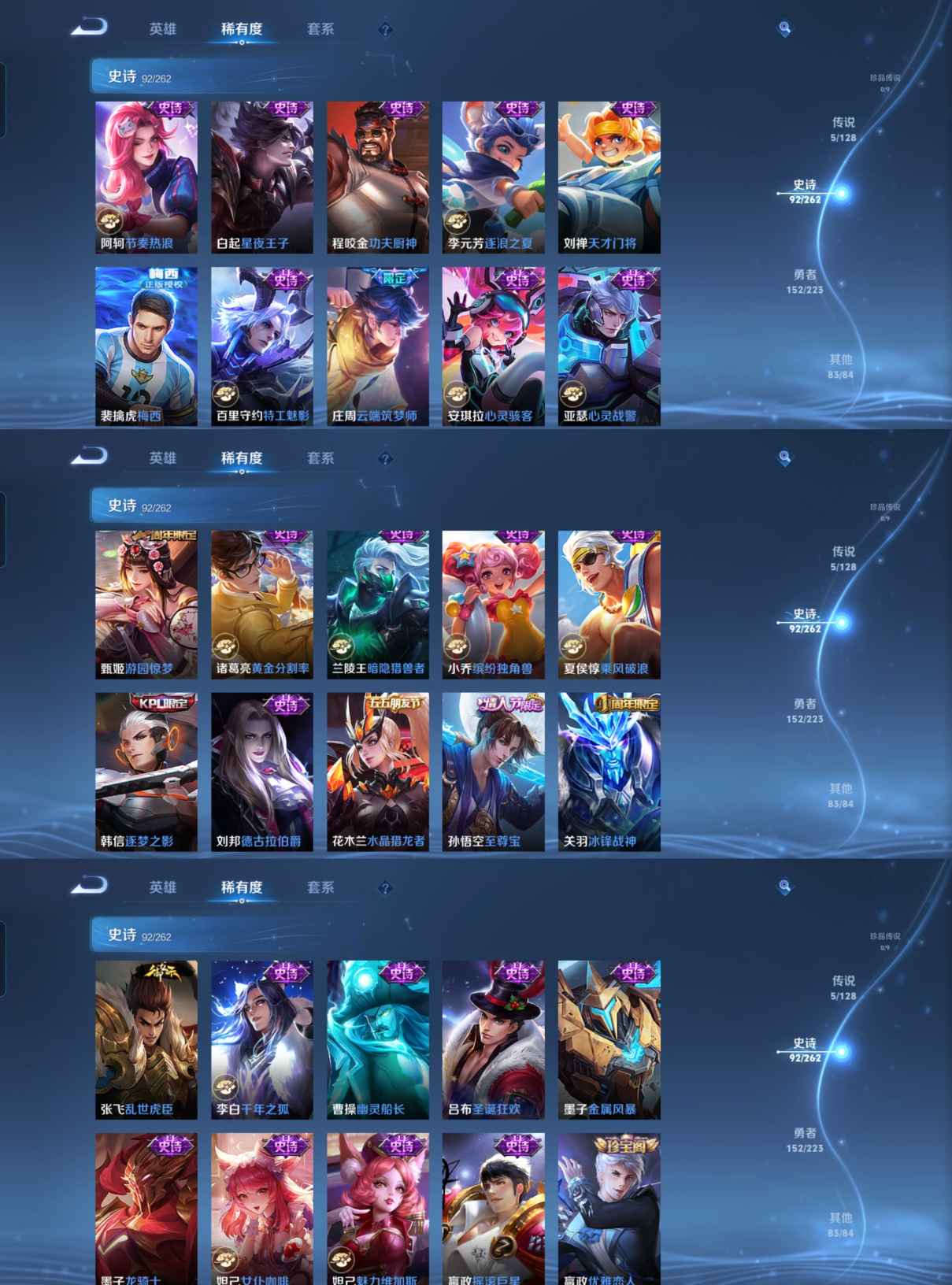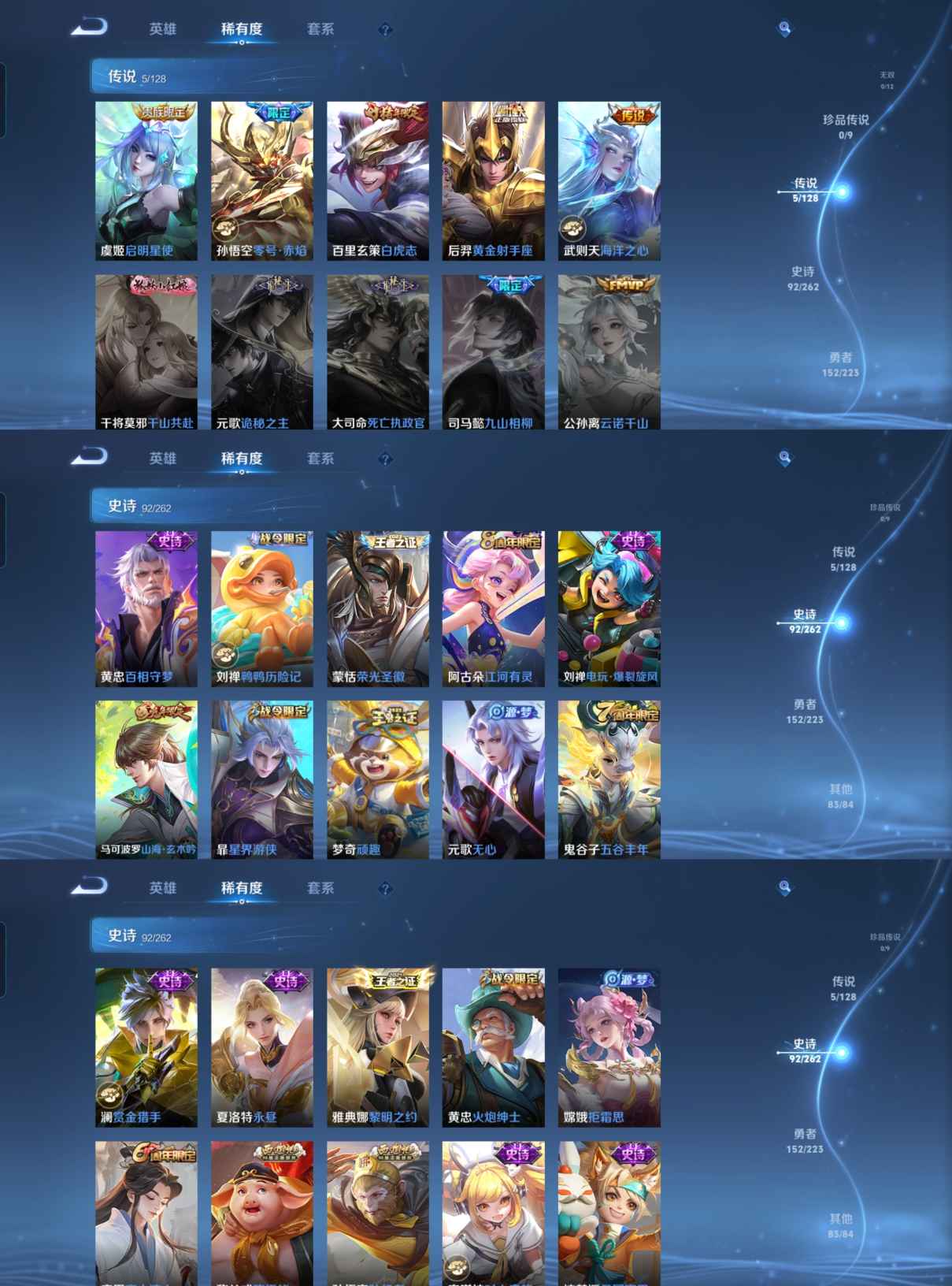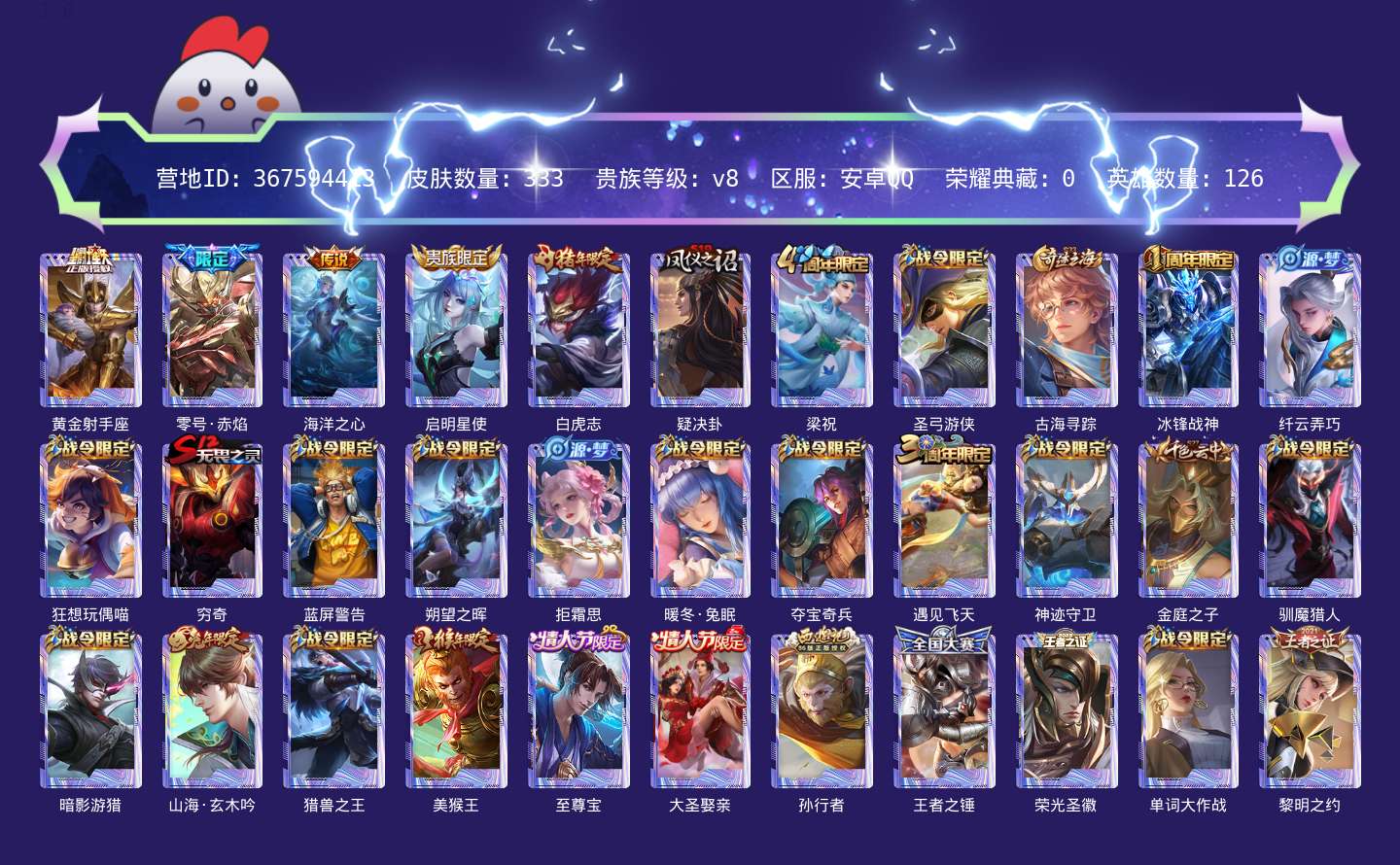 贵族等级:v8皮肤数:333传说品质5 生肖限定6 情人节限定3 英雄数:126