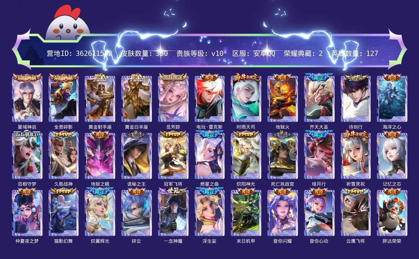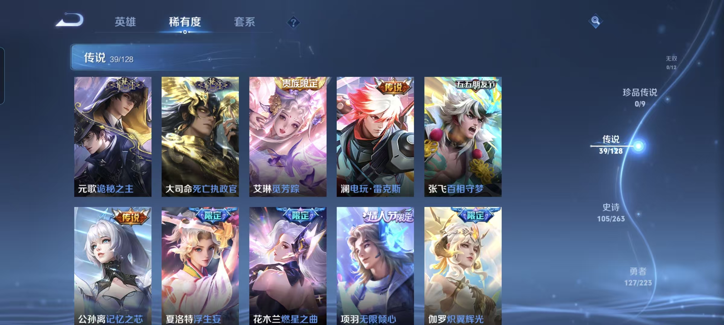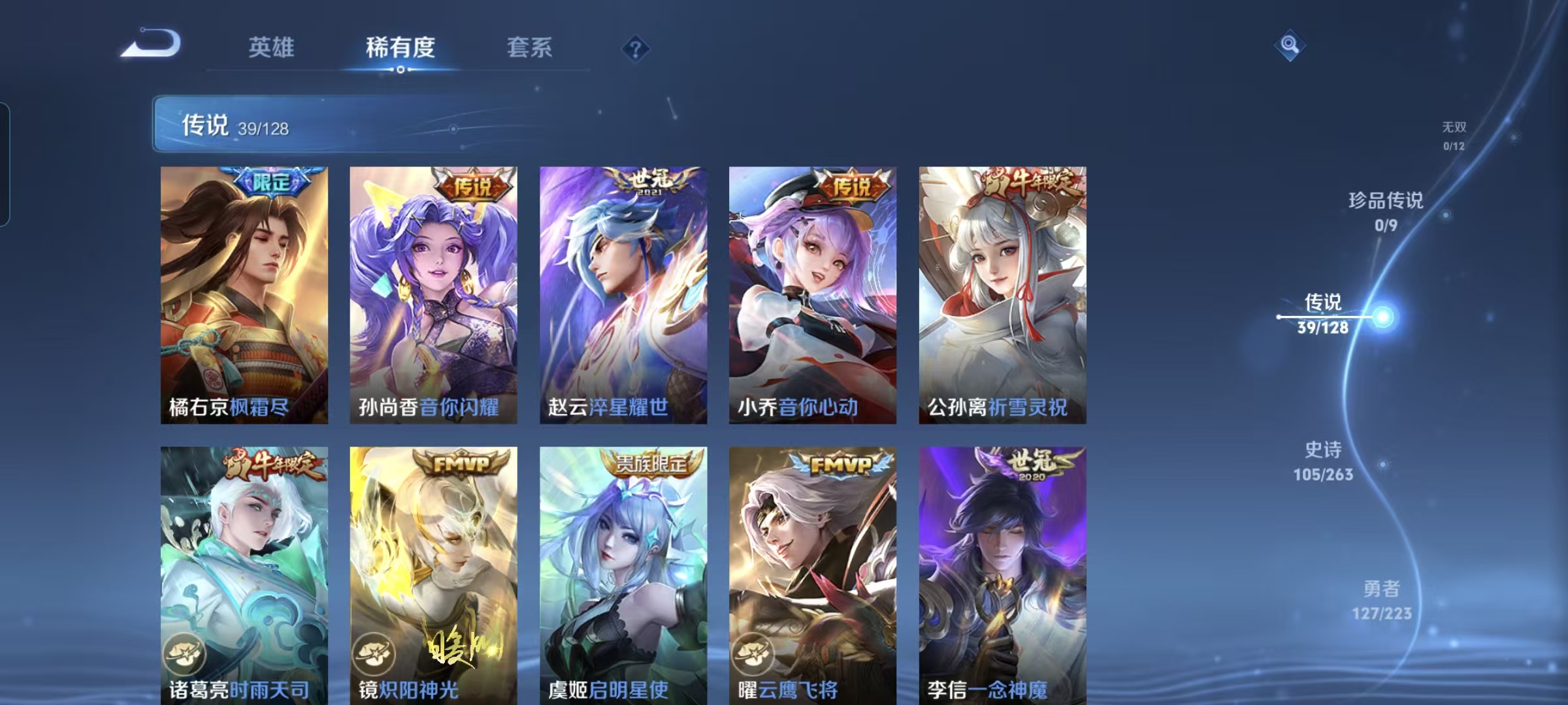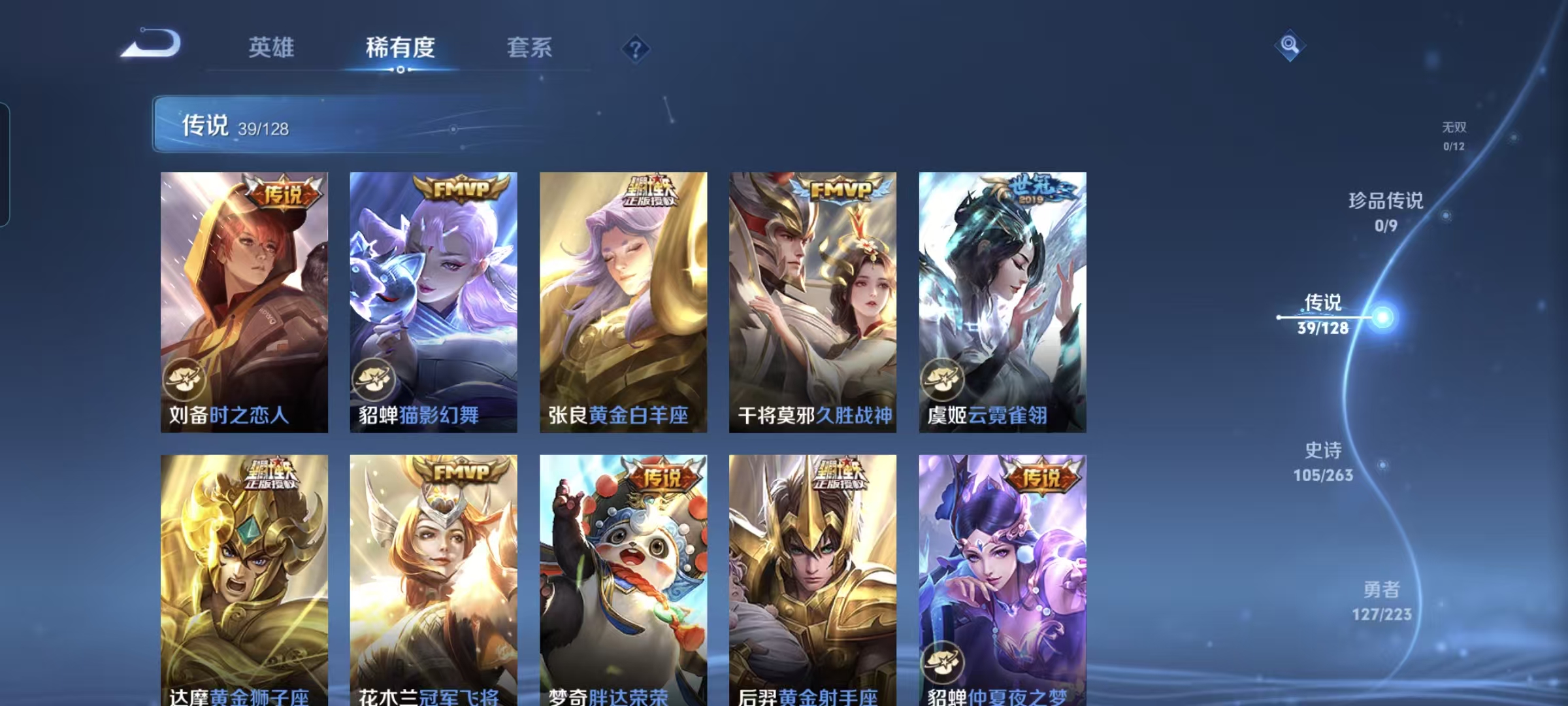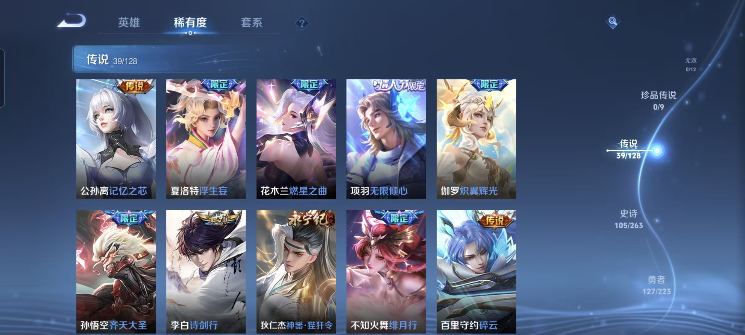 传说品质_后羿_黄金射手座传说品质_张良_黄金白羊座传说品质_艾琳_觅芳踪传说品质_澜_电玩·雷克斯传说品质_诸葛亮_时雨天司传说品质_孙悟空_地狱火传说品质_孙悟空_齐天大圣传说品质_李白_诗剑行传说品质_武则天_海洋之心传说品质_张飞_百相守梦传说品质_干将莫邪_久胜战神传说品质_宫本武藏_地狱之眼传说品质_元歌_诡秘之主传说品质_花木兰_冠军飞将传说品质_花木兰_燃星之曲传说品质_镜_炽阳神光传说品质_大司命_死亡执政官传说品质_不知火舞_绯月行传说品质_公孙离_祈雪灵祝传说品质_公孙离_记忆之芯传说品质_貂蝉_仲夏夜之梦传说品质_貂蝉_猫影幻舞传说品质_伽罗_炽翼辉光传说品质_百里守约_碎云传说品质_李信_一念神魔传说品质_夏洛特_浮生妄传说品质_孙尚香_末日机甲传说品质_孙尚香_音你闪耀传说品质_小乔_音你心动传说品质_曜_云鹰飞将传说品质_梦奇_胖达荣荣传说品质_达摩_黄金狮子座传说品质_狄仁杰_神器·狴犴令传说品质_虞姬_云霓雀翎传说品质_虞姬_启明星使传说品质_刘备_时之恋人传说品质_橘右京_枫霜尽传说品质_项羽_无限倾心传说品质_赵云_淬星耀世