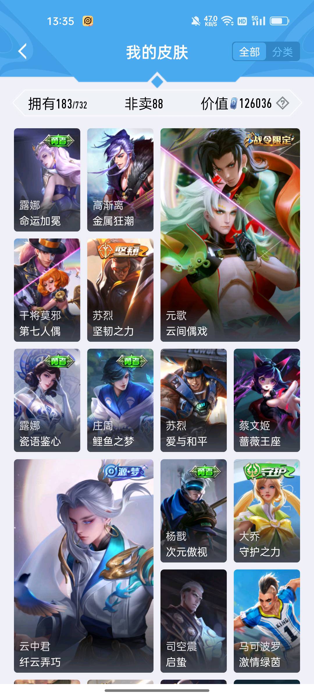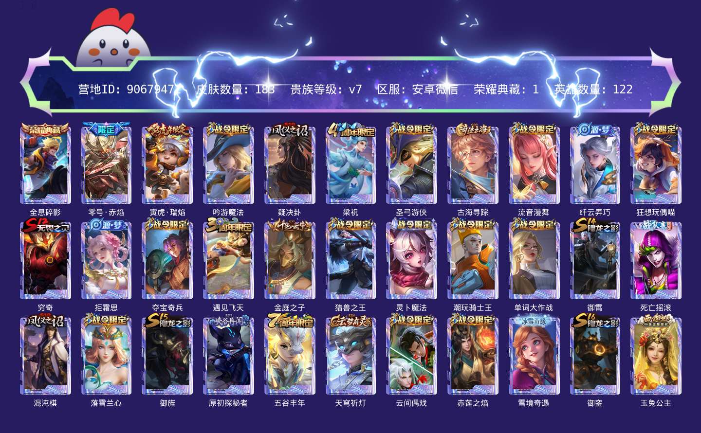 贵族等级:v7皮肤数:183荣耀典藏1 传说品质2 生肖限定2 英雄数:122