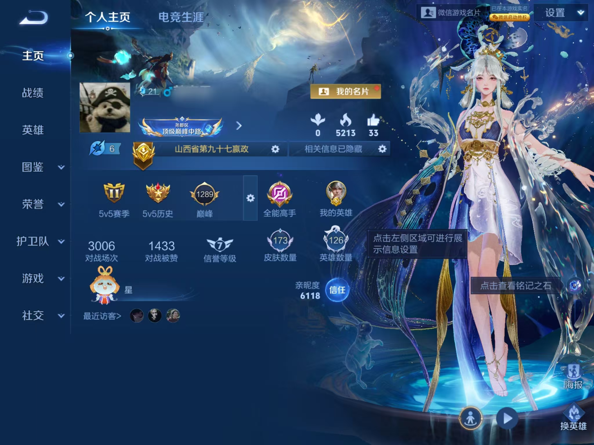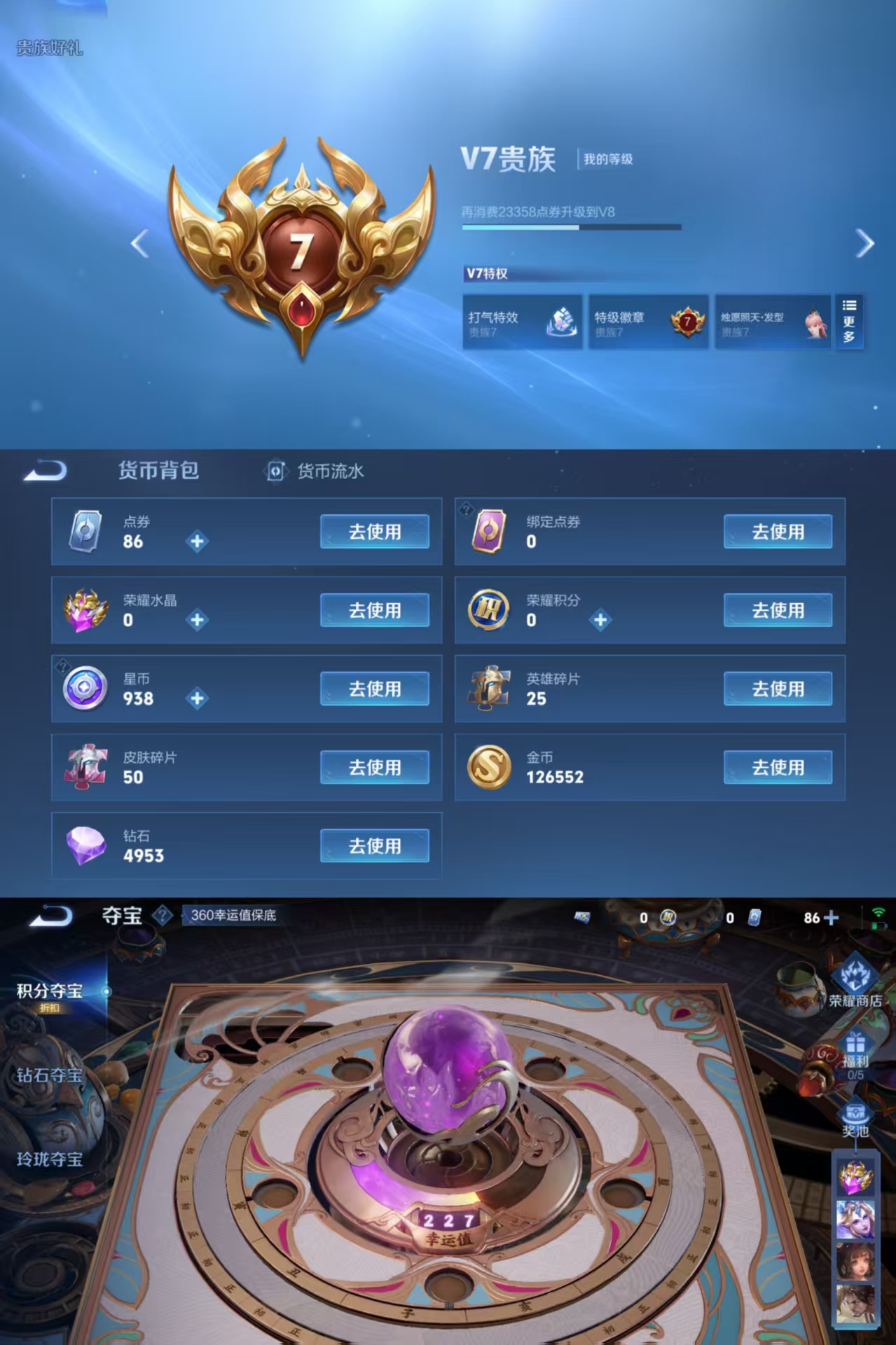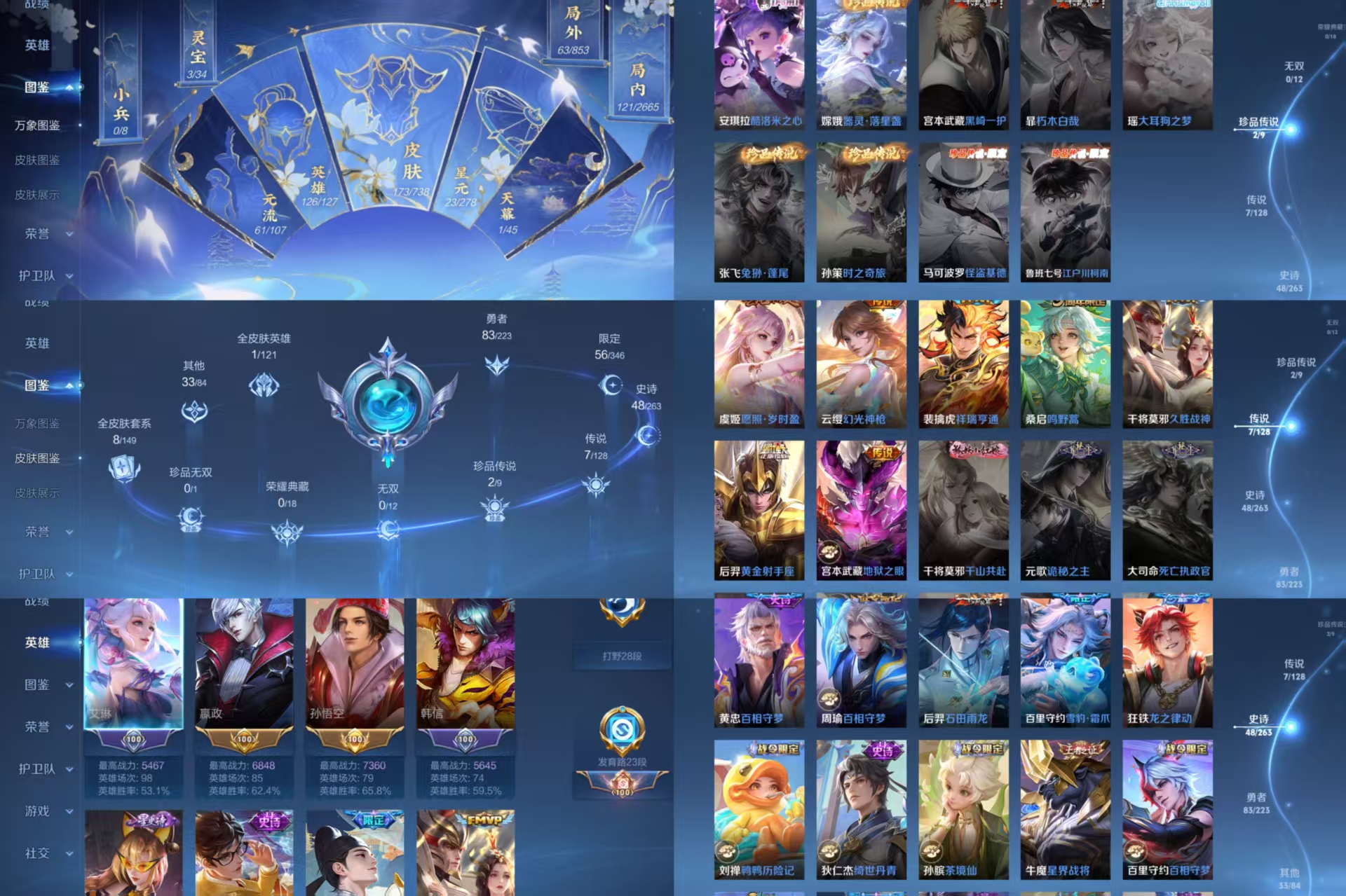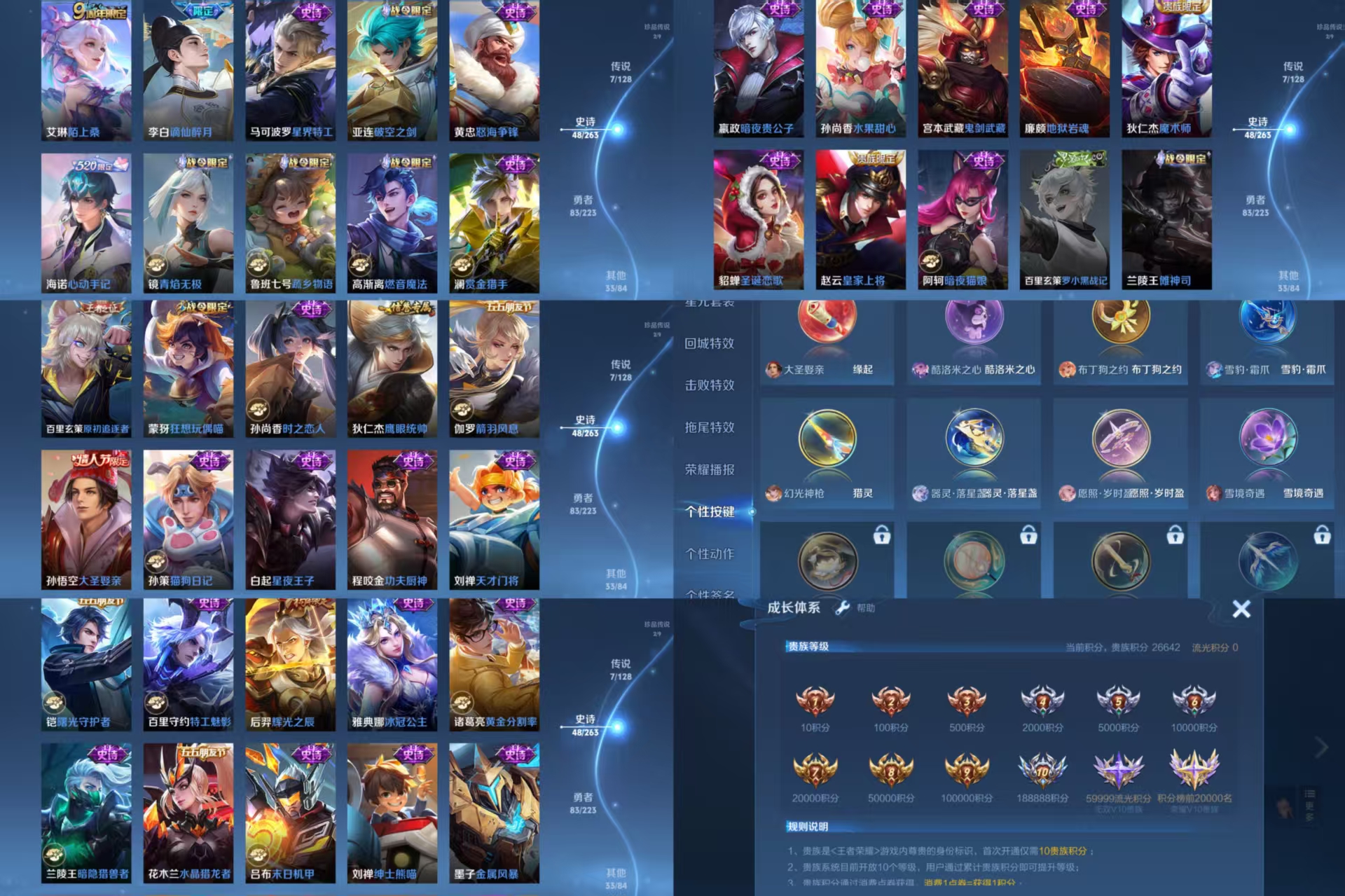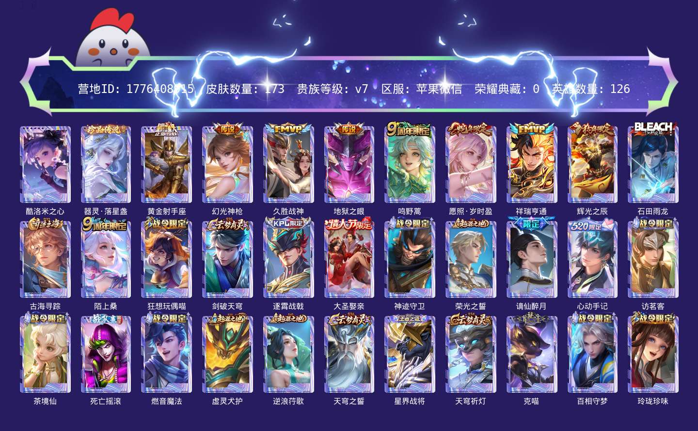 贵族等级:v7皮肤数:173生肖限定2 传说品质7 珍品传说2 情人节限定1 英雄数:126