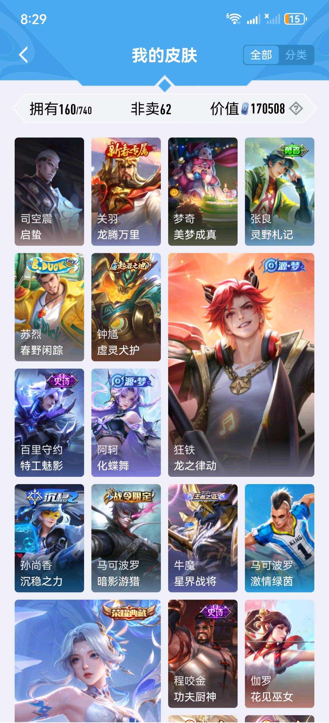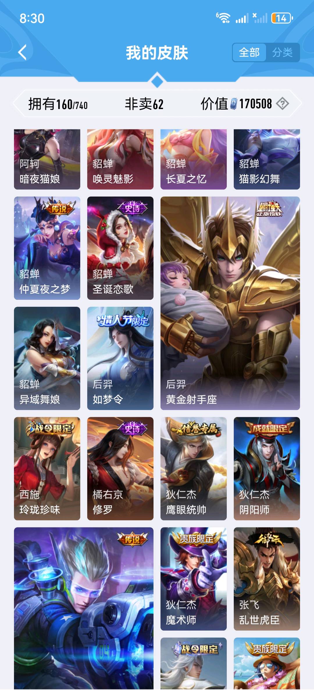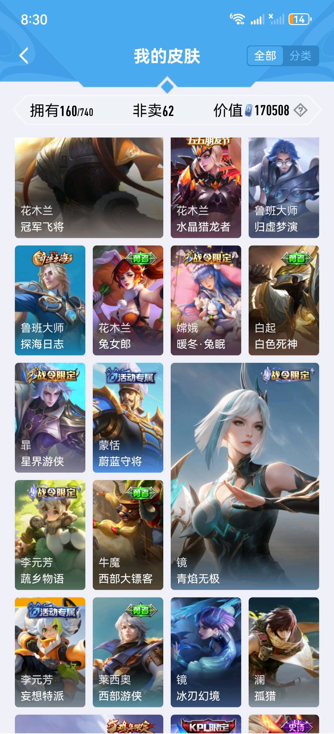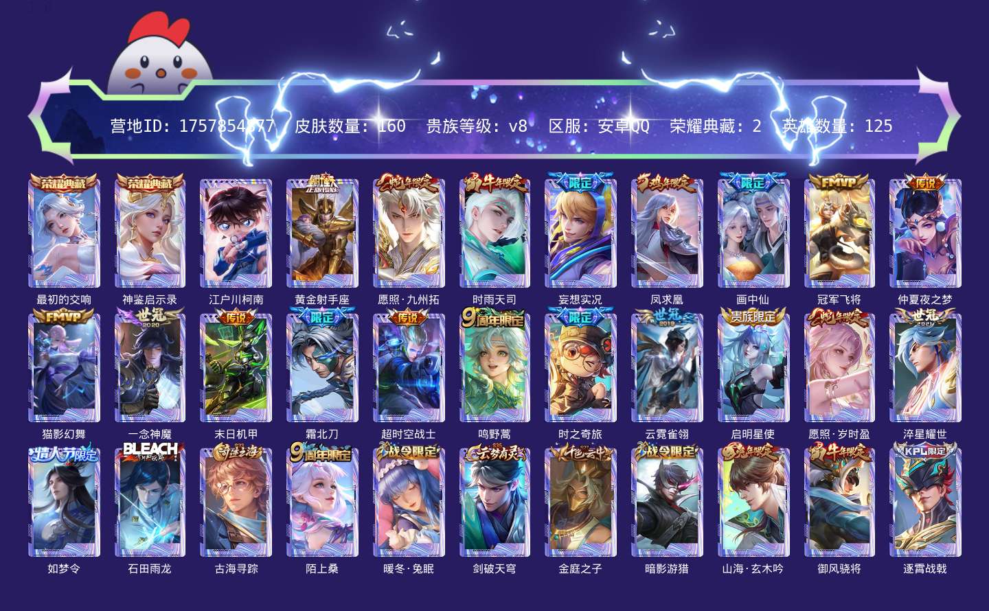 贵族等级:v8皮肤数:160传说品质19 情人节限定2 生肖限定6 荣耀典藏2 珍品传说1 英雄数:125